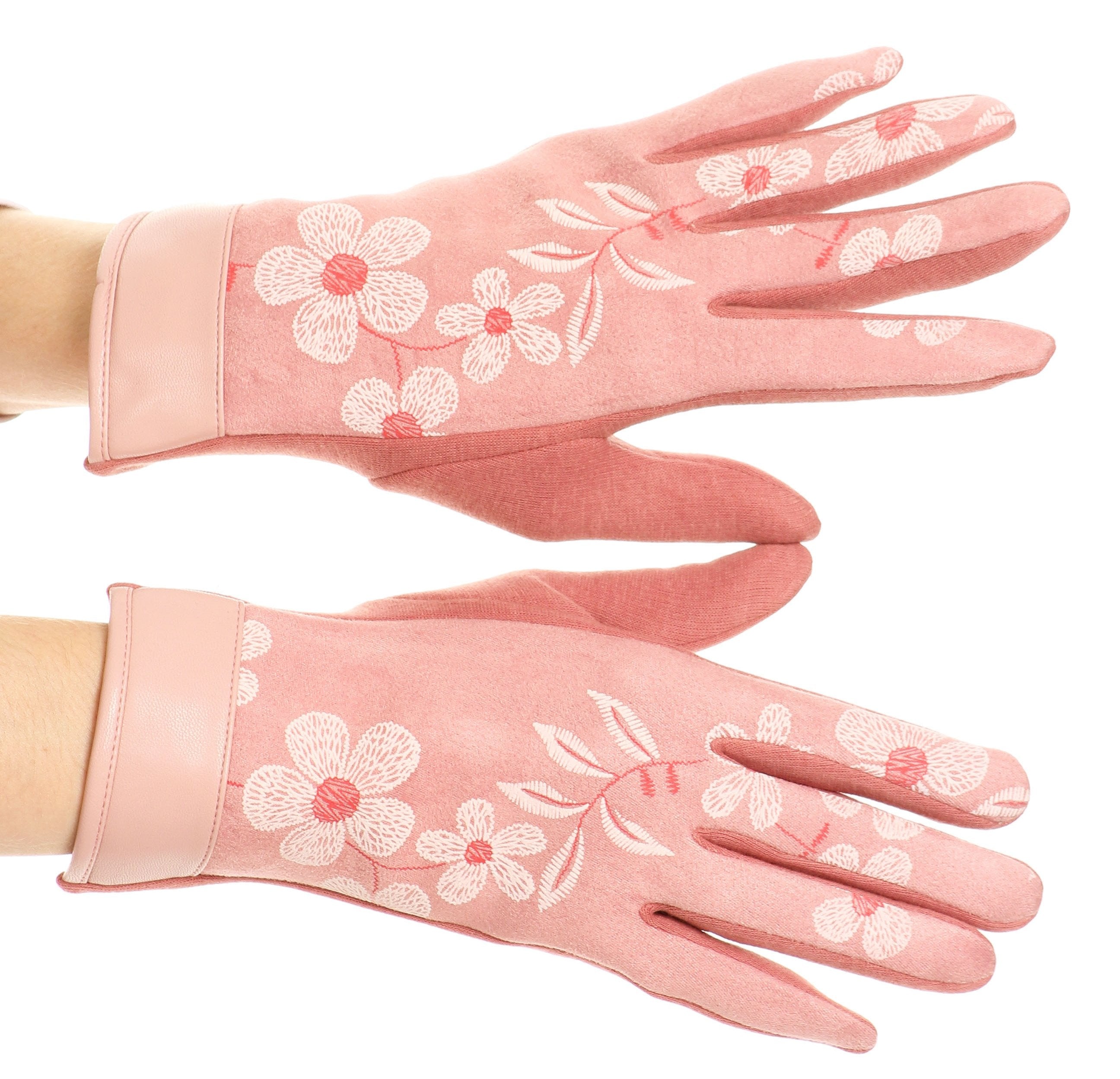 • Style #1799 features a beautiful contrasting burn out velvet floral texture. Fleece lined, small embroidered flower at finger tips for touch screening. These gloves have a small bow and pearl detail at the cuff, minimal and graceful. Style #17100, mostly solid with velvet burn out texture, fleece and soft lamb's ear fur texture lining, small embroidered flower at finger tips for touch screening. Unique and casual. These are the perfect commuting gloves, simple and versatile.