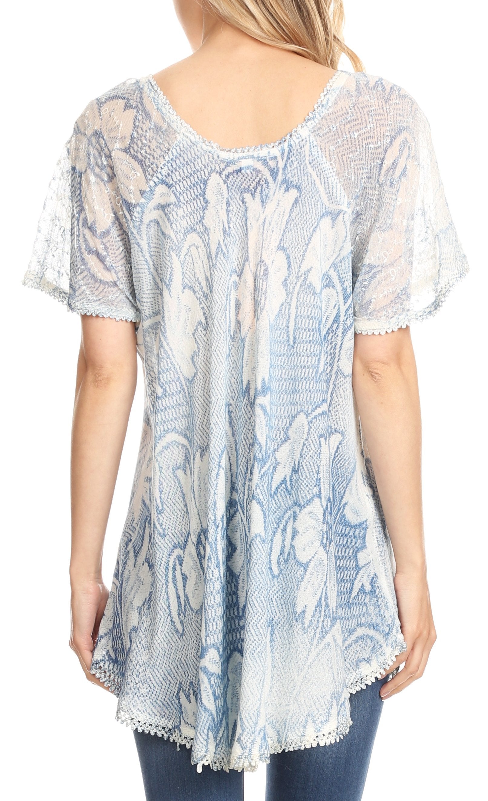 Sakkas Maliky Wide Corset Neck Floral Embroidered Cap Sleeve Blouse Top Shirt