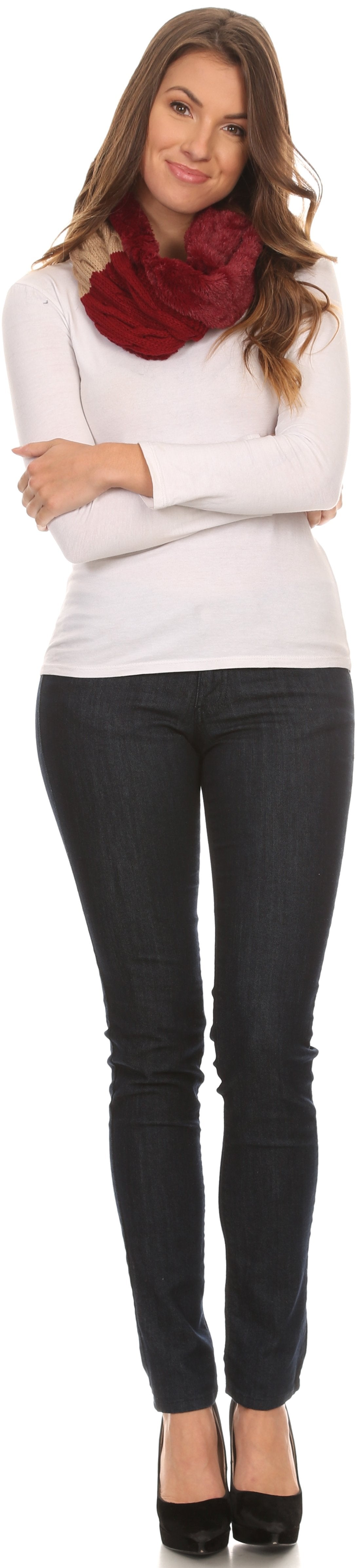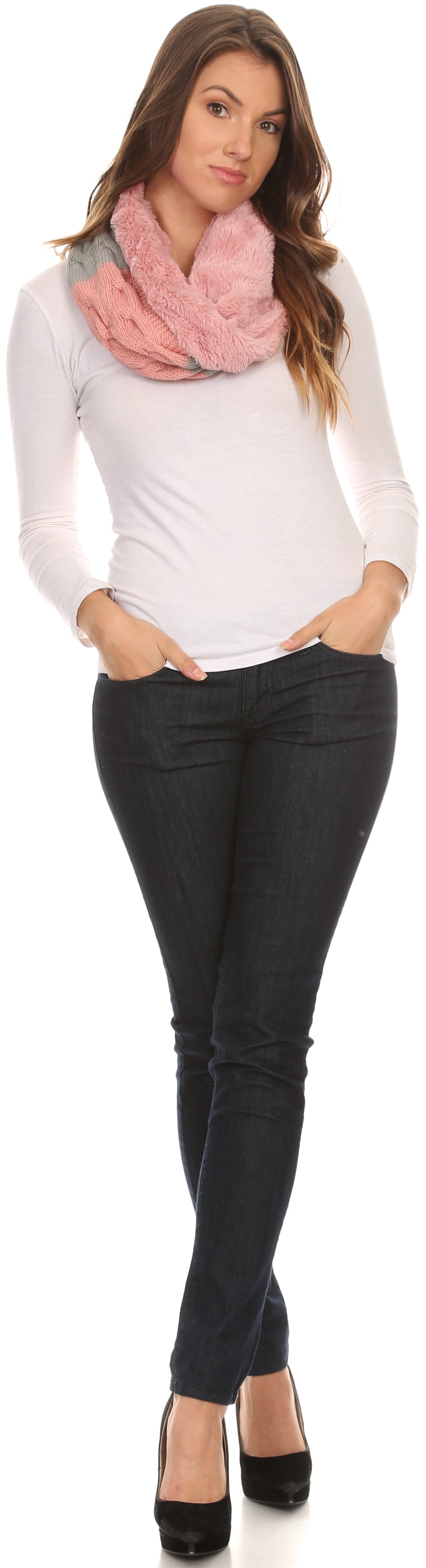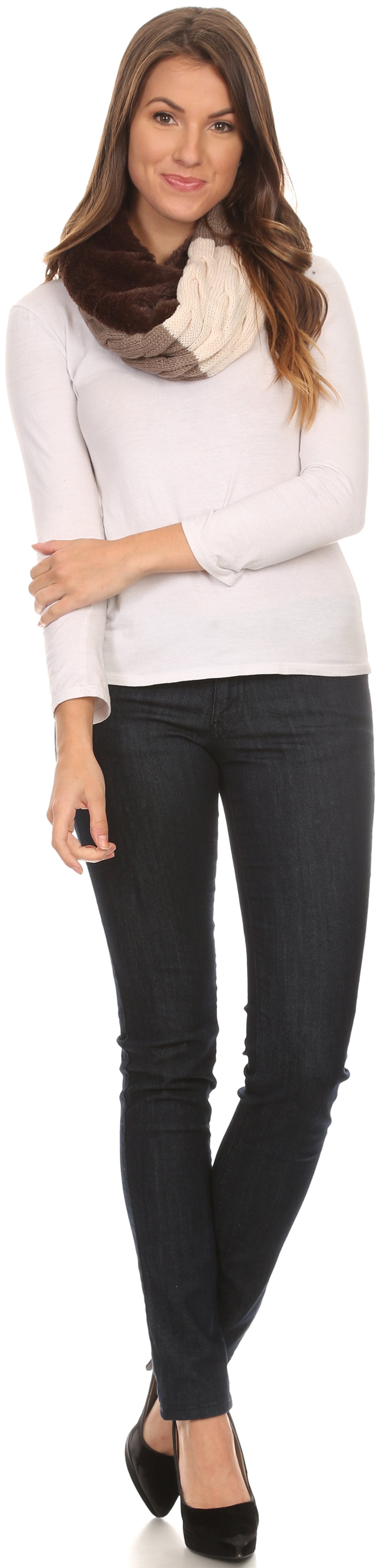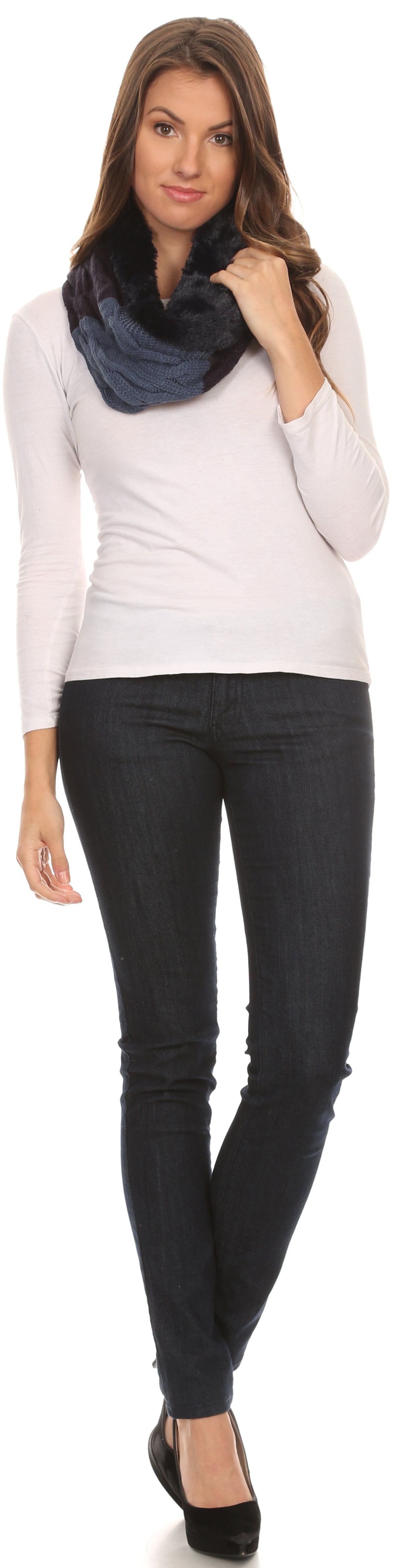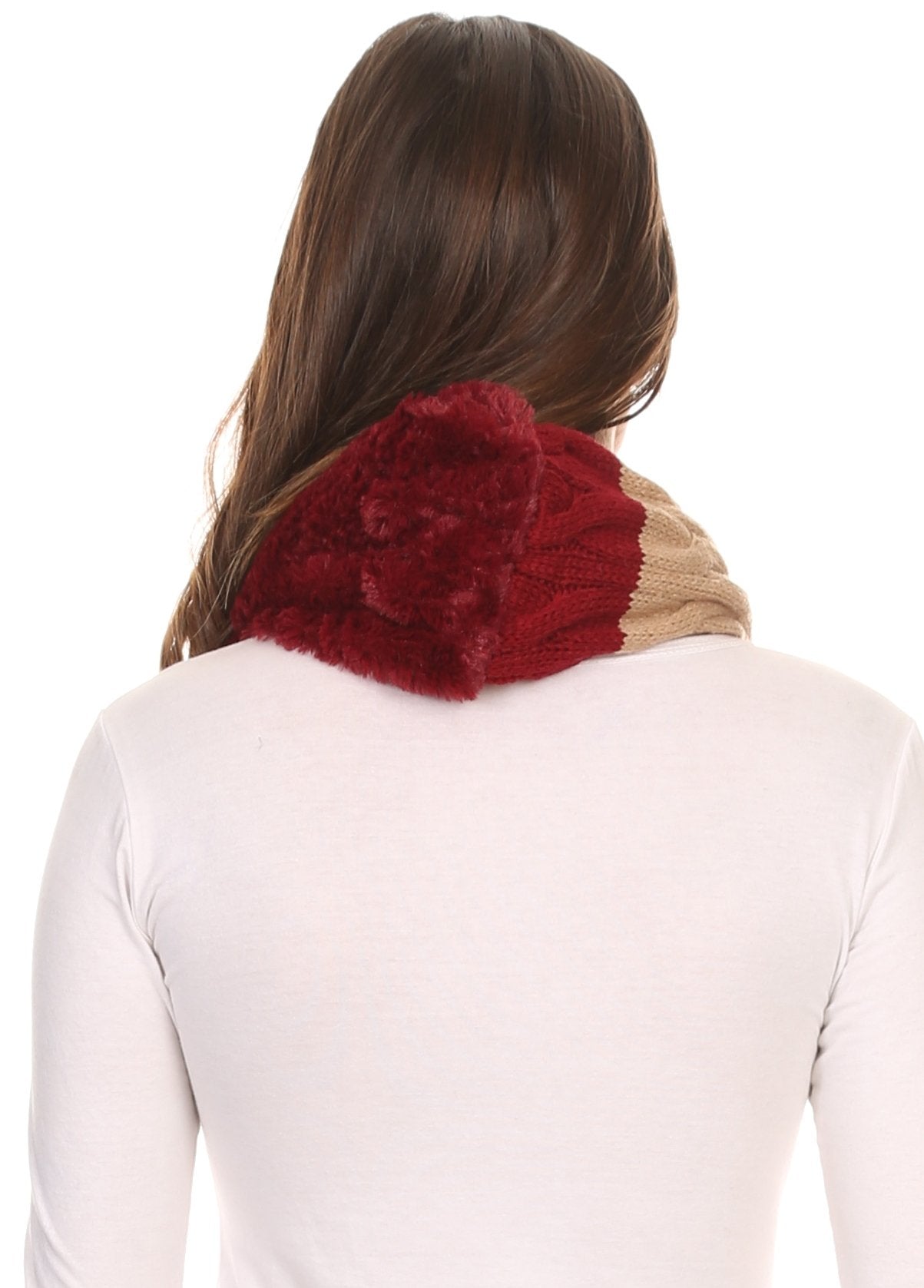 • This infinity scarf features a double sided design. One side is made of a faux fur material, and the other side is a multi colored color blocked pattern on ribbed cable knit. One side of the scarf is sewn wrapped around so that one side will always show both sides of the scarf for an added layer of texture and dimension. Fabric is super soft, comfortable, durable, and high quality.