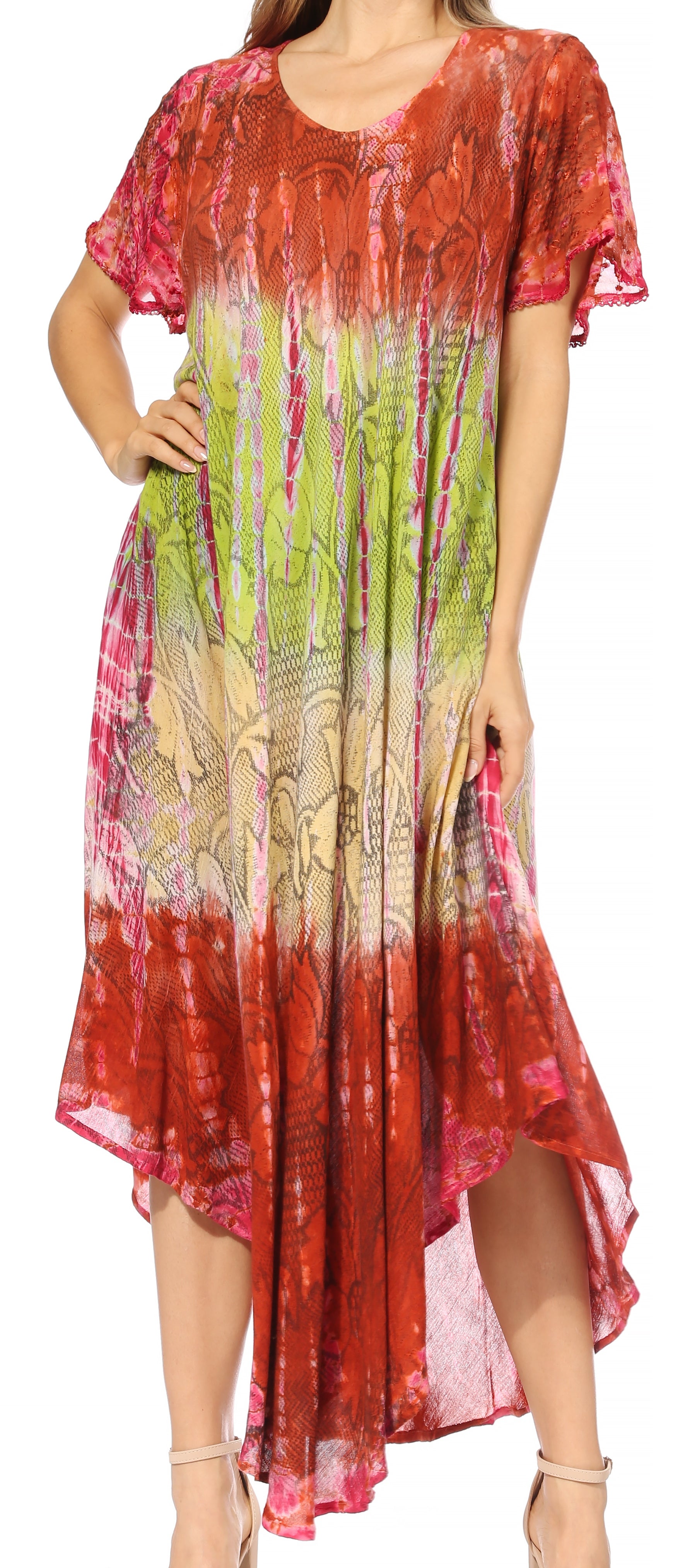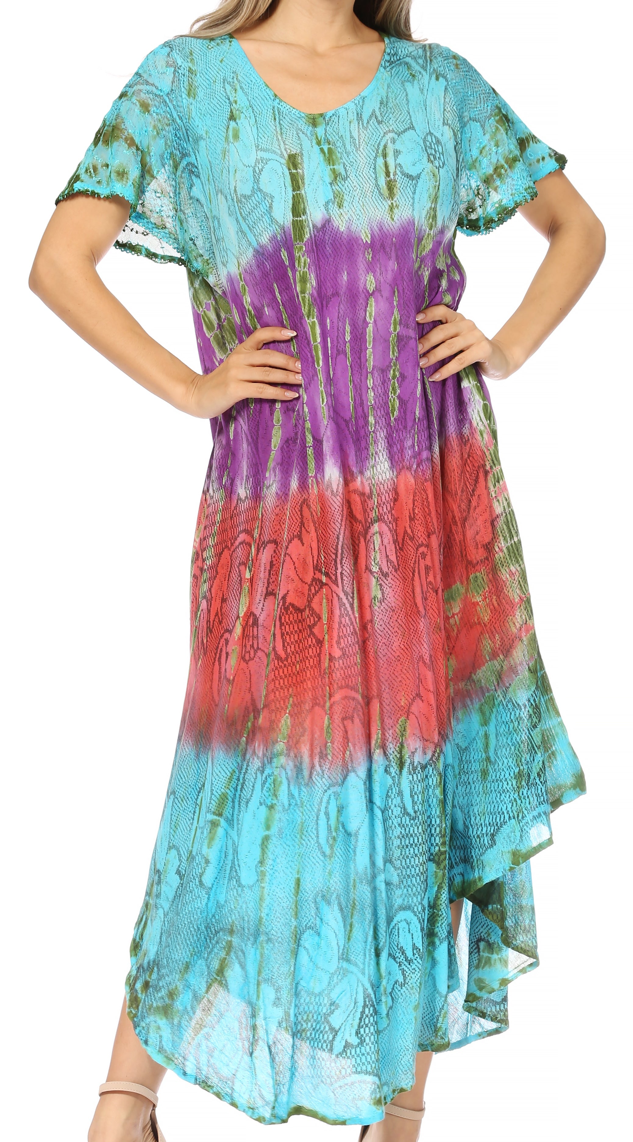 Women's caftan dress features beautiful colors and easy comfortable style.