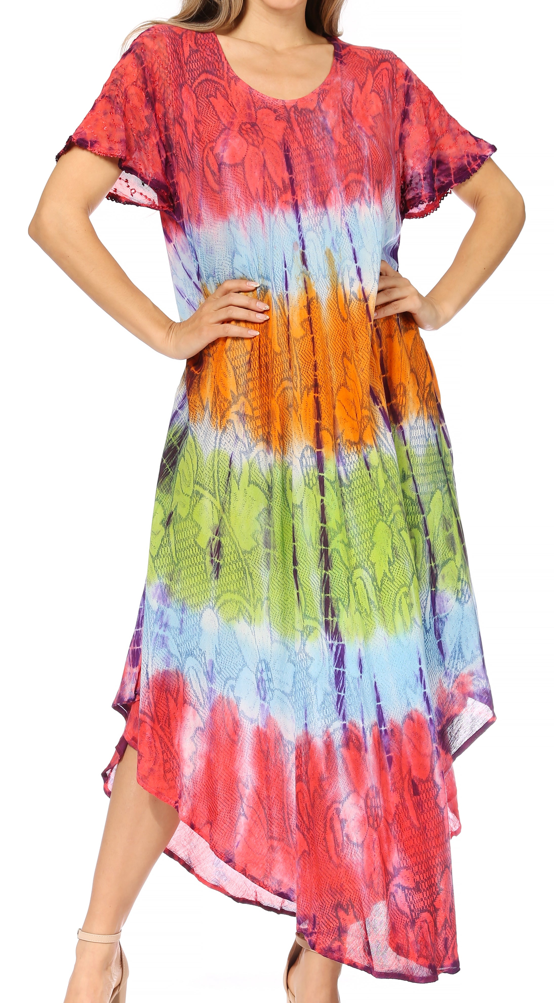• Caftan dress features sheer crepe cap sleeves, relaxed fit and ombre tie dye floral print in multi color shades.
