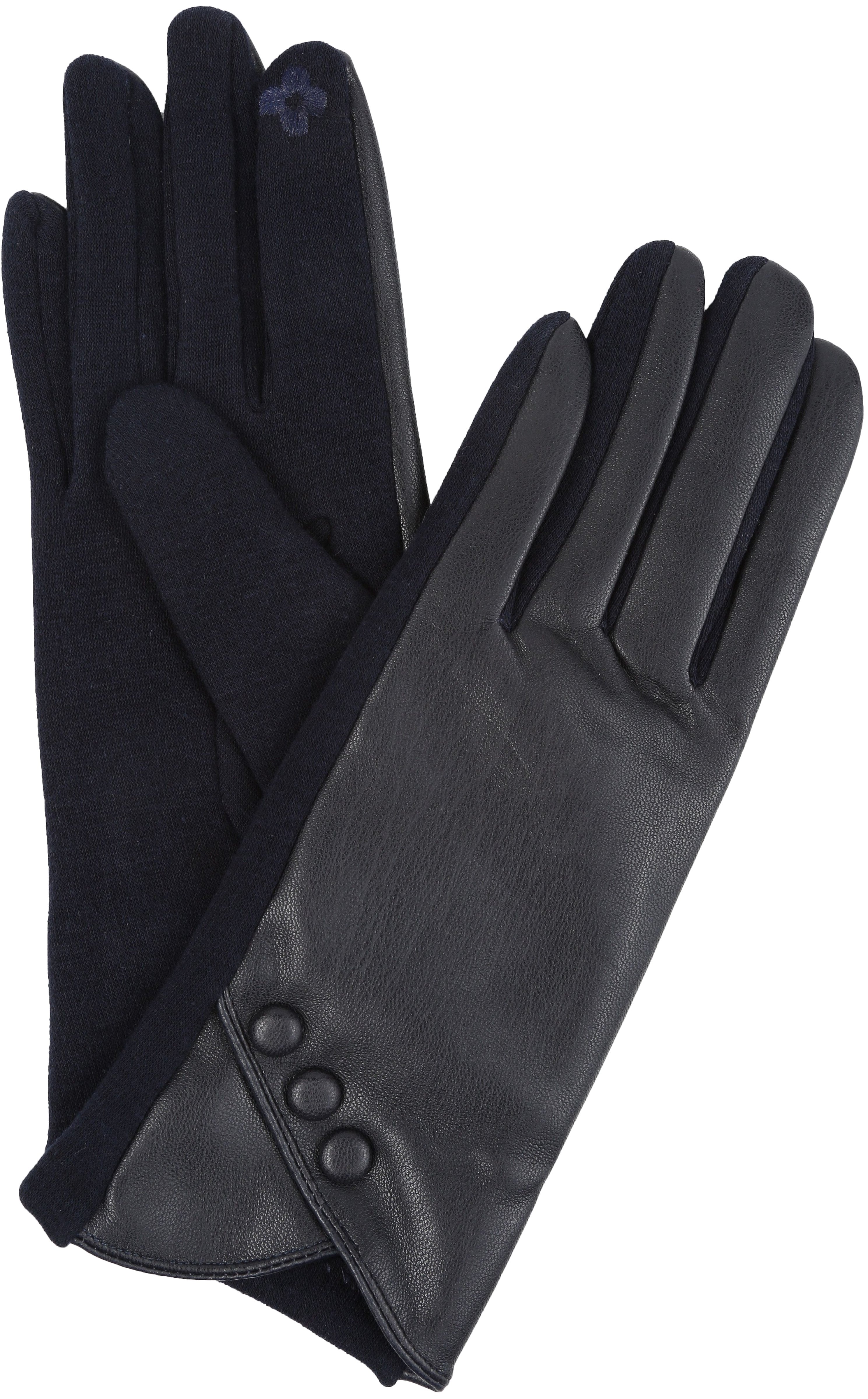 • These gloves feature an elegant button design at the wrist, a faux leather front top exterior lining, and a bottom heather knit exterior lining. The interior of these gloves are very warm and soft. These gloves feature a multi toned design, and texture. Finger tips have touch screen capabilities so that you will never need to take them off in order to use touch screen capable devices!