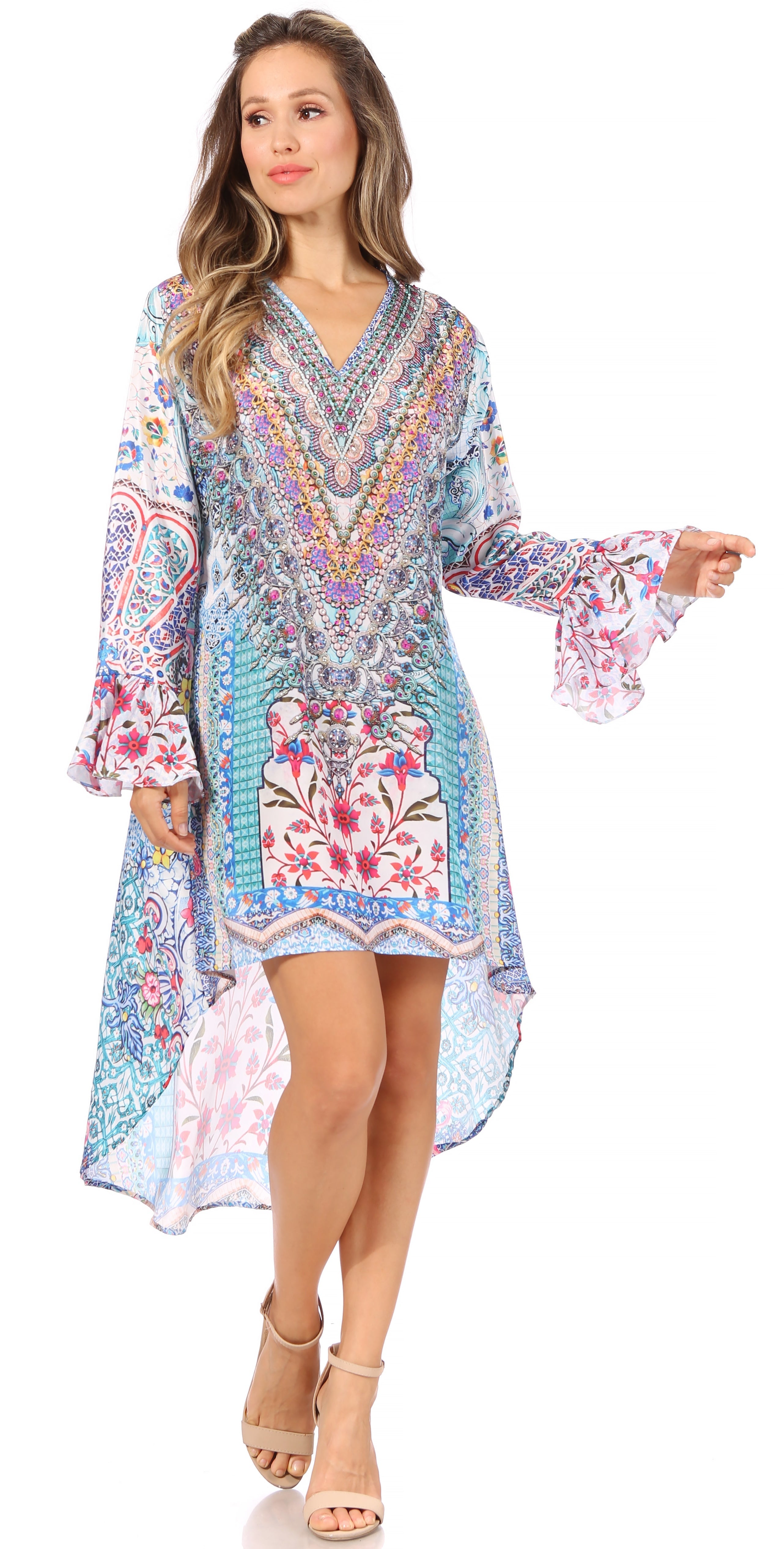 • MINI DRESS/TUNIC/COVER-UP/SHIFT DRESS: Rema, the perfect lightweight casual summer dress. This lovely garment features long sleeves with ruffle, V-neck, colorful print, embellishment at front, A-line shape and a high-low bottom. Ideal for everyday wear, easily transitions from casual to formal, can also be worn as swimwear cover up! Look and feel like a goddess in any setting while wearing this gorgeous dress!
