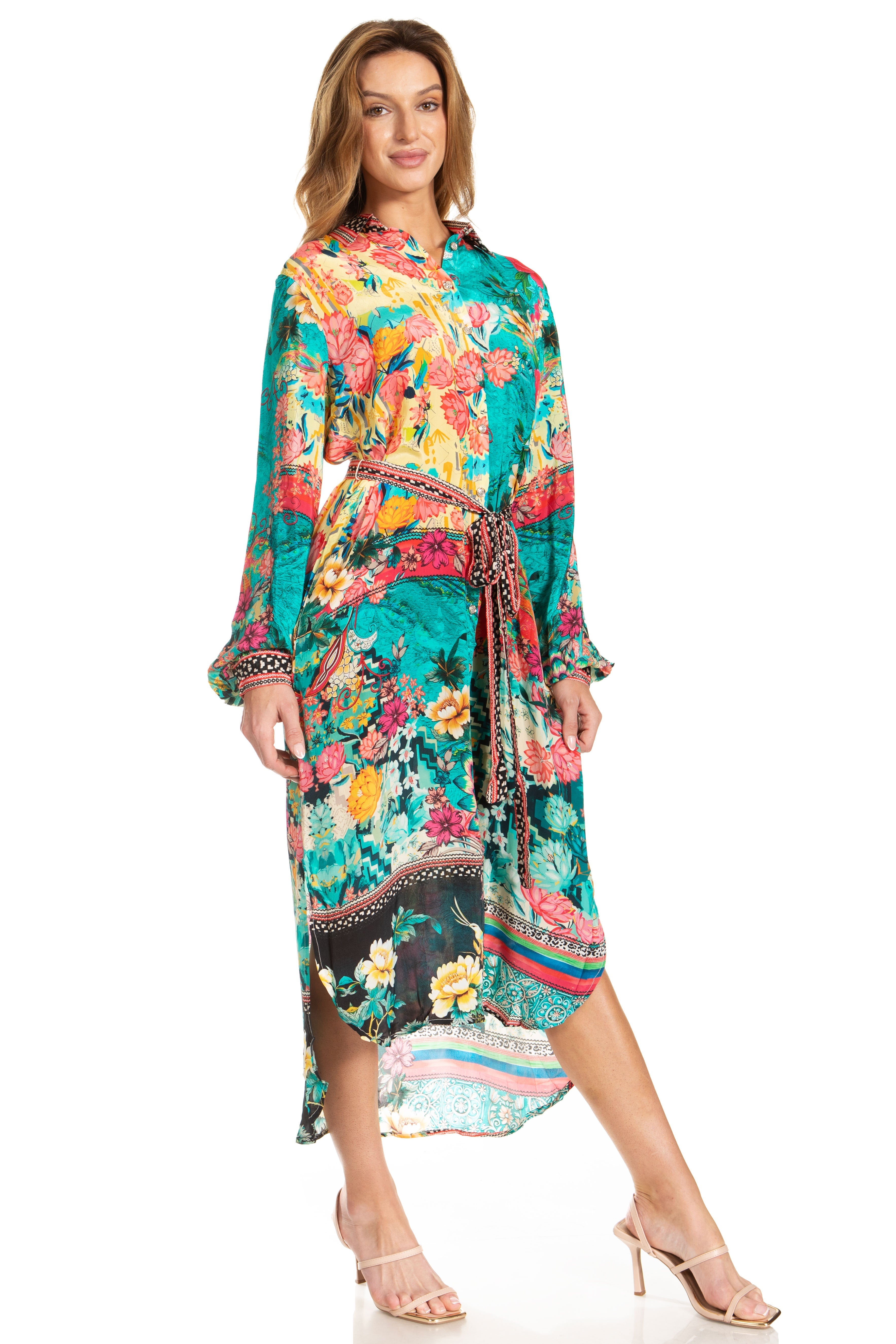 The Rina dress is a beautiful shirt dress maxi with a button-down front, shirt collar, 3/4 sleeves, side pockets, and matching sash/belt. The dress is made with lightweight material, finished with a vibrant print and a high low shape, flounce, and flared bottom.