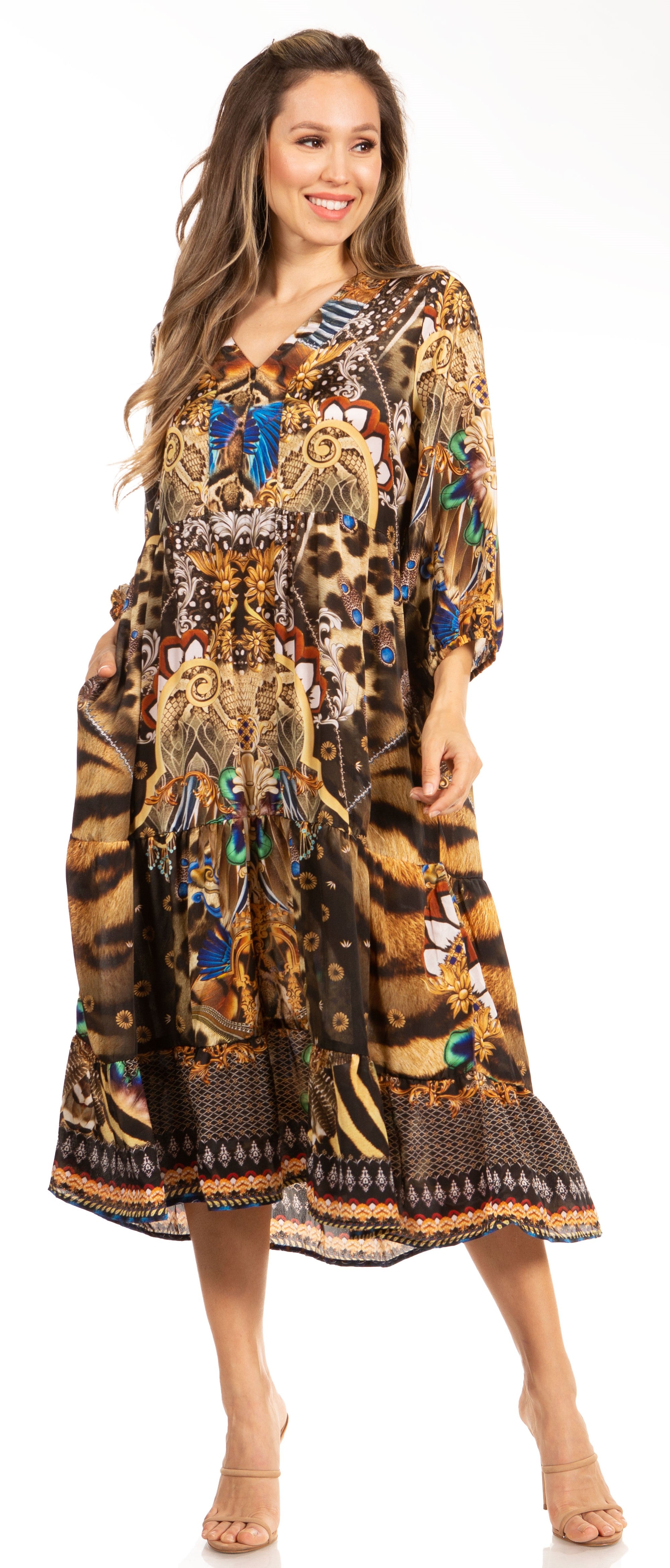 • MIDI/ BOHO/ COCKTAIL/PARTY: Sole, the most beautiful, flattering, and versatile dress! Bohemian inspired, loose fit, 3/4 sleeves with elastic at cuffs, V neck, comes with side pockets, ruffle style bottom. Swing style, pullover, made with lightweight material and unique vibrant print!