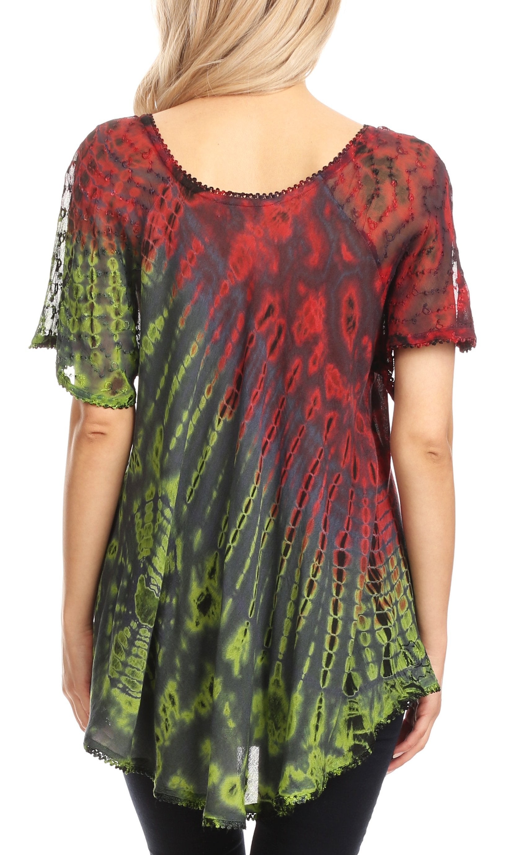 Sakkas Splenka Long Tie Dye Embroidered Corset Neck Cap Sleeve Blouse Shirt Top