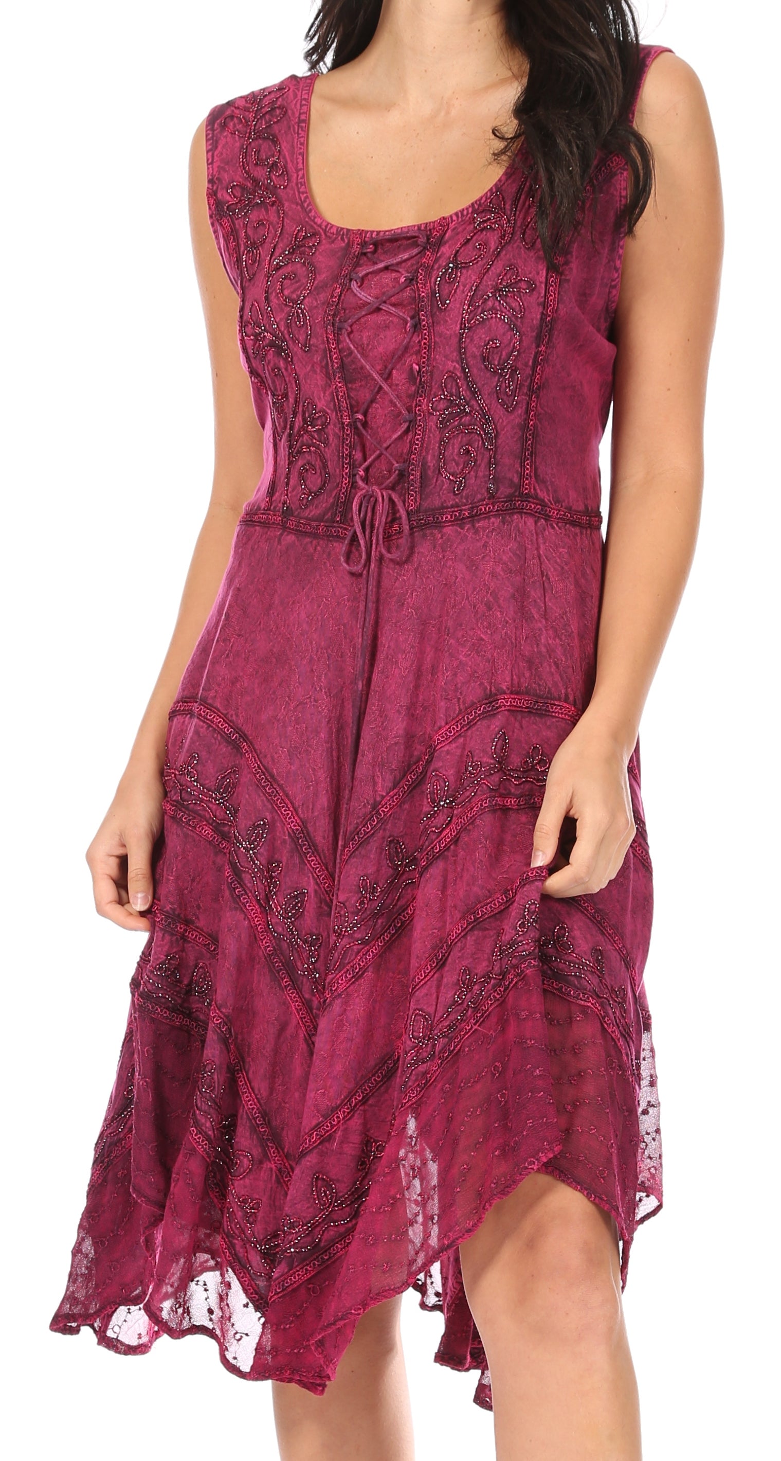 Sakkas Sundara Stonewashed Rayon Embroidered Mid Length Dress