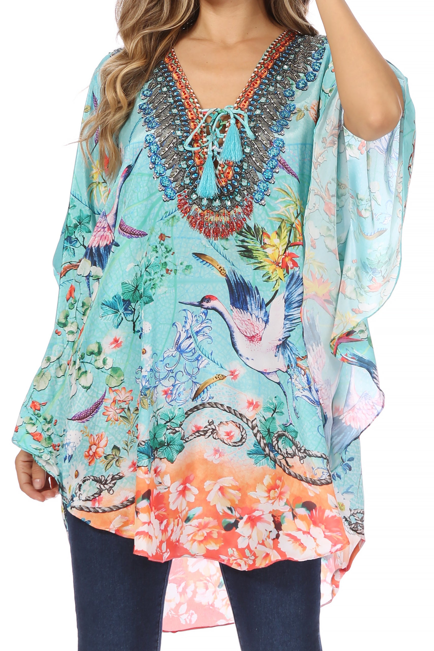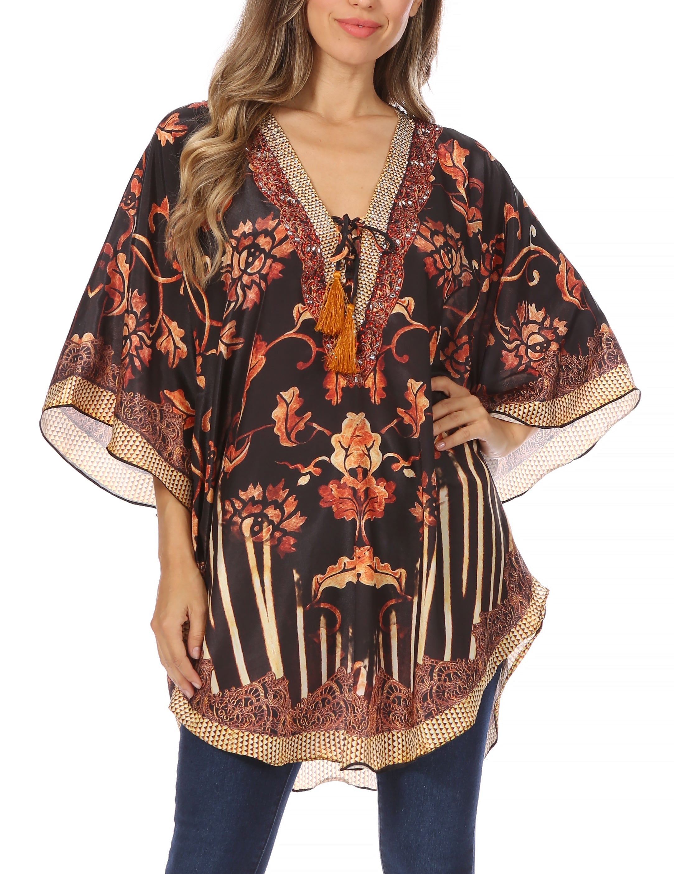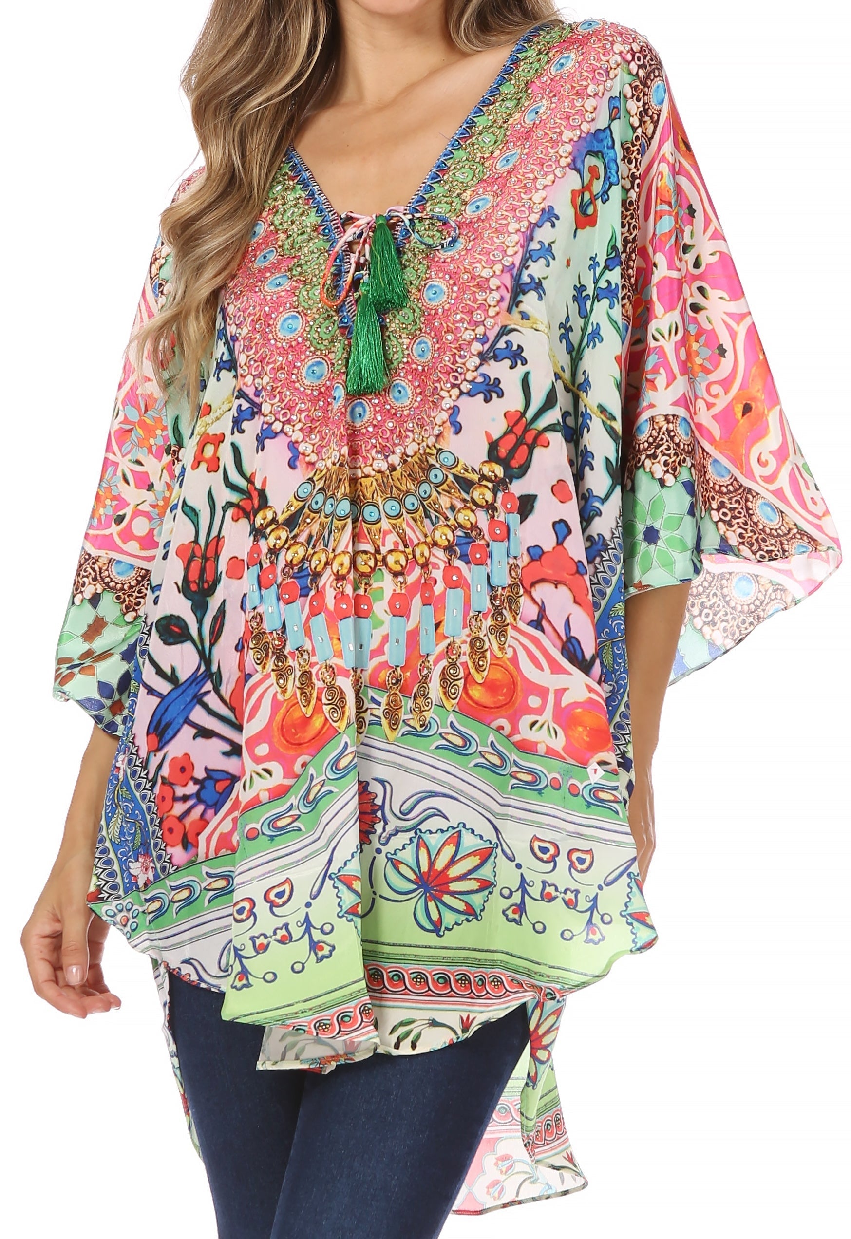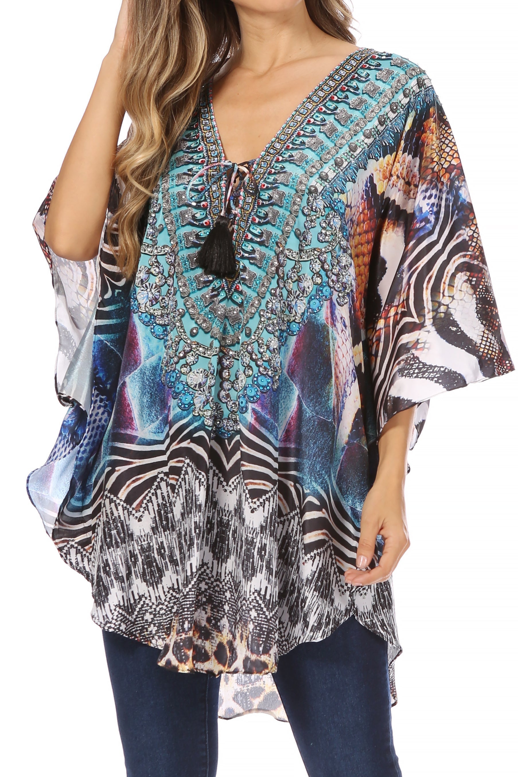 Sakkas Tallulah Wide Circle Blouse V Neck Top With Tassle Ties And Rhinestones