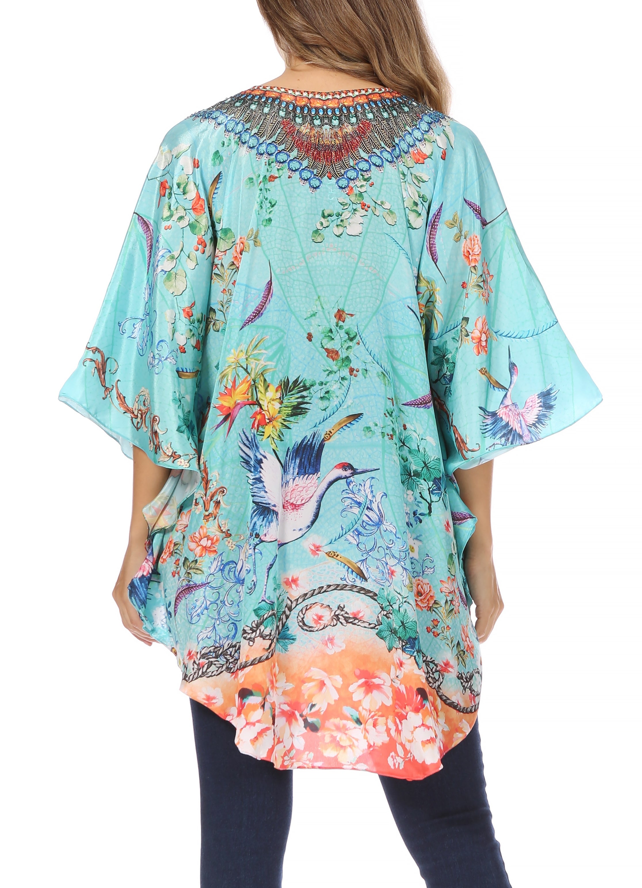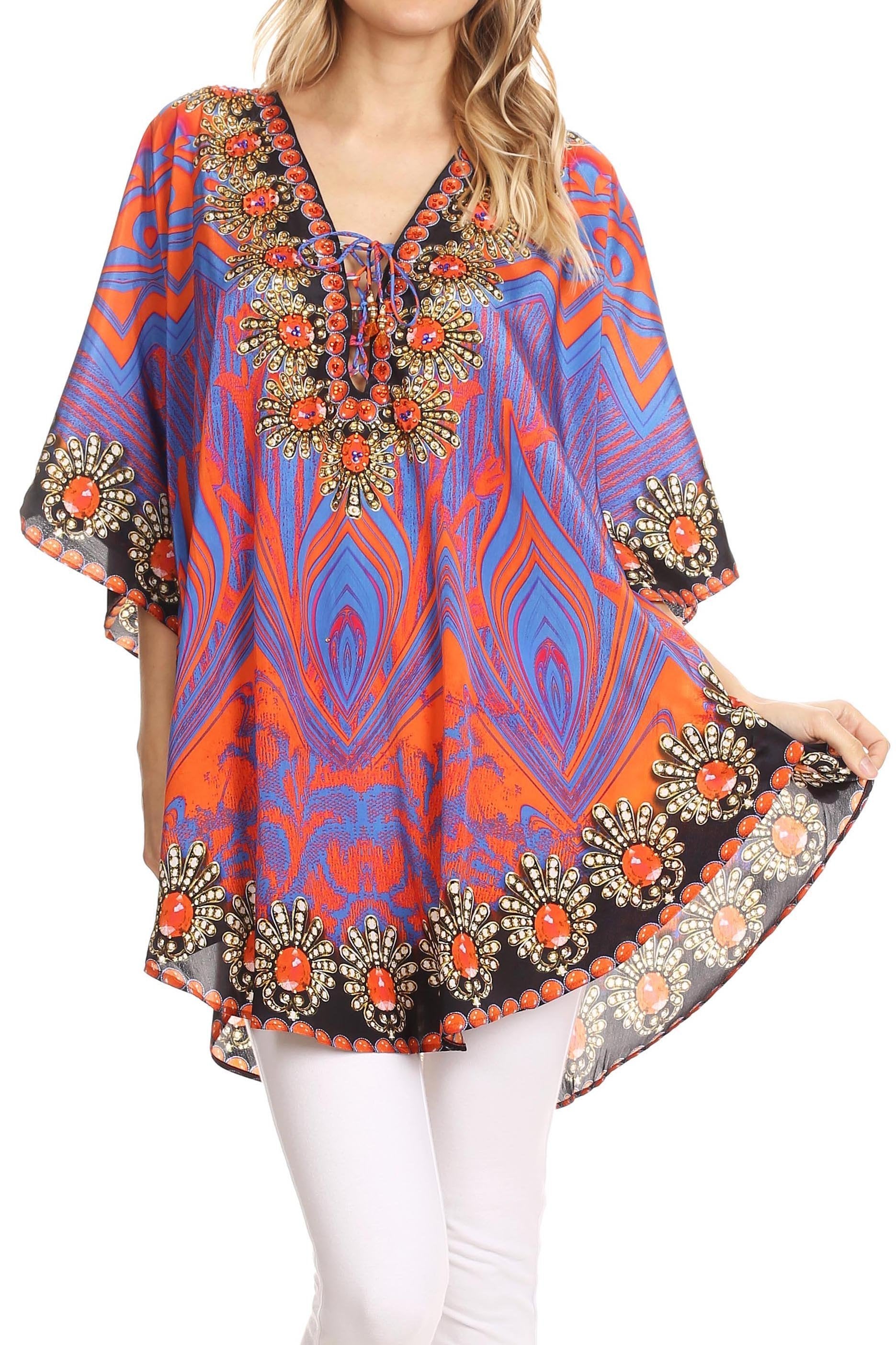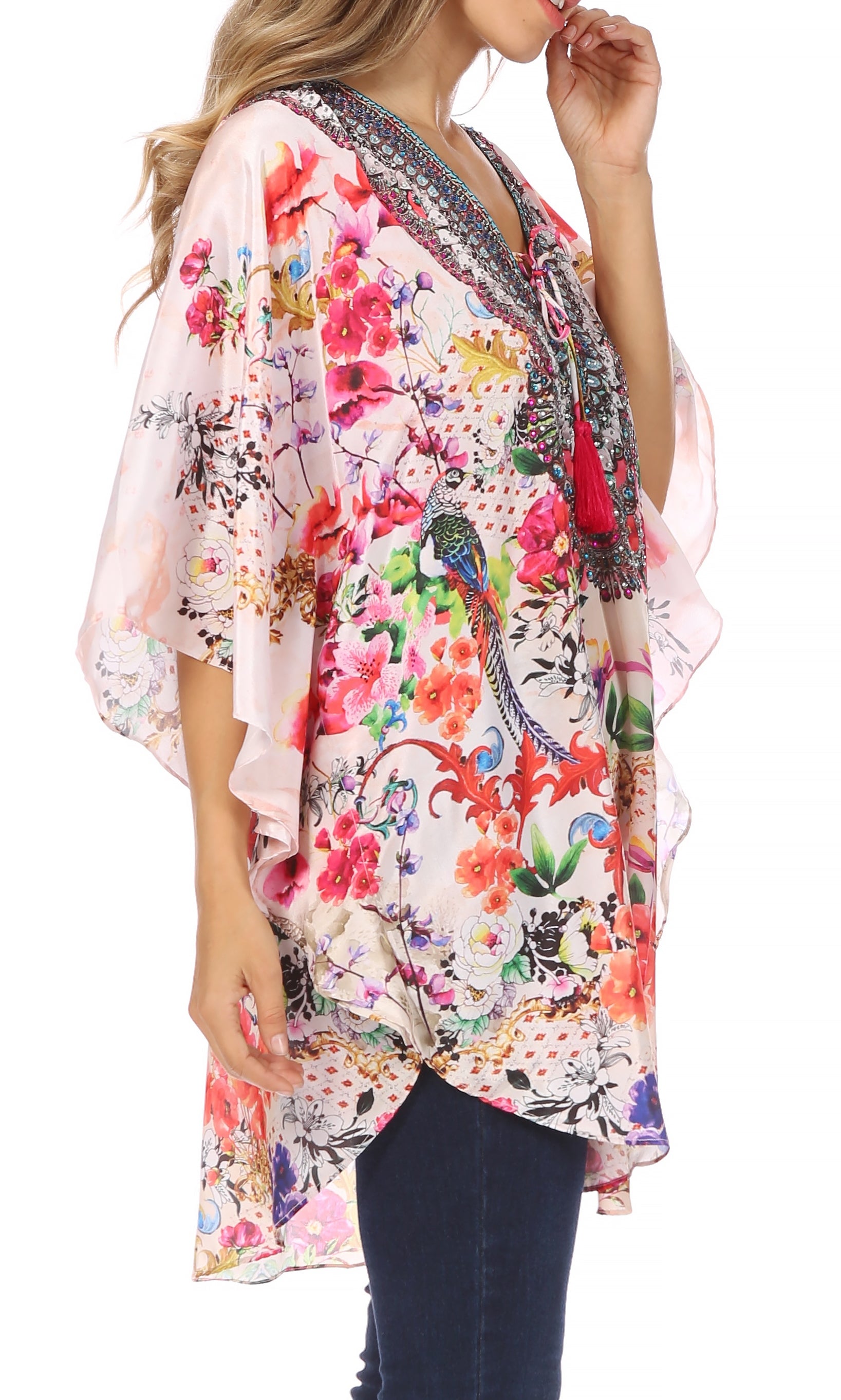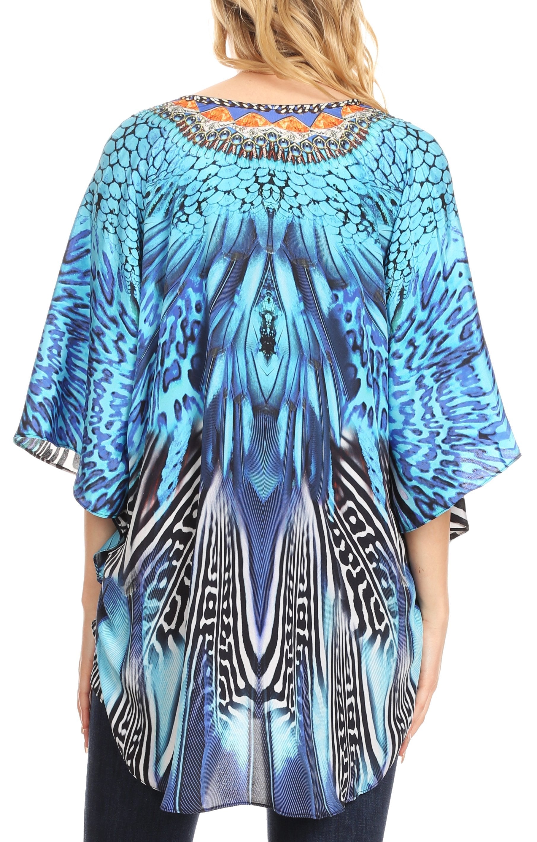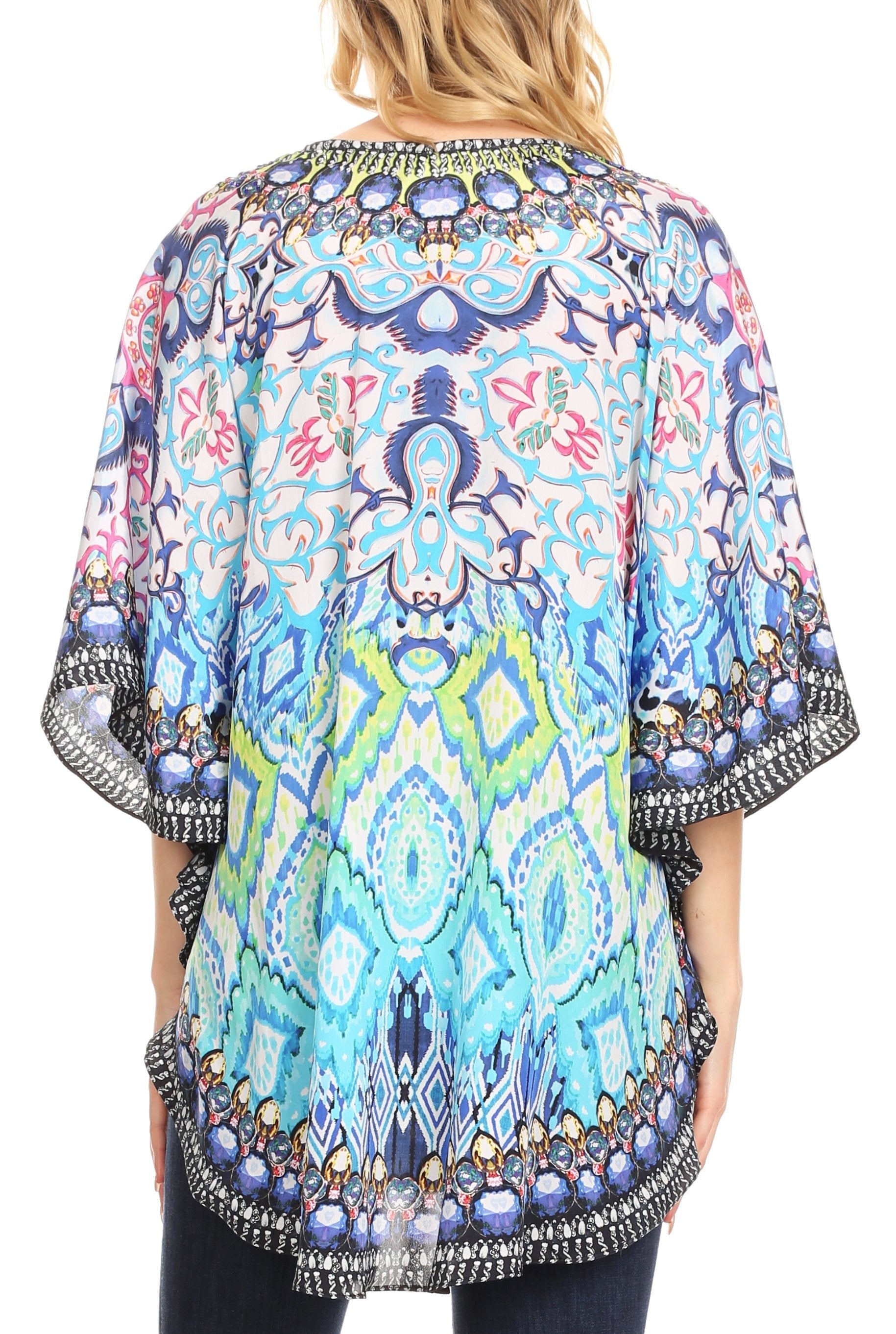 Sakkas Tallulah Wide Circle Blouse V Neck Top With Tassle Ties And Rhinestones