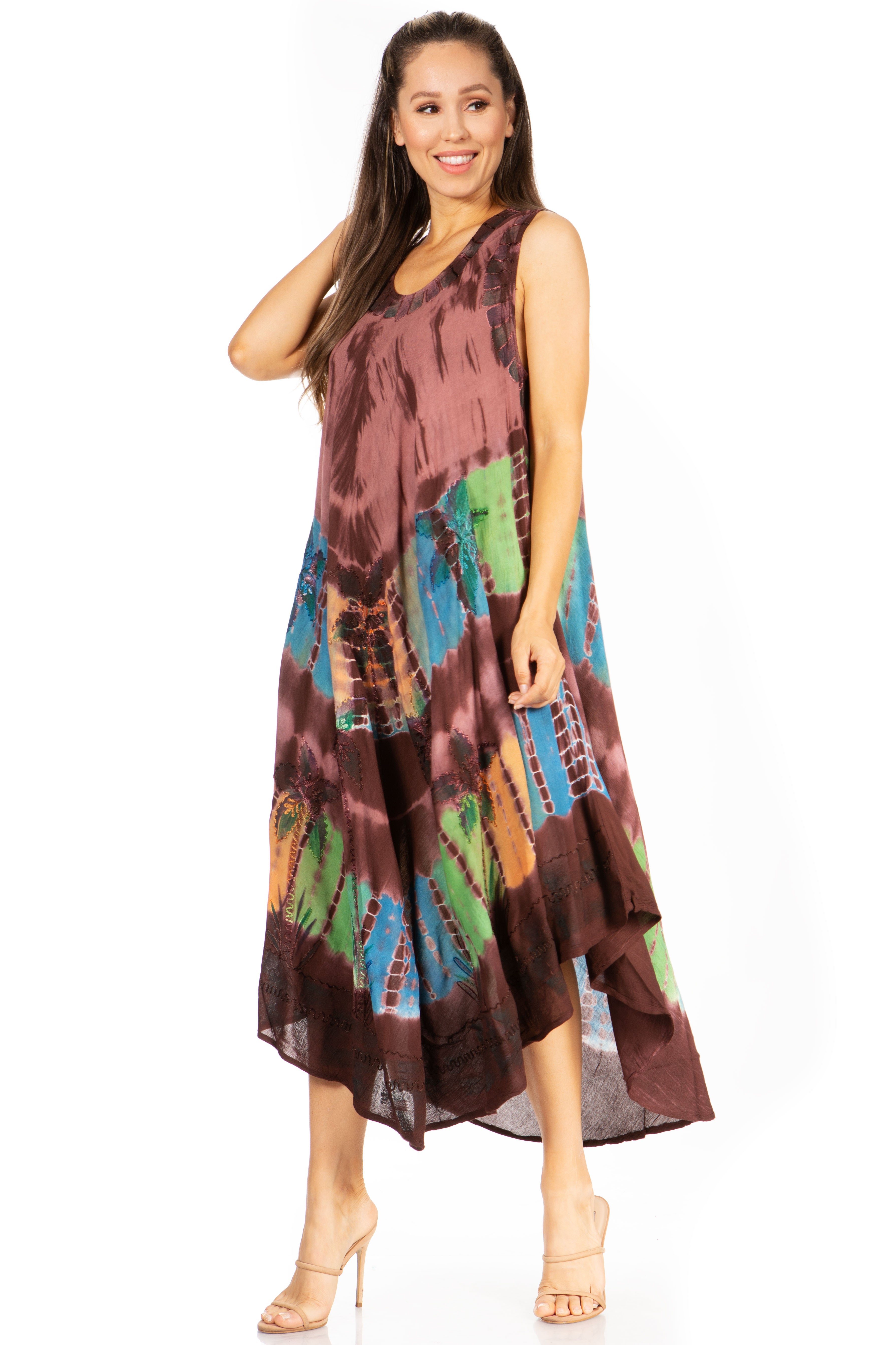 • Sleeveless caftan dress features unique tie dye design, embroidered details and relaxed fit.