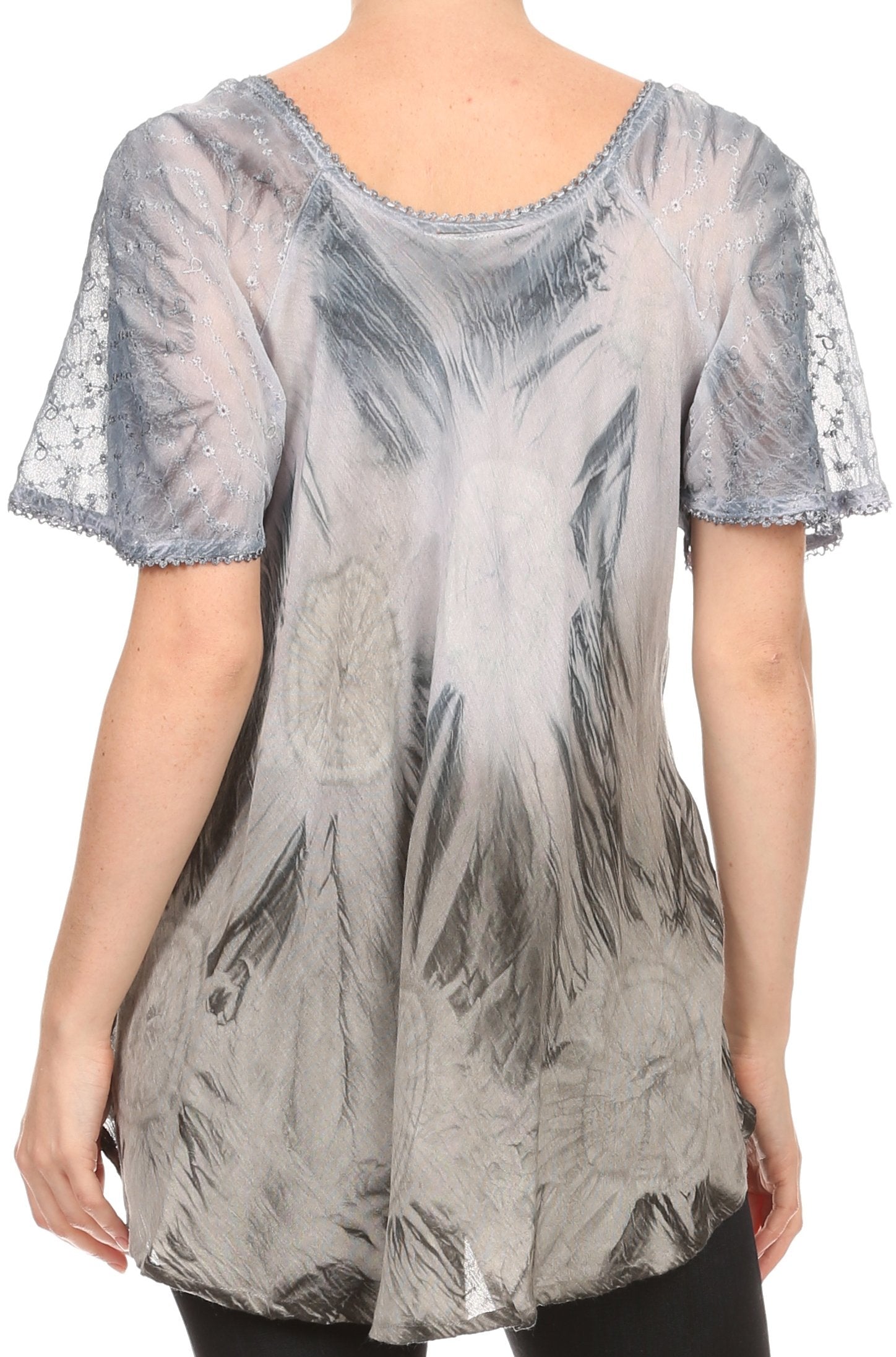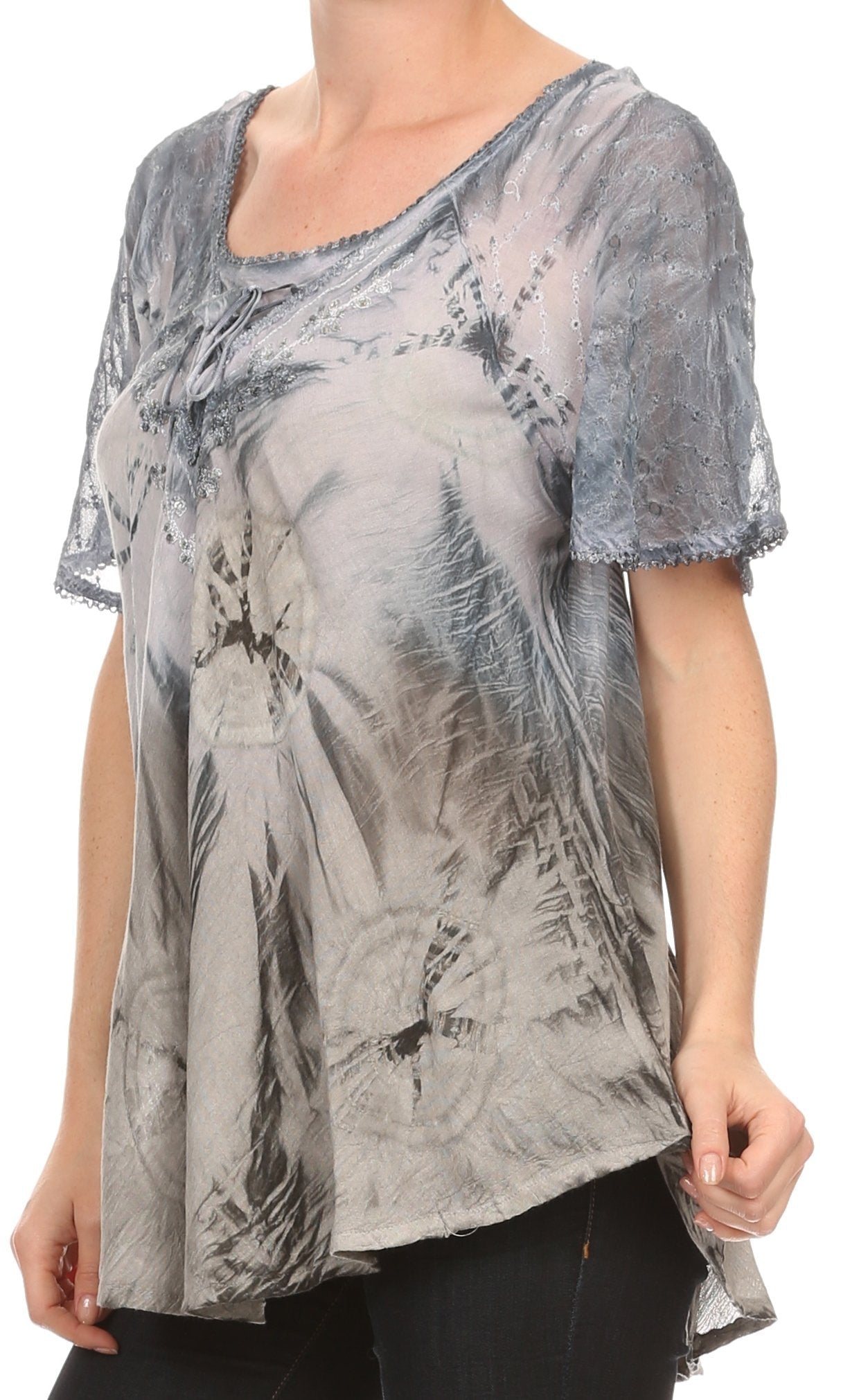 Sakkas Taylay Ombre Tie Dye Batik Long Embroidered Corset Neck Blouse Shirt Top