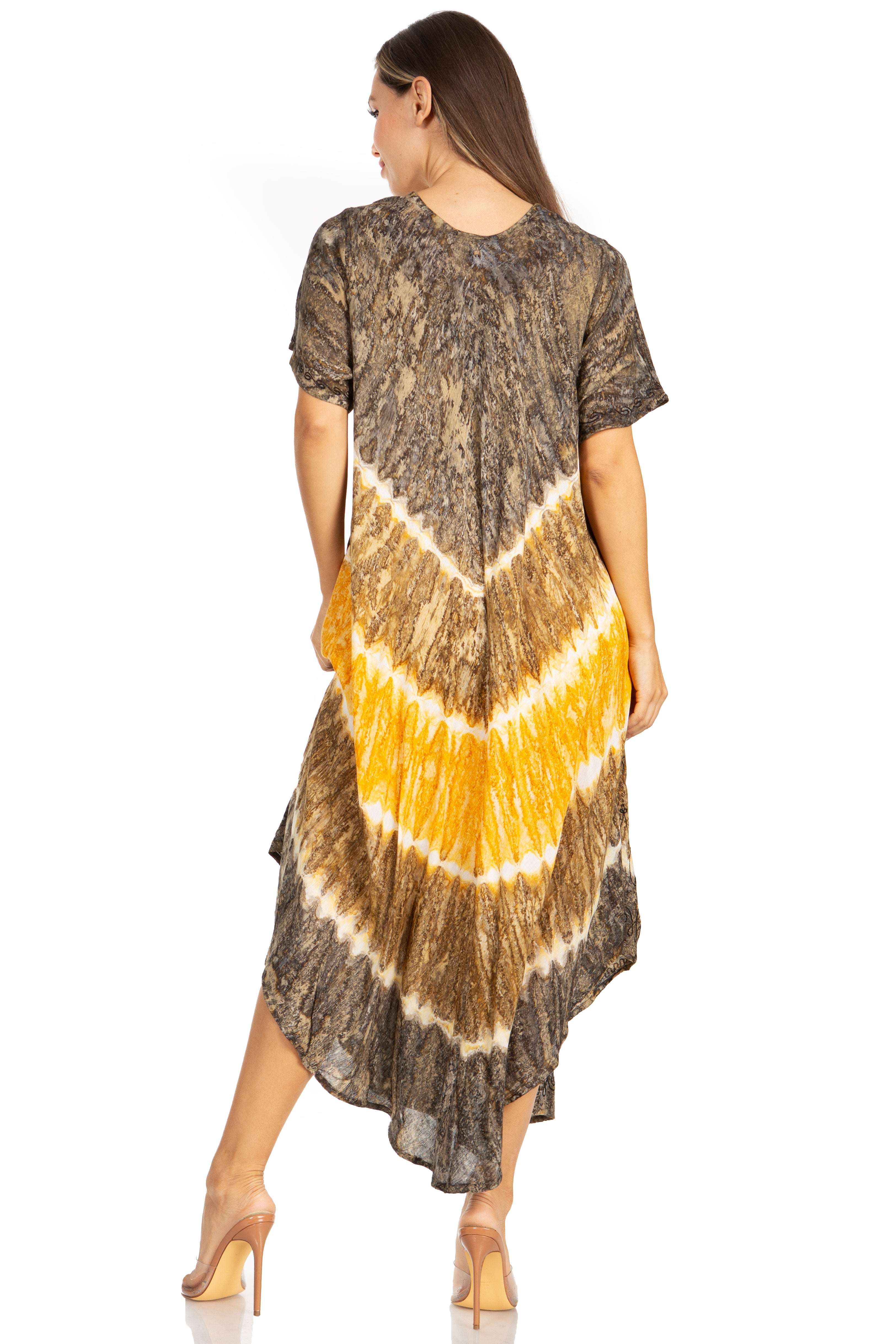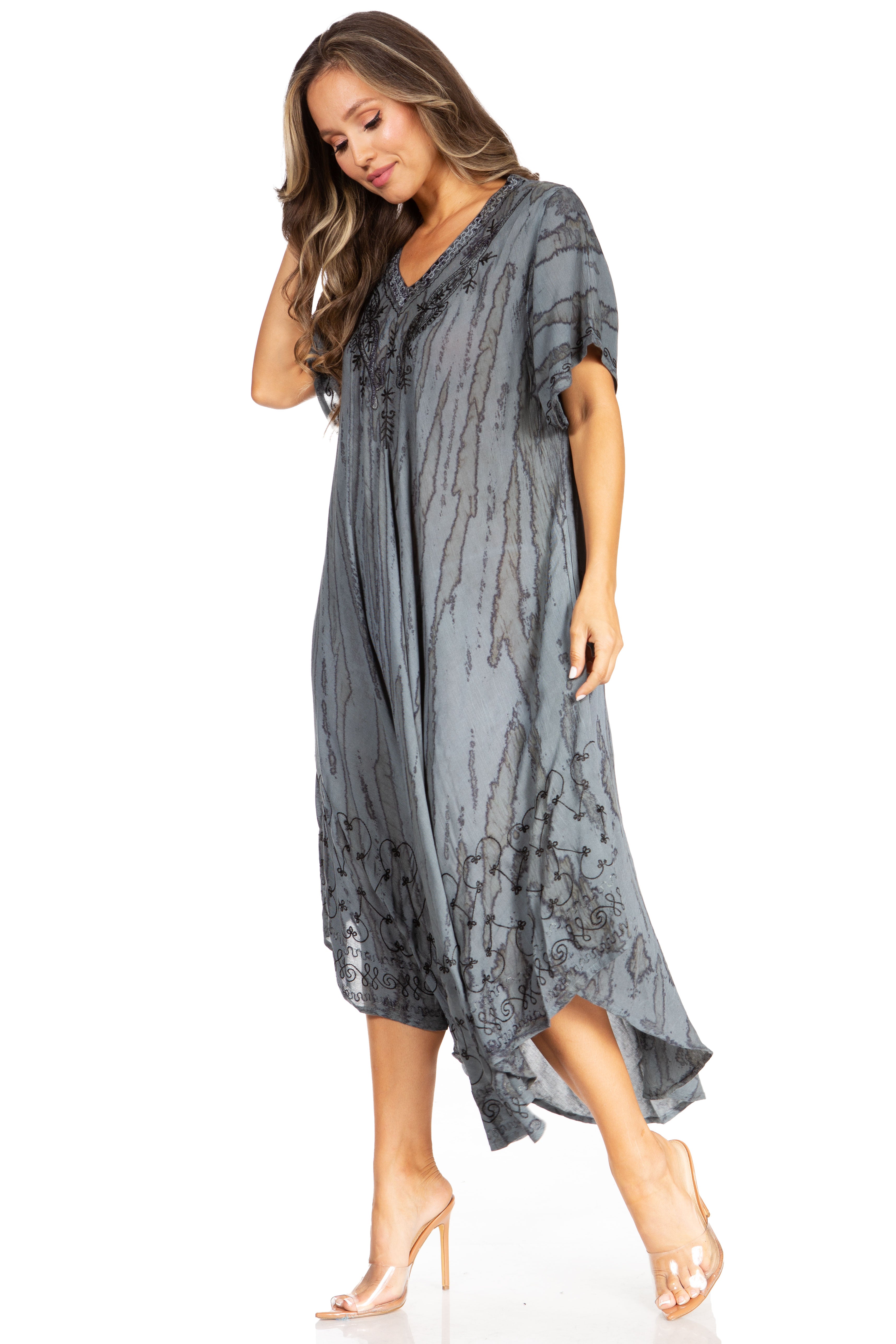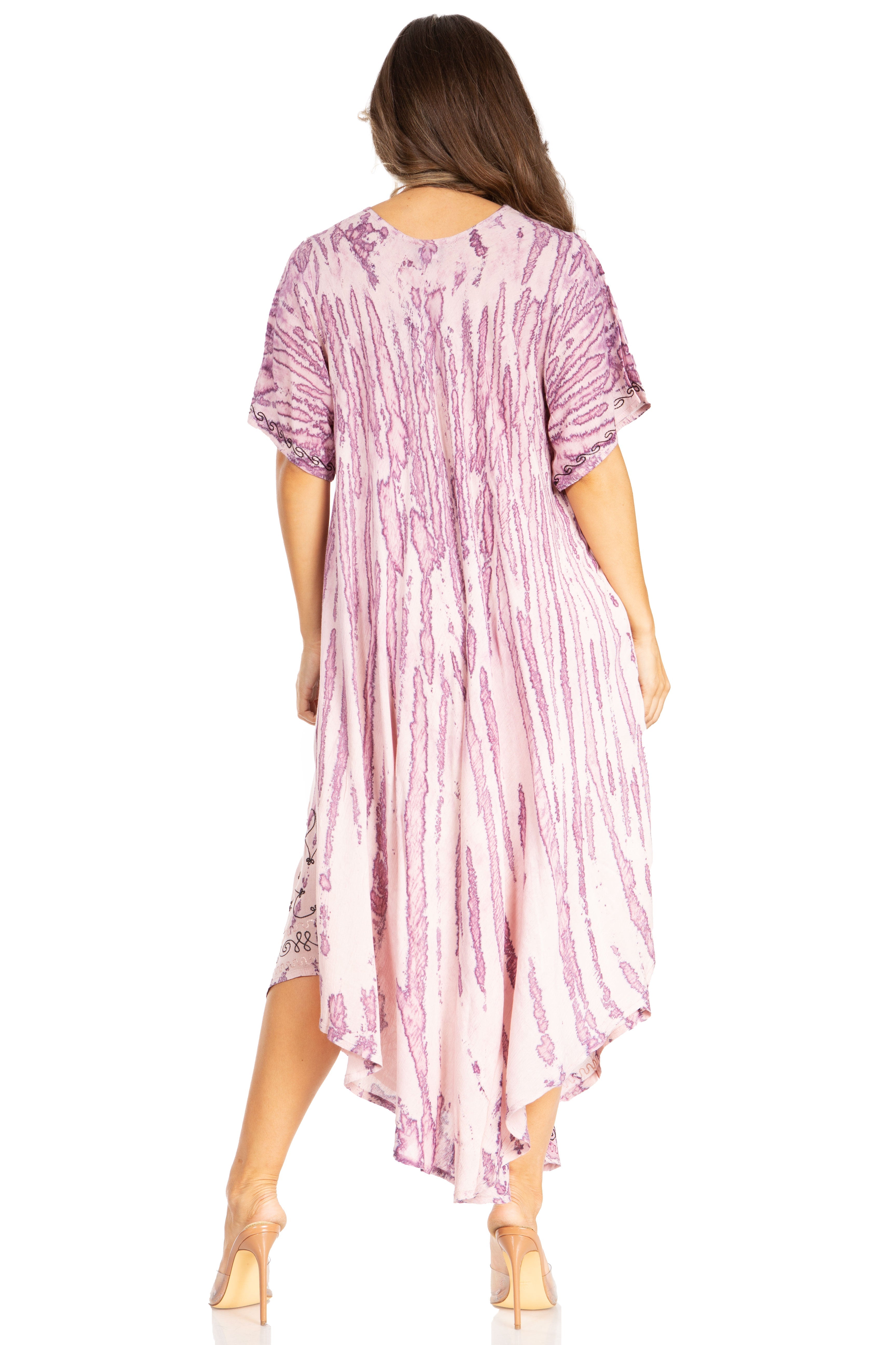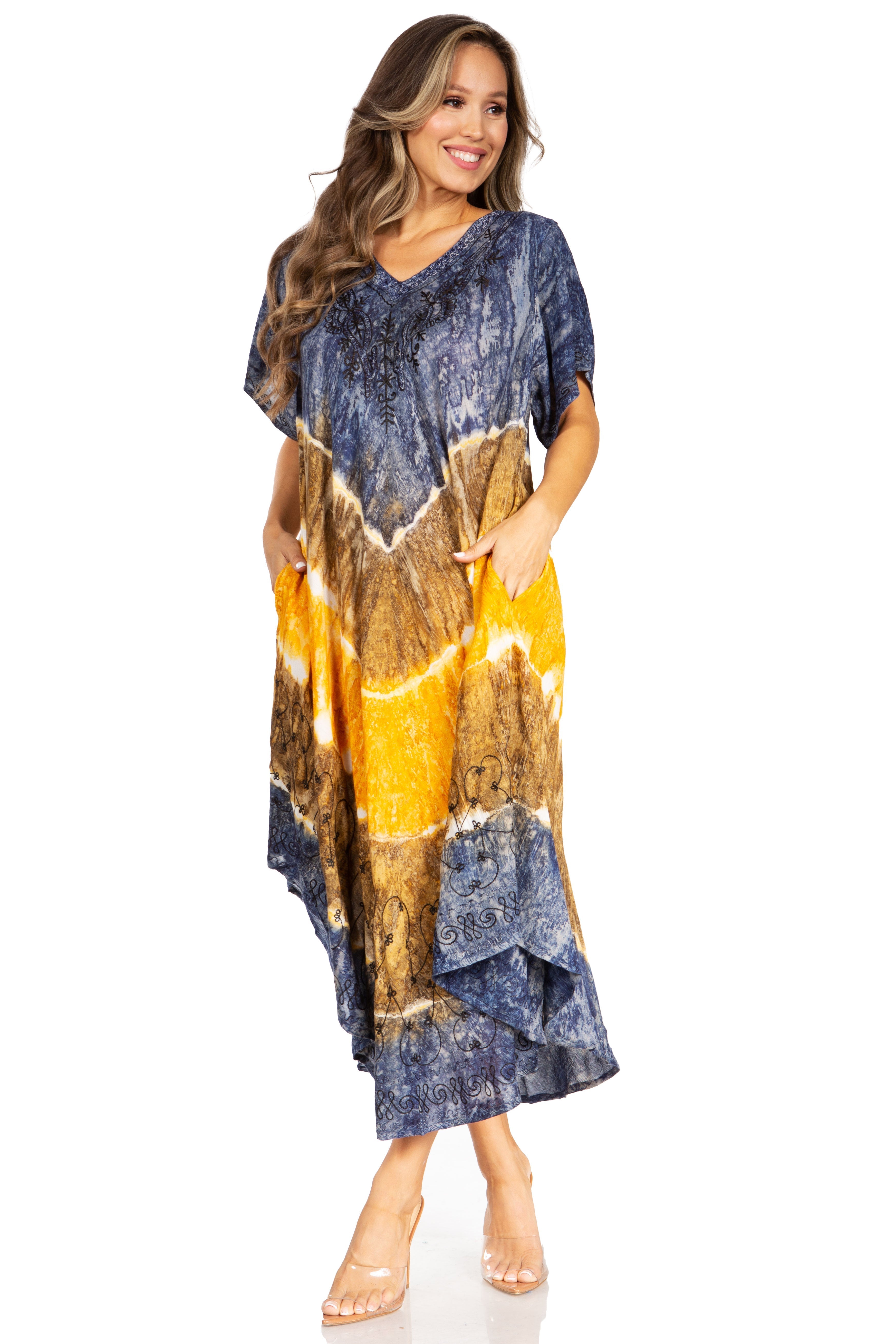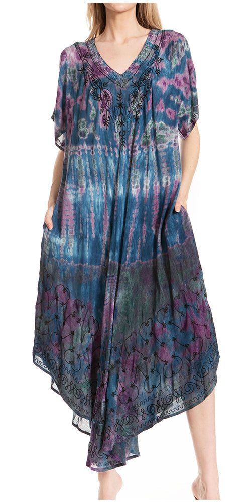 • Caftan dress features unique embroidered neckline and hem, tie dye fabric and relaxed fit.