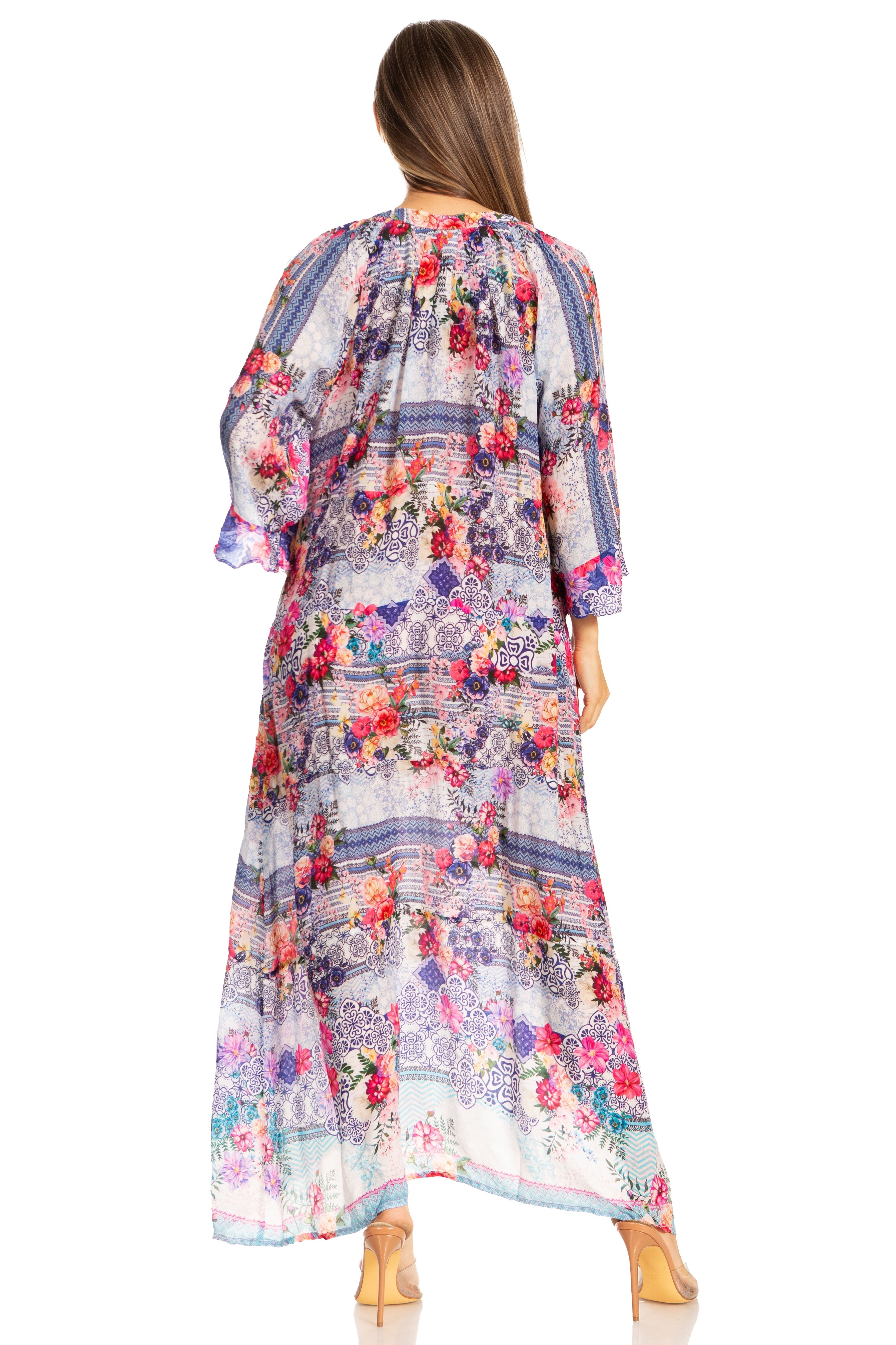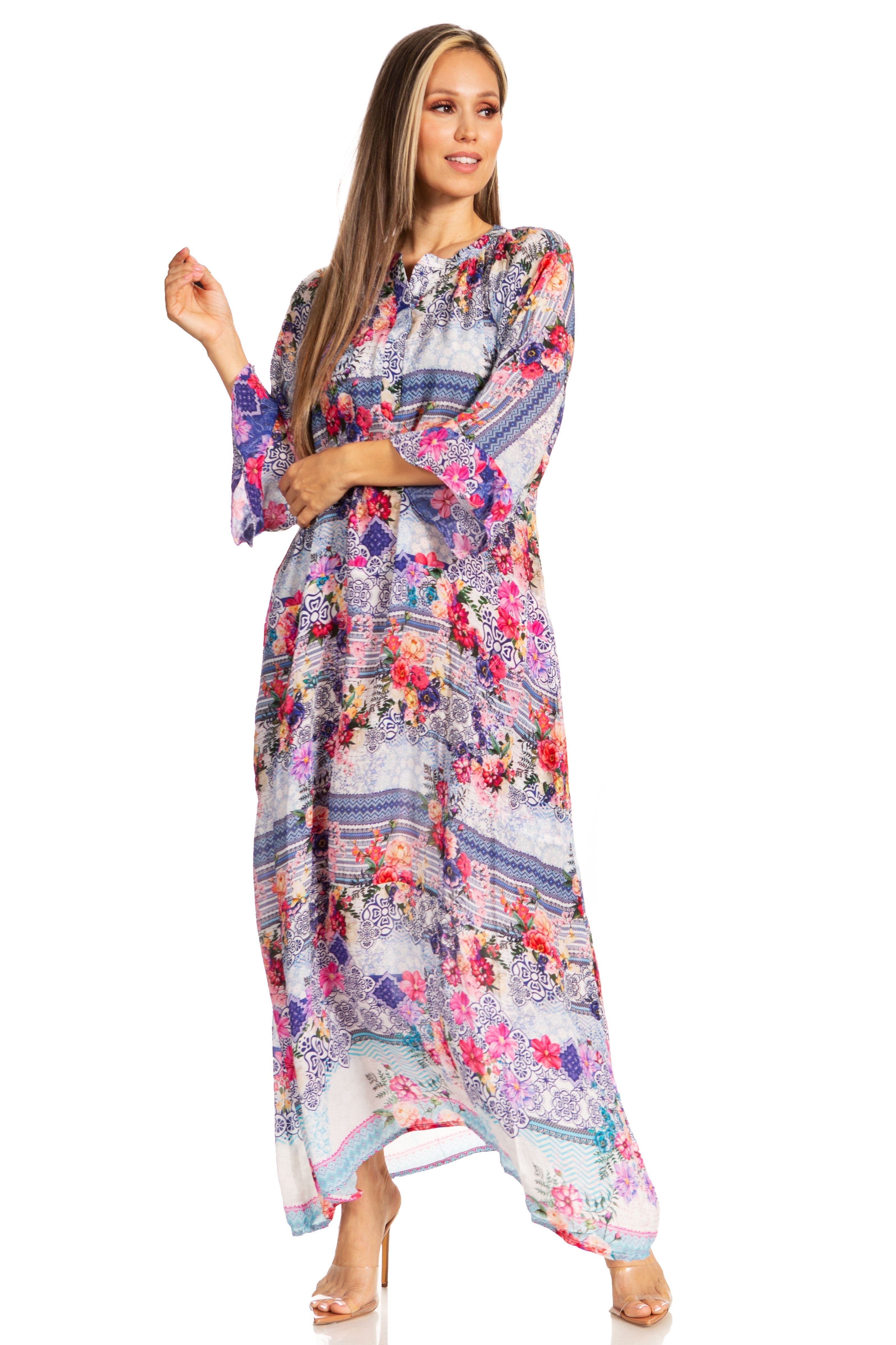 • Features A-line full-length long maxi dress with henley neckline, elbow length flowy hem sleeves. Fabric is semi-sheer with no lining attached. Useful two side pockets for carrying around essential everyday items.