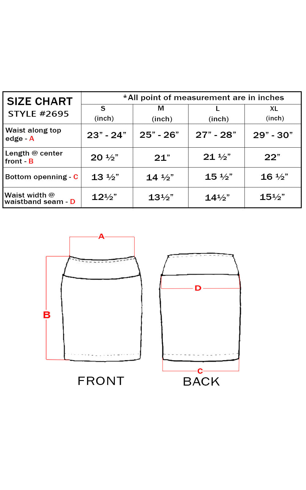 • Small (S) (Inch): Waist (along top edge): 23"-24", Length (@ center front): 20½", Bottom opening: 13½", Waist width (@ waistband seam): 12½". Medium (M) (Inch): Waist (along top edge): 25"-26", Length (@ center front): 21", Bottom opening: 14½", Waist width (@ waistband seam): 13½".