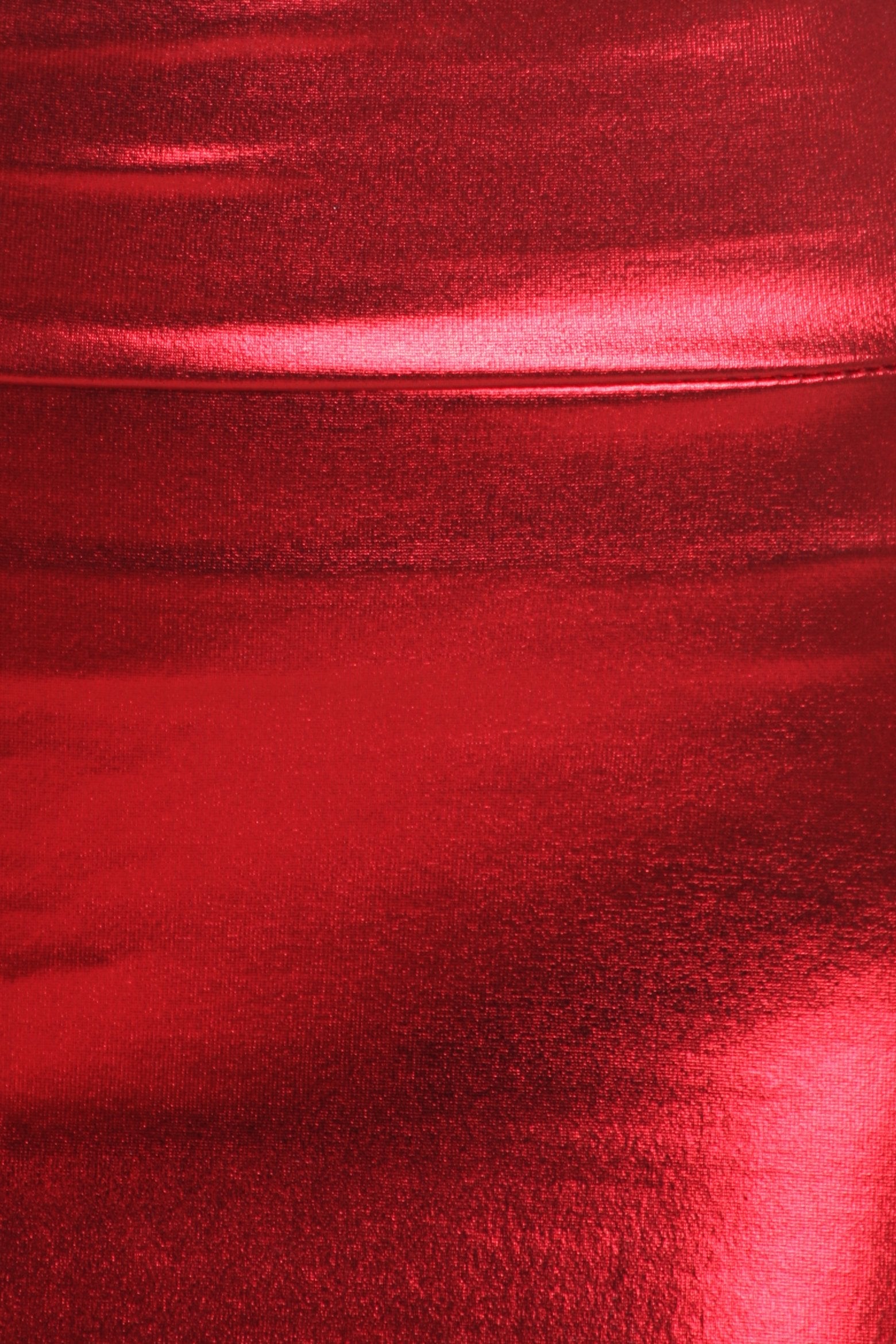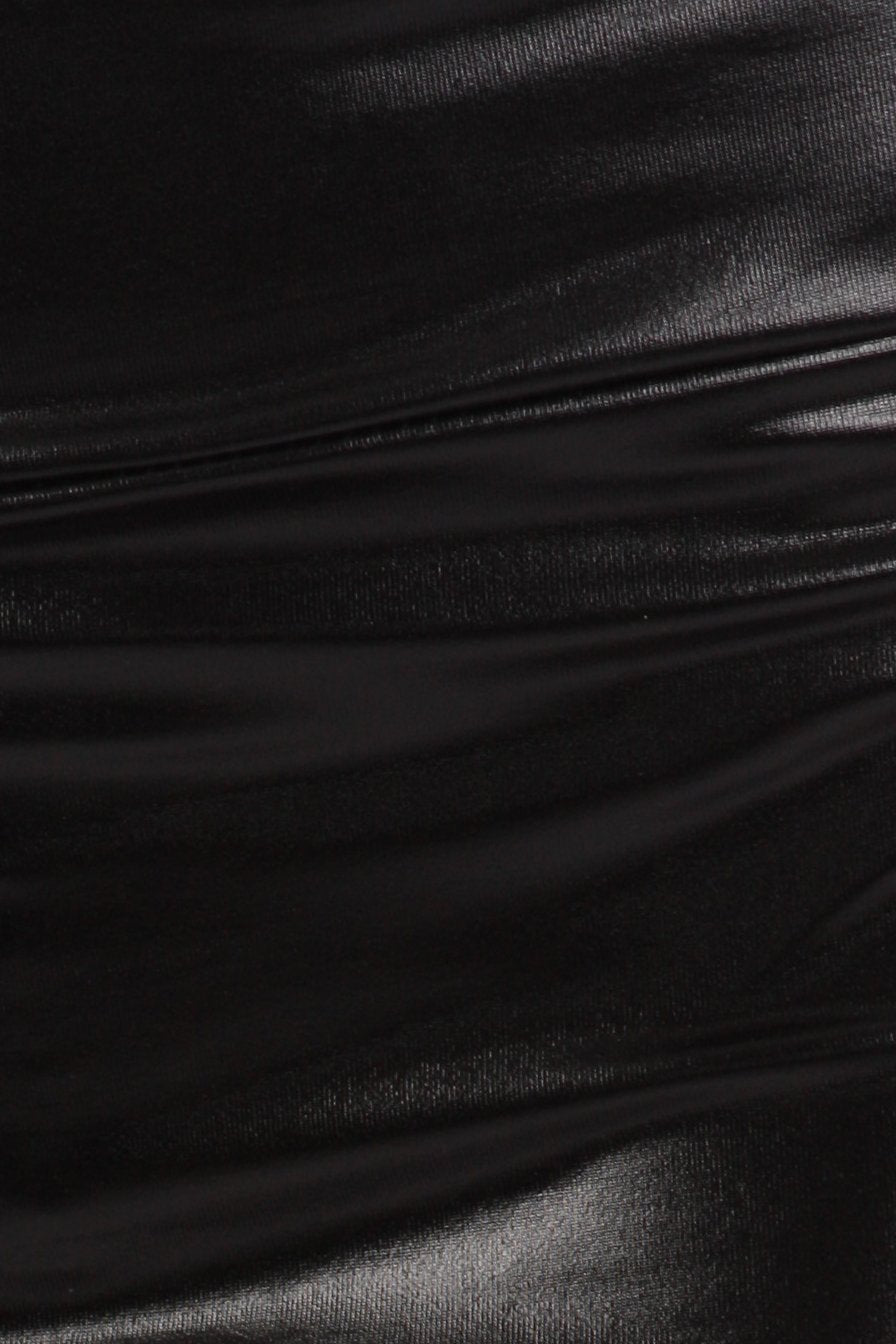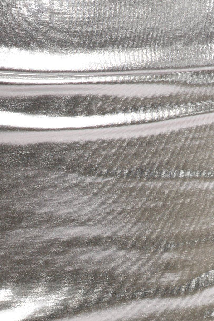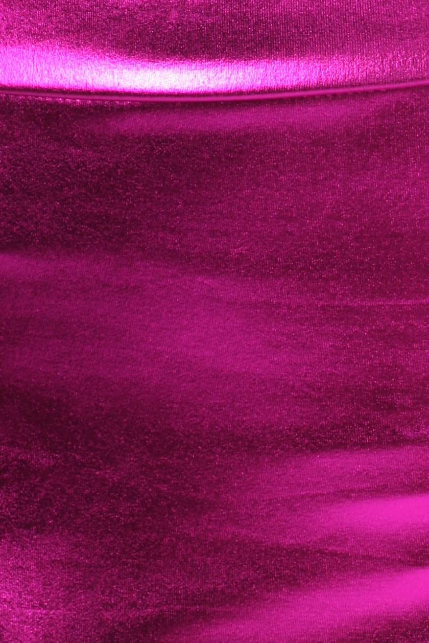 Women's metallic liquid mini skirt features jersey lined comfortable waistband, laser-cut hem and shiny metallic stretch fabric.