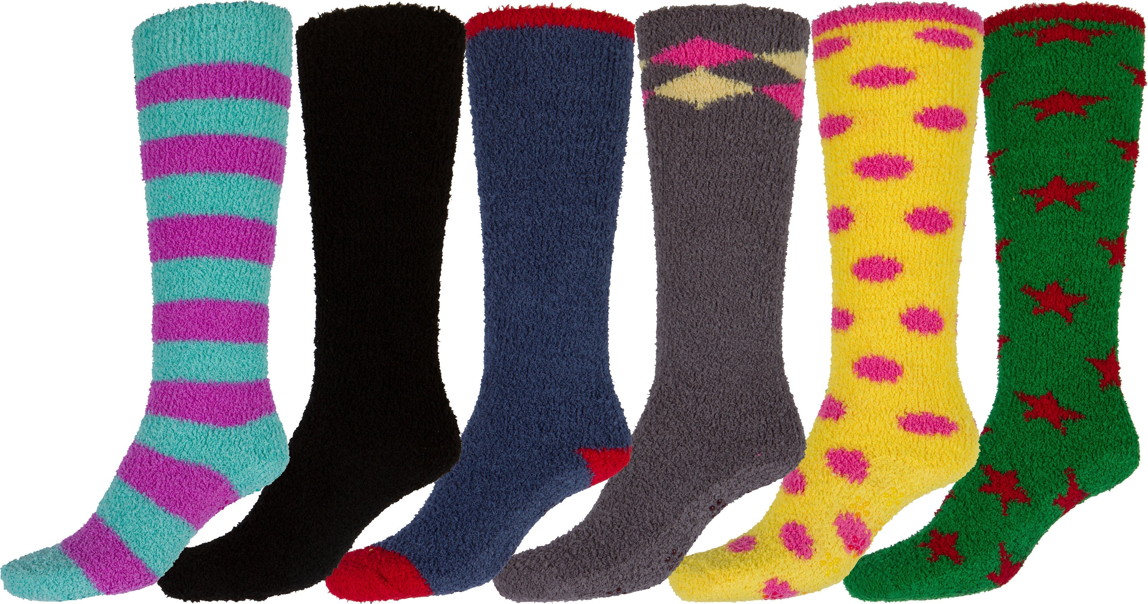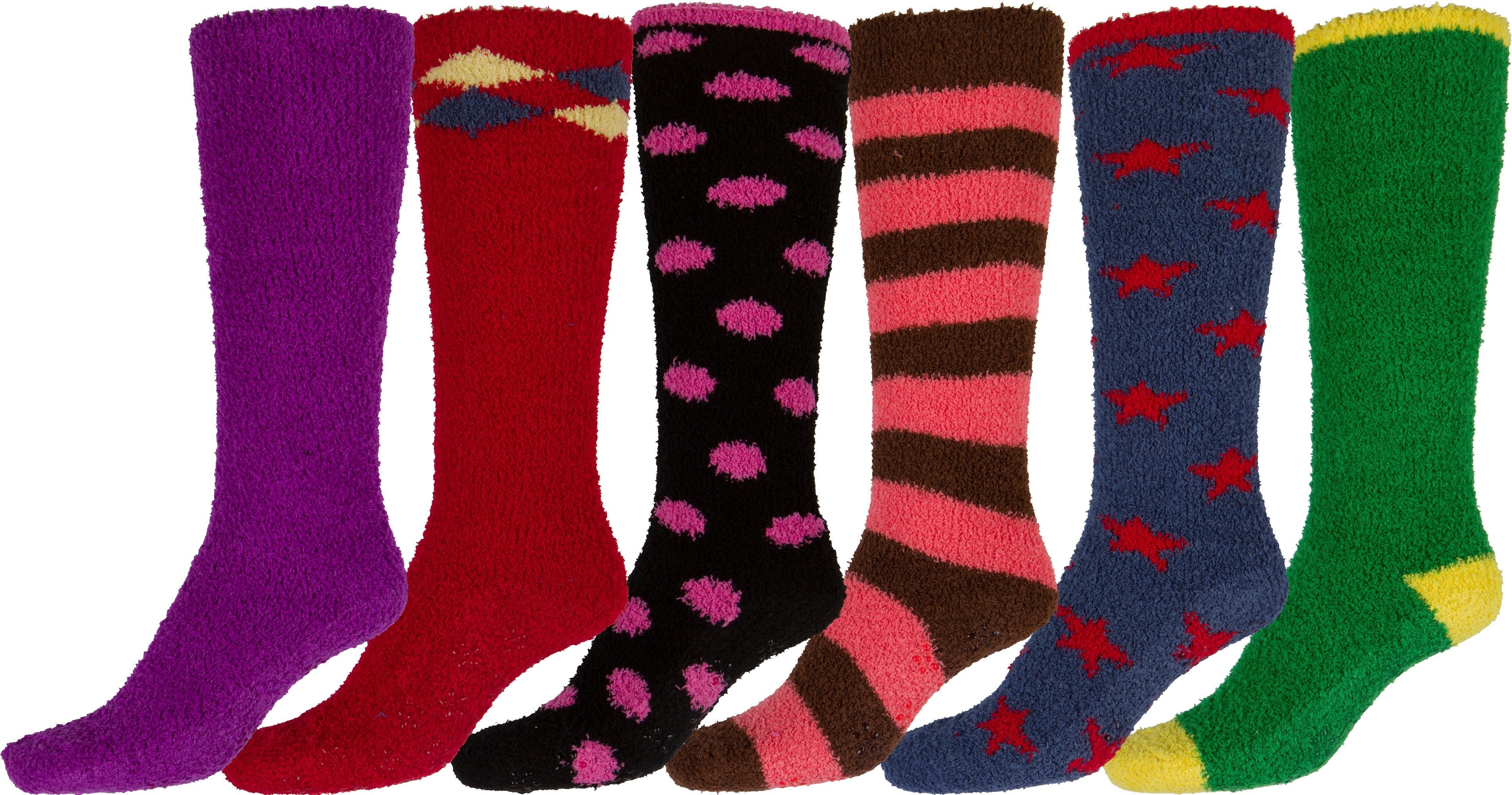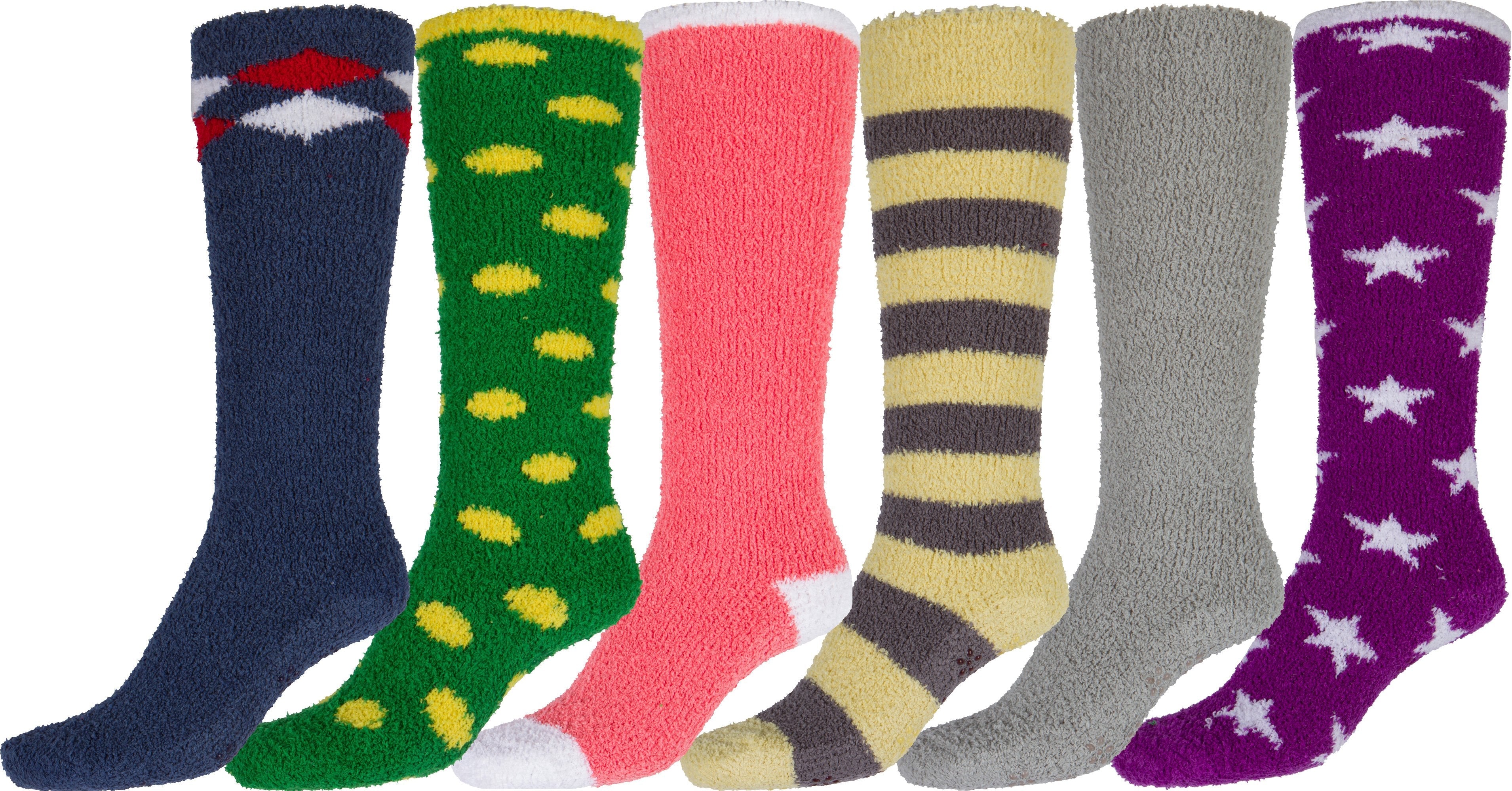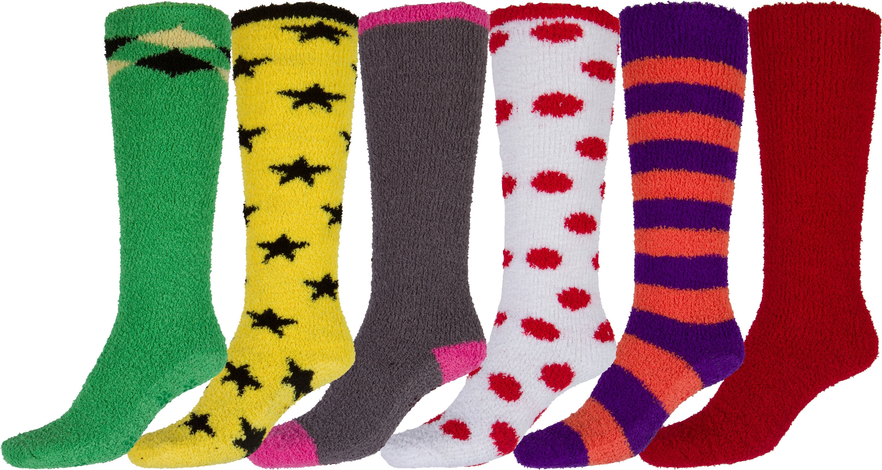 • Socks come in a knee high length. Material is soft, warm, and fuzzy. Value pack includes six pairs of socks in assorted design and colors