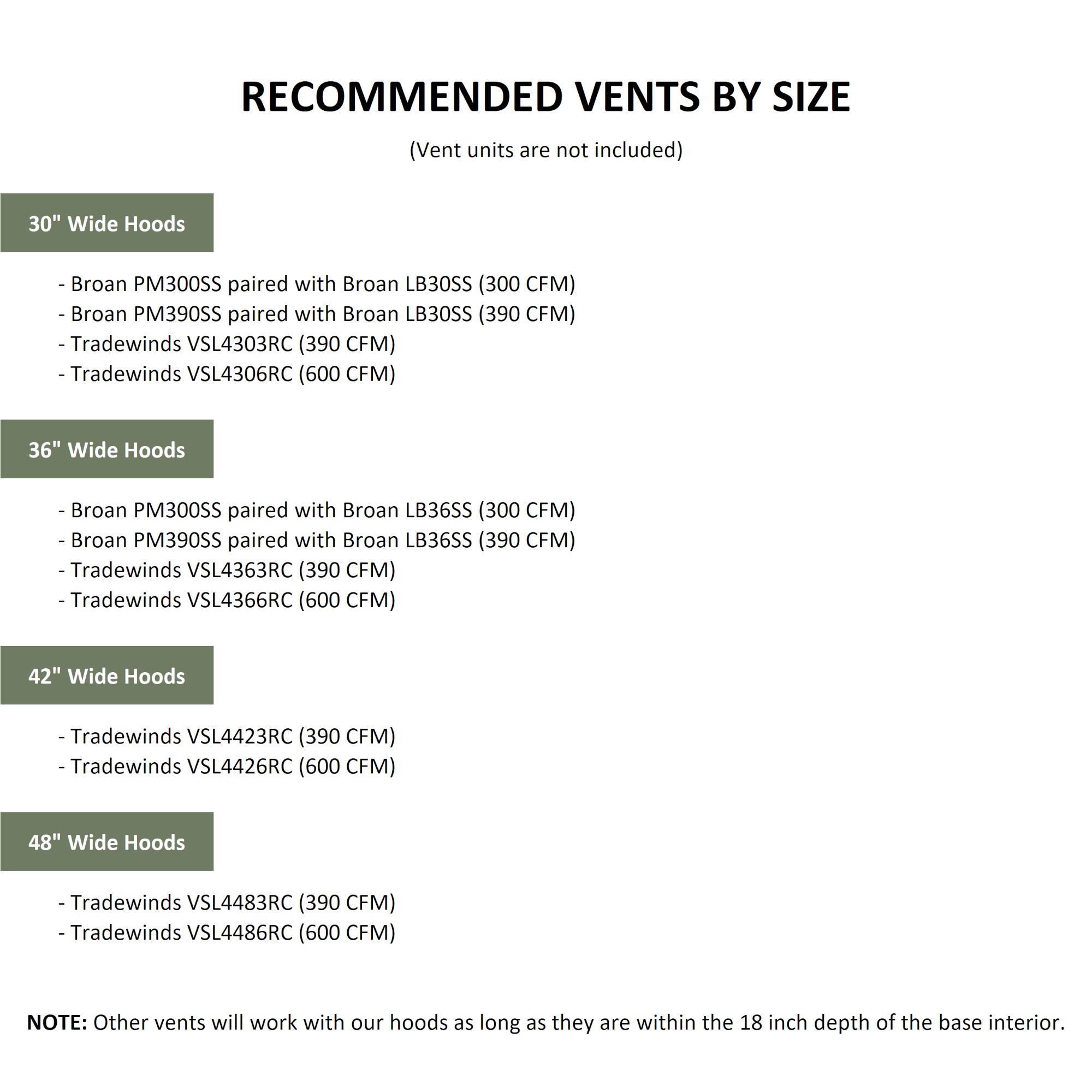 Vent units are not included. These are the recommendations per size.