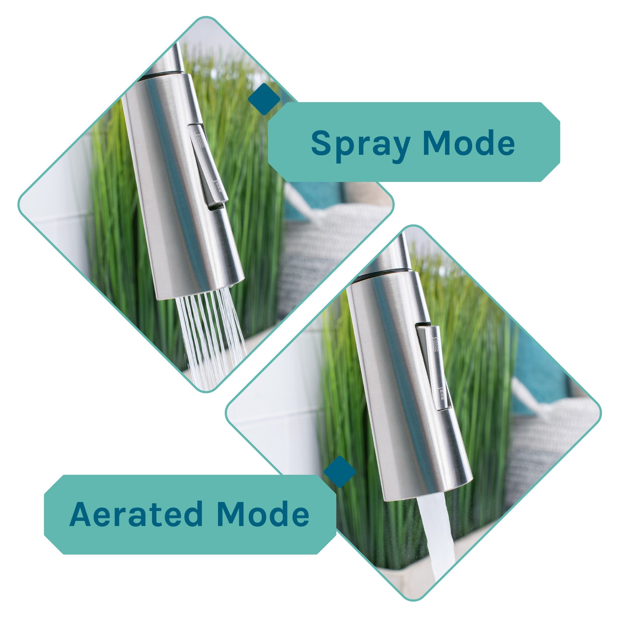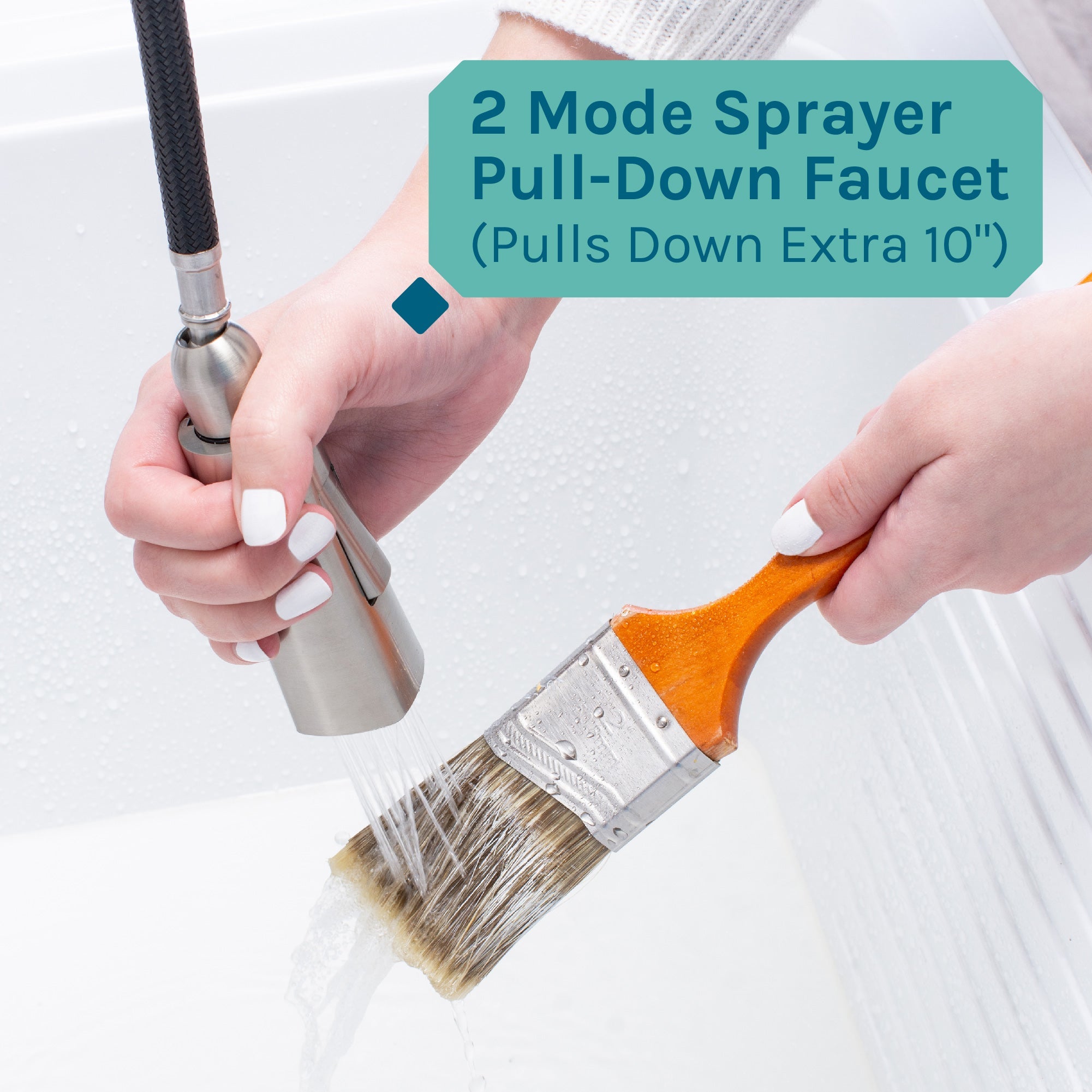 Our high-arc faucet gives you plenty of clearance for cleaning oversized items. The sprayer head features both stream and spray functions to help with filling and rinsing. This sprayer head pulls down to assist you with cleaning tools or hand-washing delicate laundry.