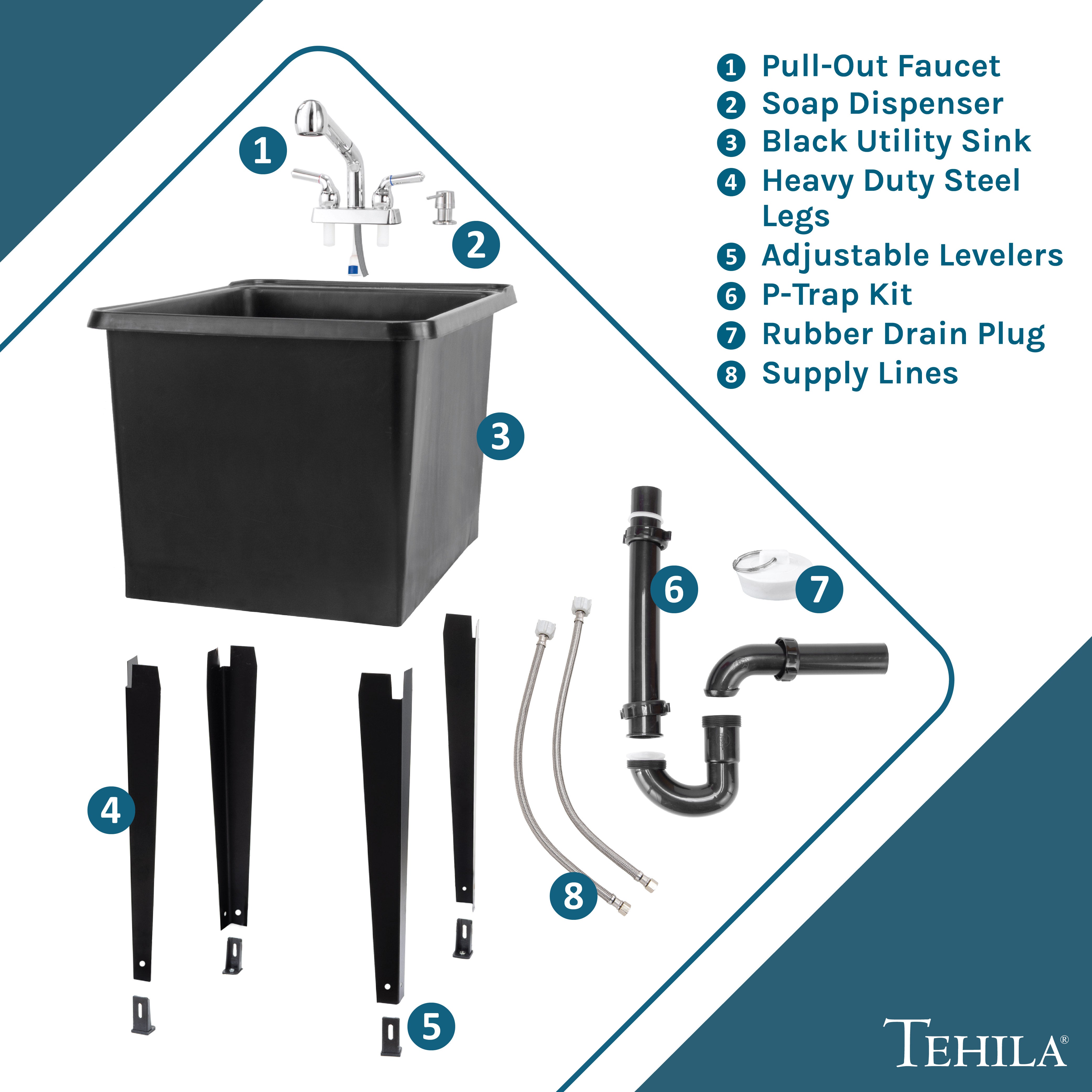 Tehila Space Saver Freestanding Black Utility Sink with Chrome Finish Pull-Out Faucet