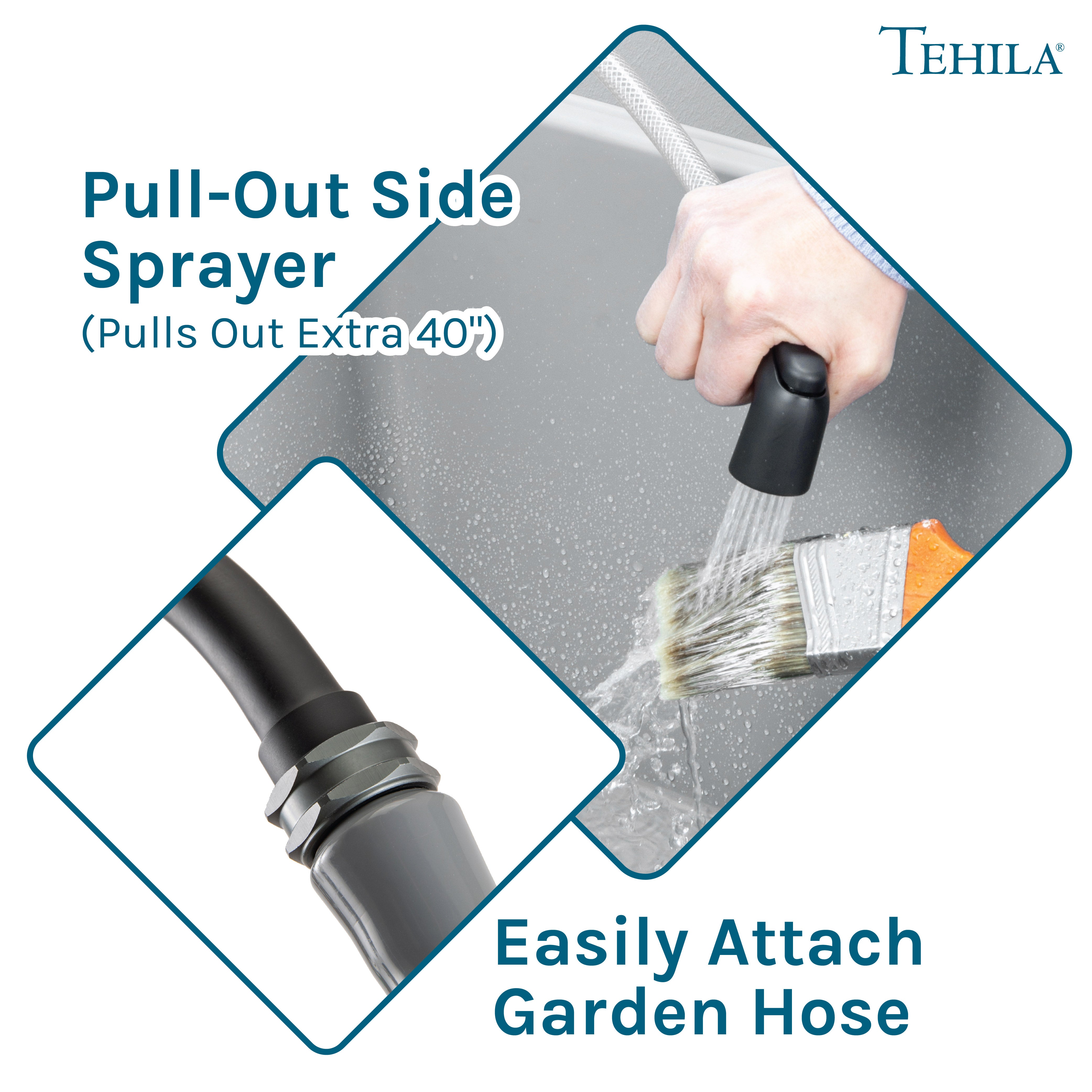 Tehila Space Saver Freestanding Grey Utility Sink with Black Finish Gooseneck Faucet and Side Sprayer