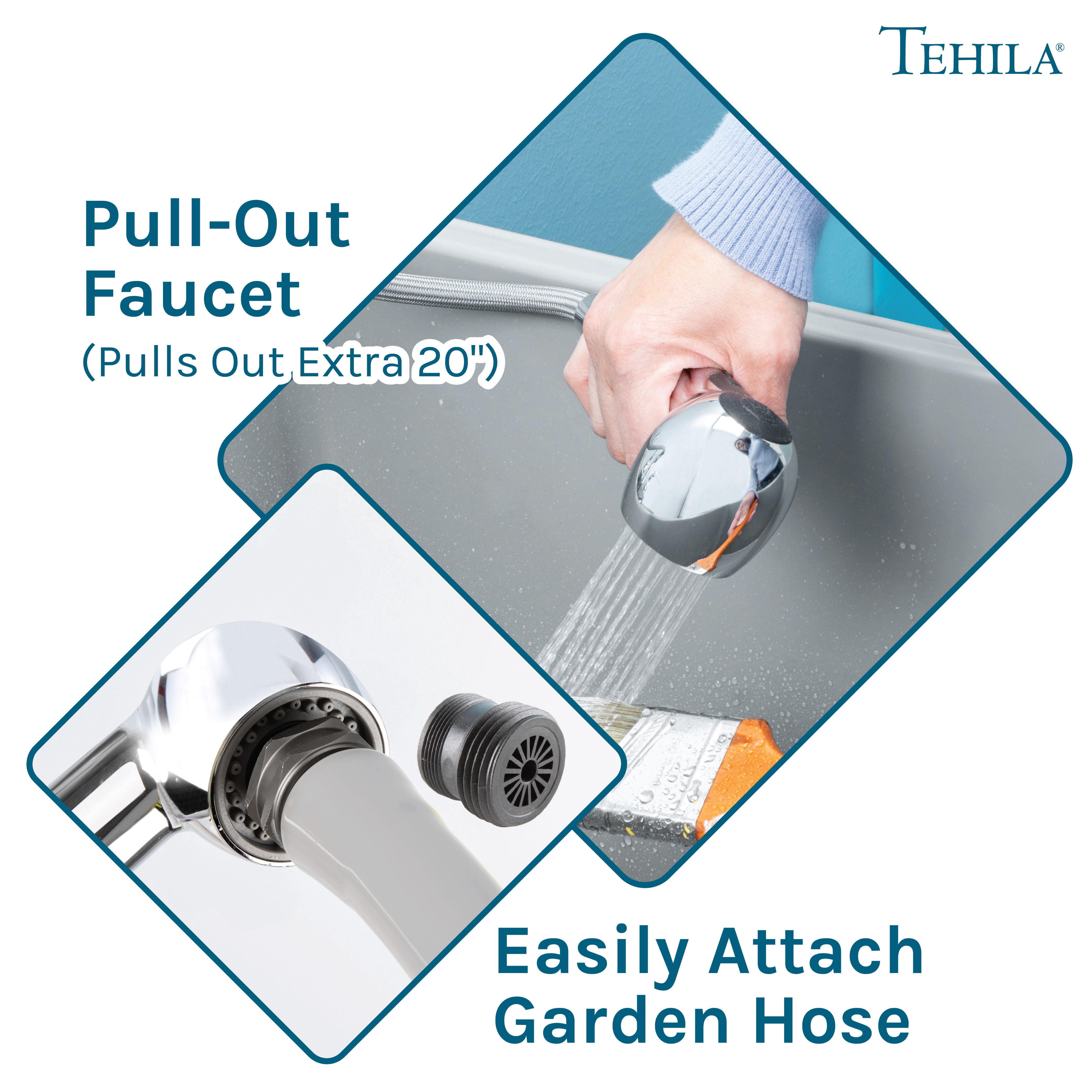 Tehila’s pull-out faucet was designed with you in mind. With the fully flexible pull-out sprayer hose, it’s easier than ever to wash dishes, soak clothes, or fill mop buckets. Dual handles ensure effortless temperature control, while clearly marked hot and cold symbols help you avoid confusion and make the faucet easy for kids to use. Choose from multiple color options for a stylish addition to any room, whether you’re replacing an existing faucet or setting up a new utility sink in your basement or garage.