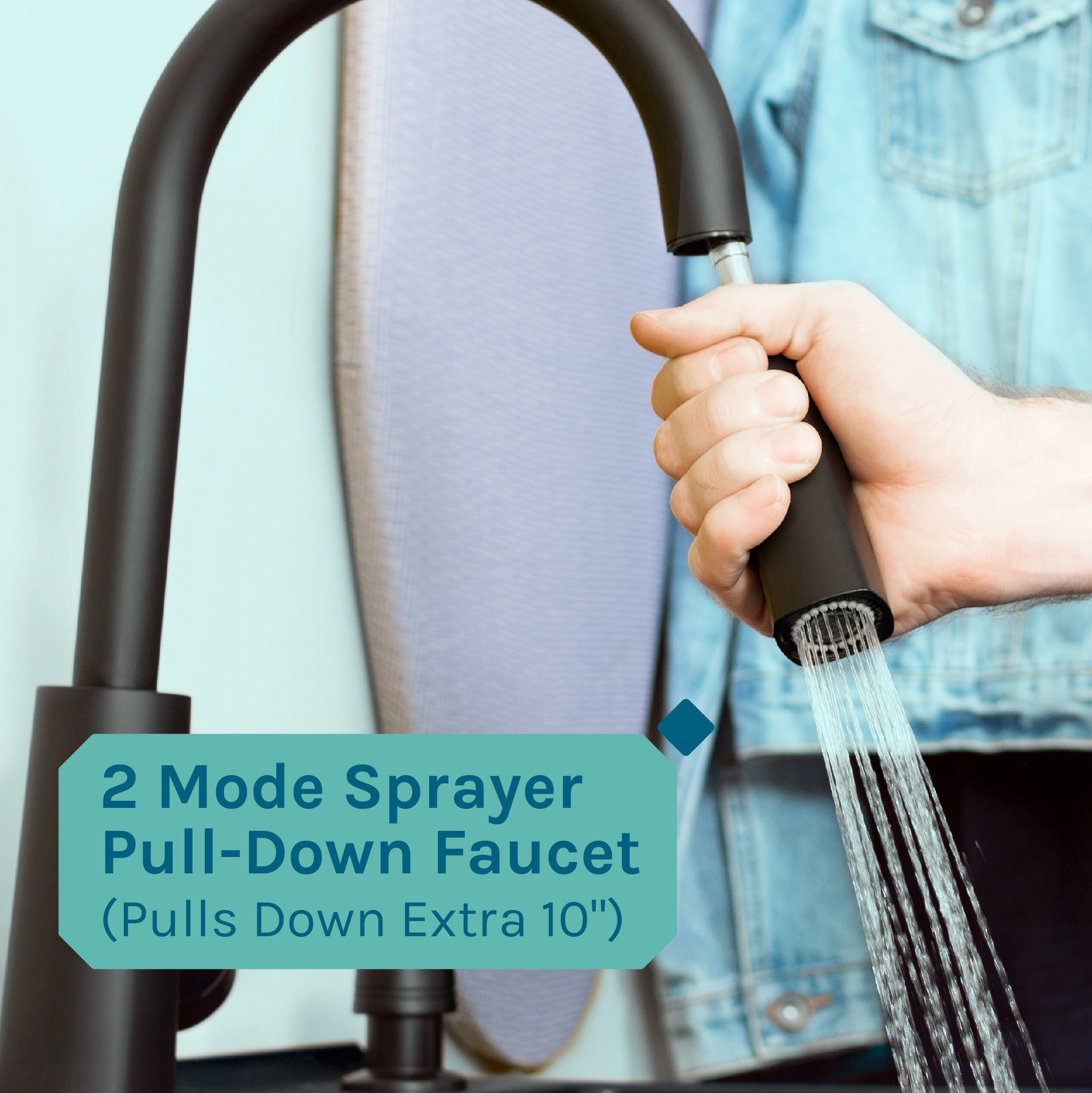 This high-arc faucet gives you plenty of clearance for cleaning oversized items. The sprayer head features both stream and spray functions to help with filling and rinsing. This sprayer head pulls down to assist you with cleaning tools or hand-washing delicate laundry. Additional soap dispenser holds 12 ounces of hand soap or detergent.
