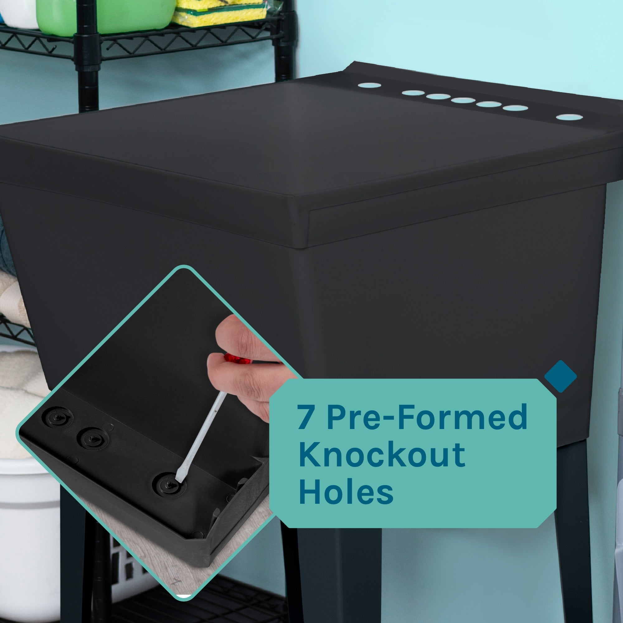 Our most popular laundry tub set. The 3.5-inch pitched back deck catches splashes and offers a convenient place for hand soap, stain remover sticks, or scouring pads to rest. Sturdy rust-proof steel legs attach easily while floor levelers increase stability. Adjust the levelers to the perfect height to level the tub on bumpy or uneven surfaces, such as the floor of a utility room, basement, or industrial workshop.
