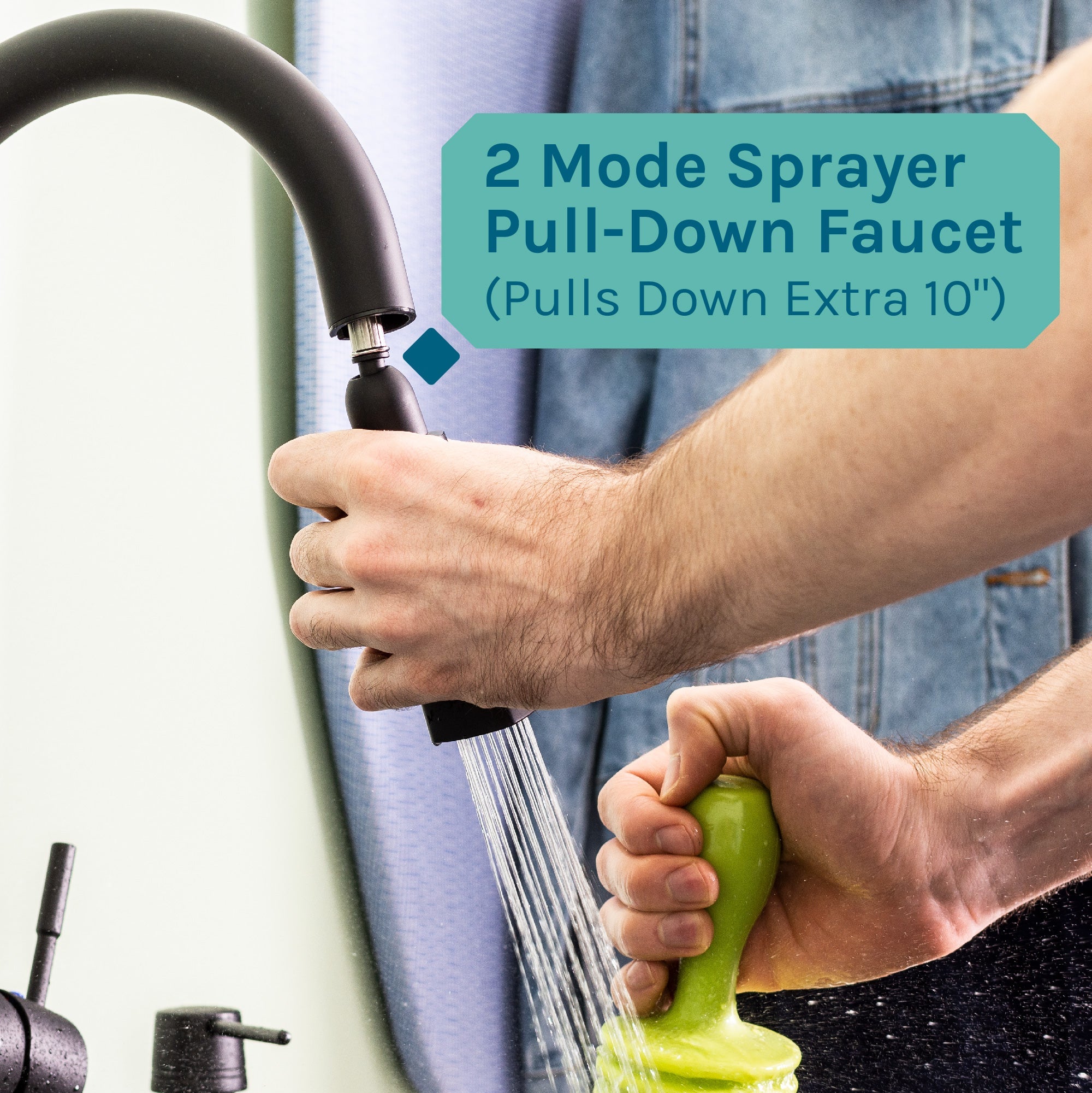 This high-arc faucet gives you plenty of clearance for cleaning oversized items. The sprayer head features both stream and spray functions to help with filling and rinsing. This sprayer head pulls down to assist you with cleaning tools or hand-washing delicate laundry. Additional soap dispenser holds 12 ounces of hand soap or detergent.