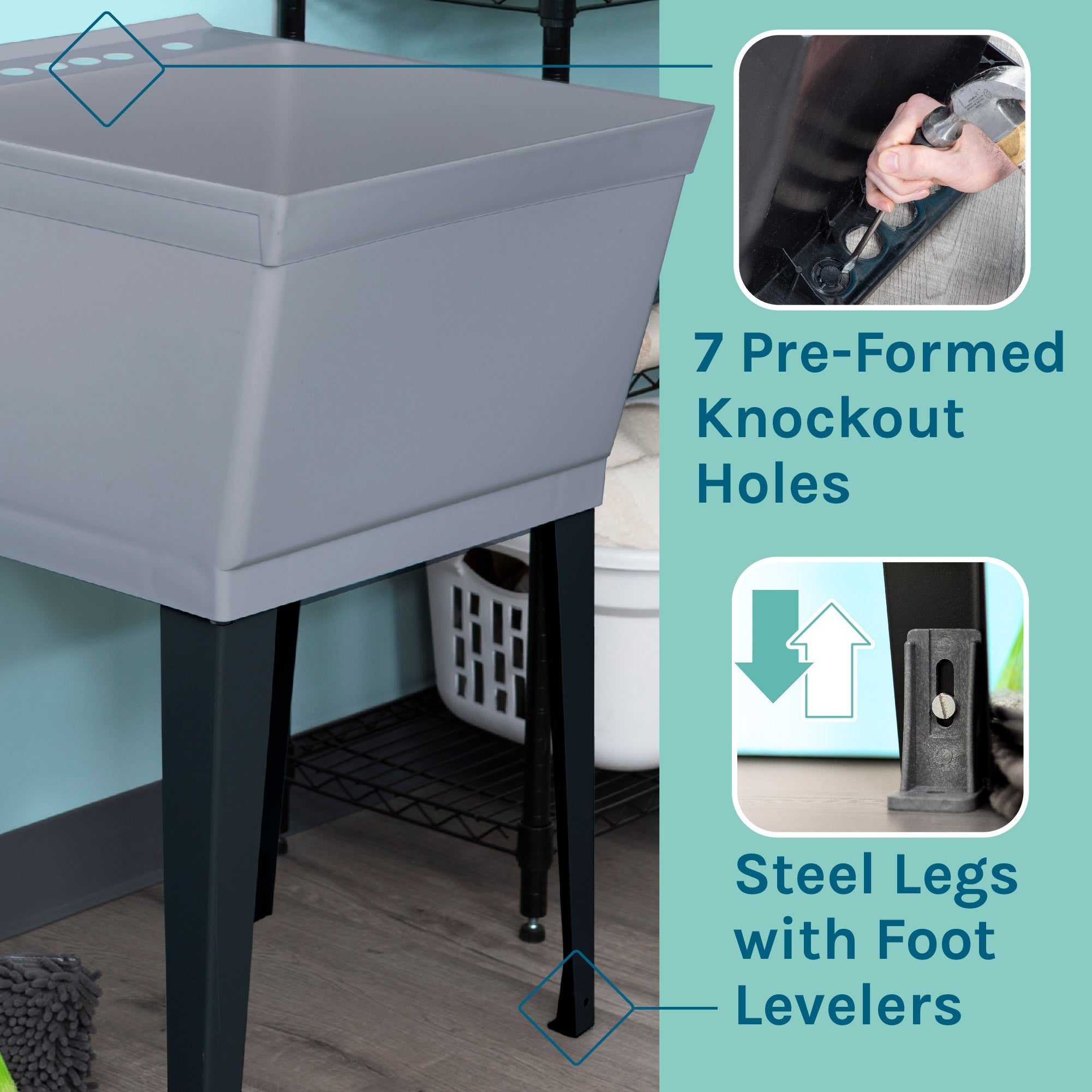 Our most popular laundry tub set. The 3.5-inch pitched back deck catches splashes and offers a convenient place for hand soap, stain remover sticks, or scouring pads to rest. Sturdy rust-proof steel legs attach easily while floor levelers increase stability. Adjust the levelers to the perfect height to level the tub on bumpy or uneven surfaces, such as the floor of a utility room, basement, or industrial workshop.