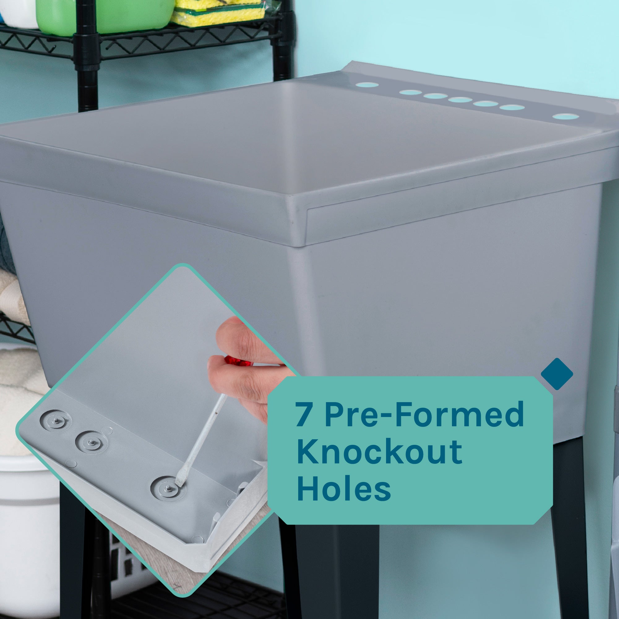 Our most popular laundry tub set. The 3.5-inch pitched back deck catches splashes and offers a convenient place for hand soap, stain remover sticks, or scouring pads to rest. Sturdy rust-proof steel legs attach easily while floor levelers increase stability. Adjust the levelers to the perfect height to level the tub on bumpy or uneven surfaces, such as the floor of a utility room, basement, or industrial workshop.