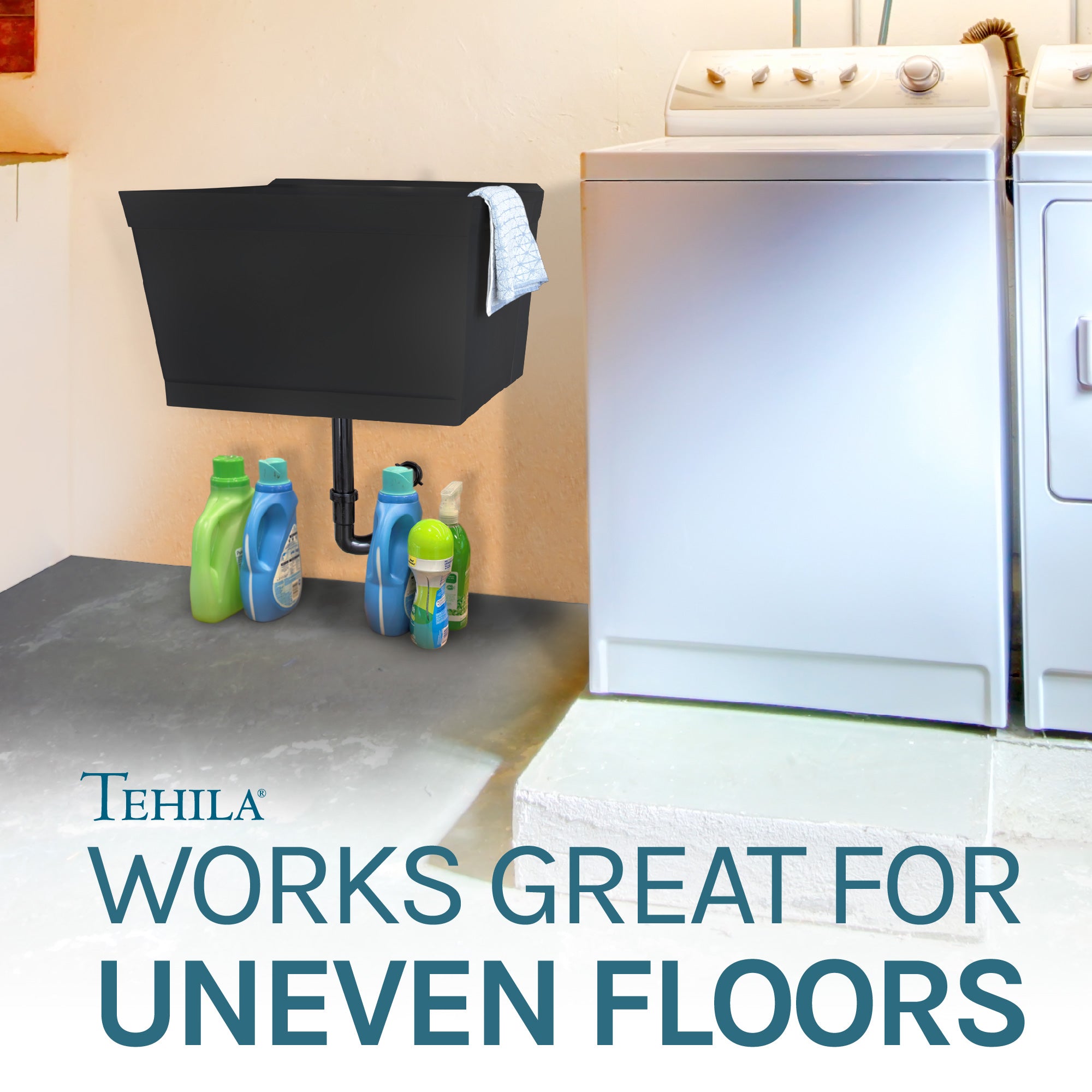 The Tehila floating tub kit’s wall-mounted design takes up less floor space than a standard utility sink, making it easy to clean. There are no legs to wipe down or to get in the way when cleaning the floor.