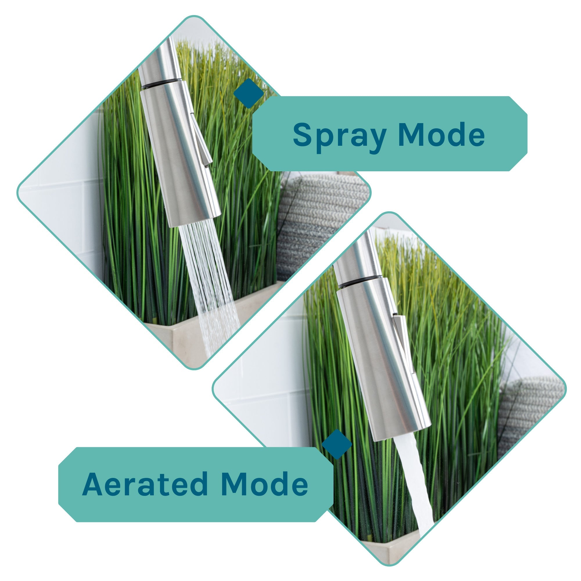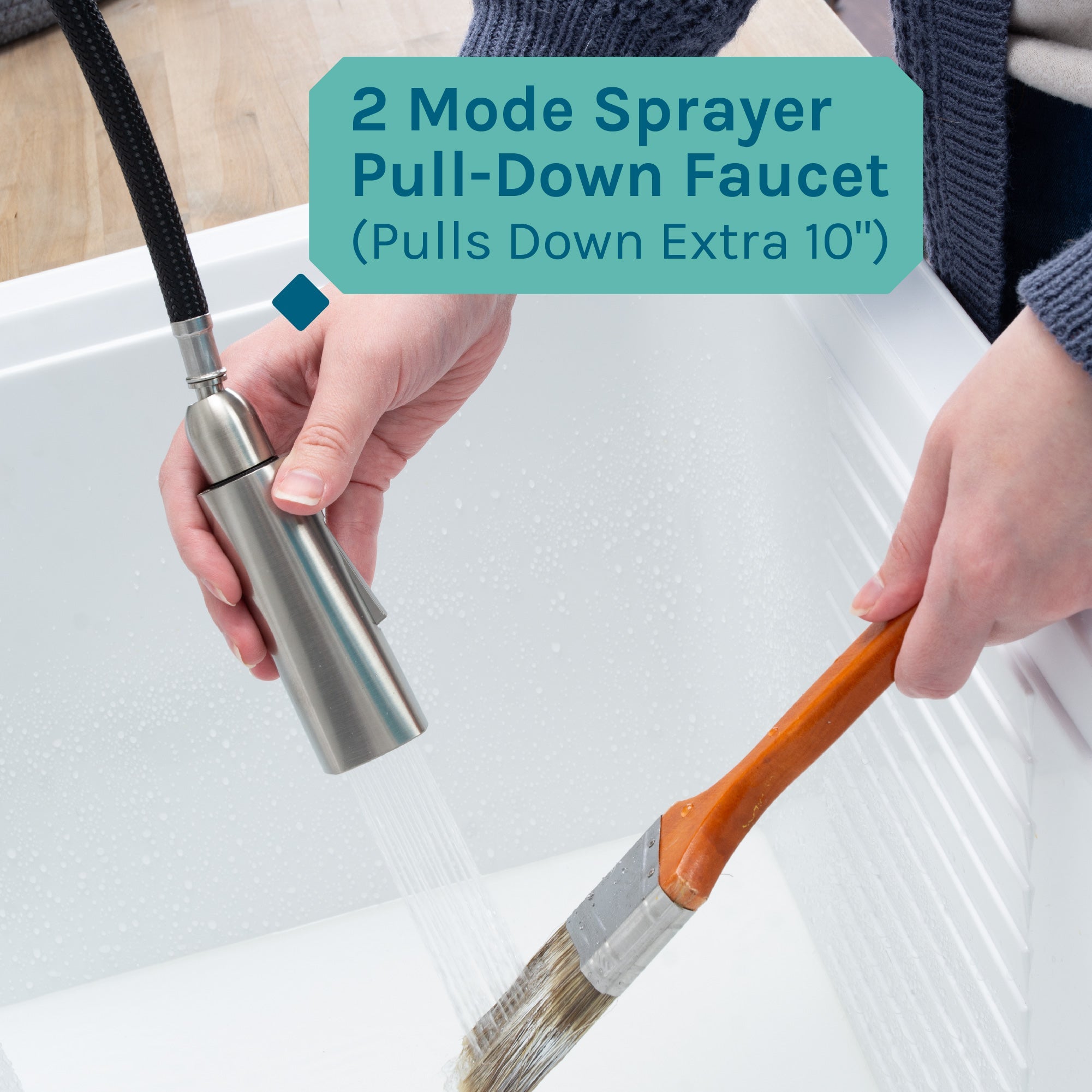 Our high-arc faucet gives you plenty of clearance for cleaning oversized items. The sprayer head features both stream and spray functions to help with filling and rinsing. This sprayer head pulls down to assist you with cleaning tools or hand-washing delicate laundry.
