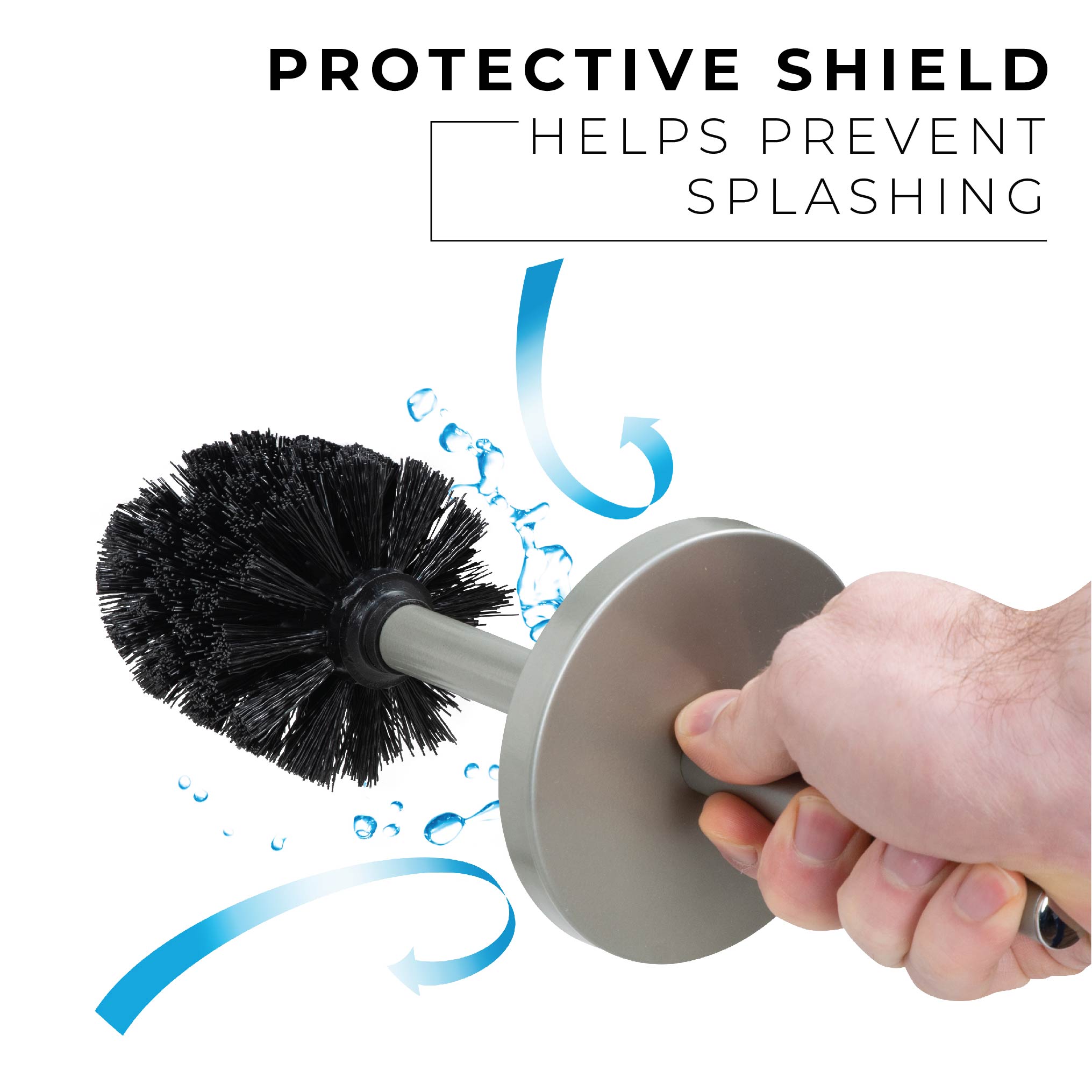 The handle and brush connect into one piece with an option to insert the round shield to protect against unwanted splashing. The convenient design works well with any bathroom decor.