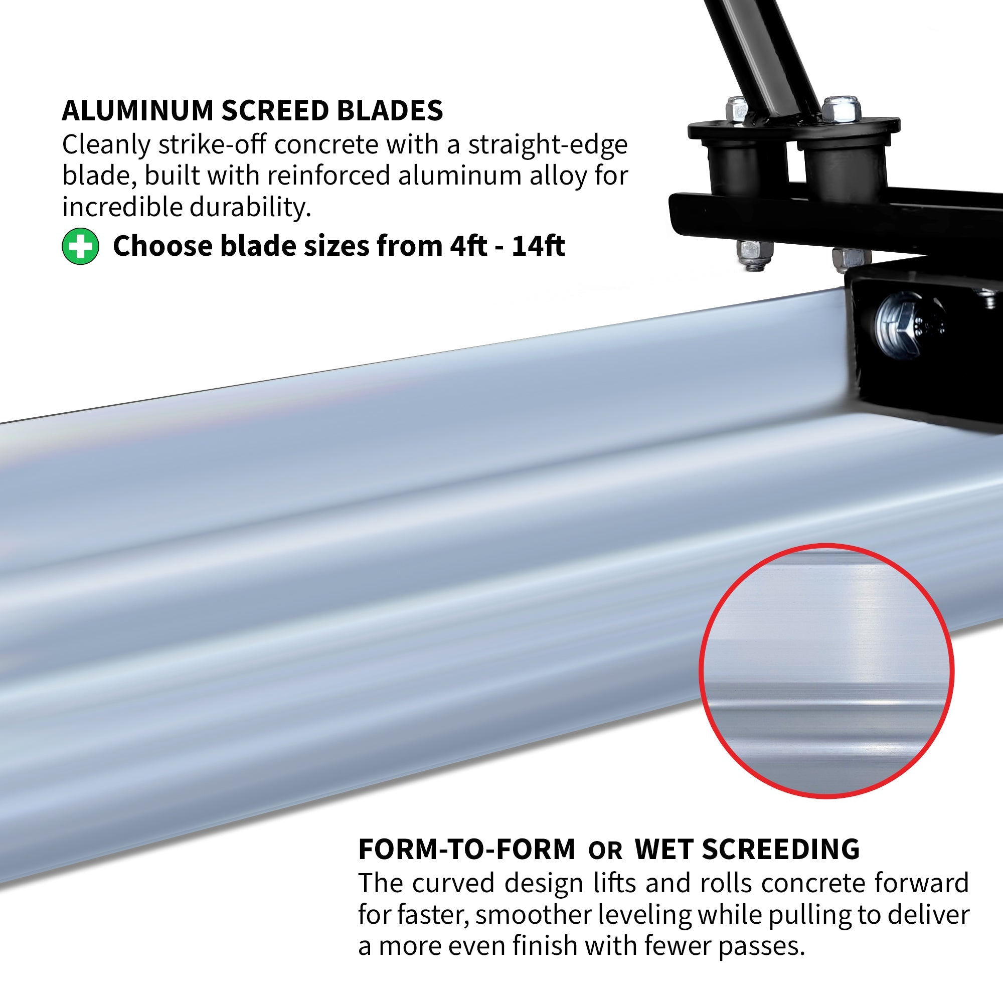 Available in sizes from 4FT to 14FT, the reinforced aluminum screed board glides effortlessly across fresh pours with minimal drag.