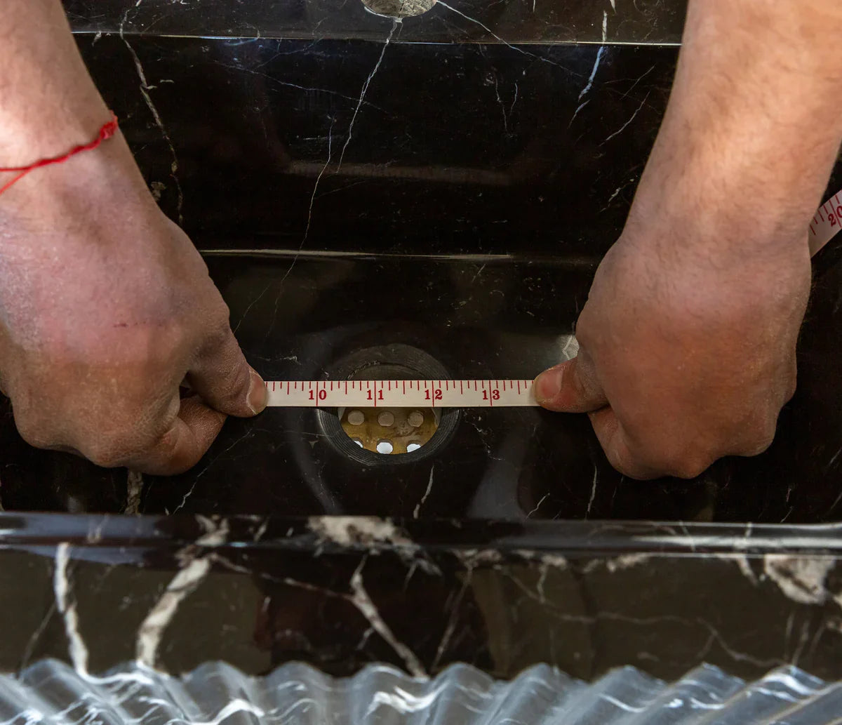 Hand carved natural marble construction. Side to side width is 12 inches, Front to back length is 19 inches, Basin height 7 inches, Drain hole 1.5 inches. Its curved edges and smooth construction facilitate the cleaning and maintenance of this sink bowl. Not easy to produce cracks, refused to dirt deposition, durable and not deformed. No overflow and very resistant to drains.