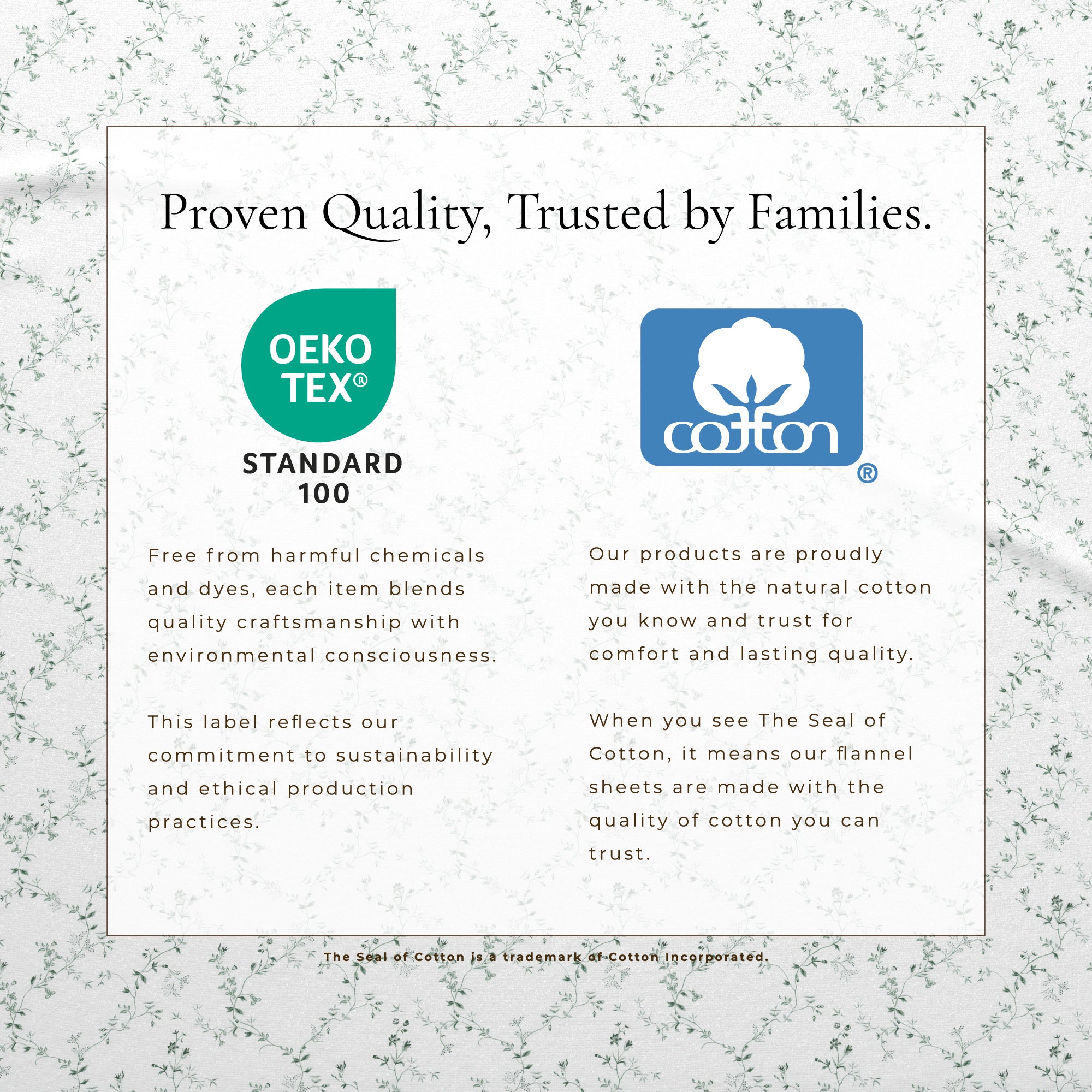 Fall to sleep in ultra-soft, breathable, and quality Turkish cotton flannel sheets. This collection features floral prints that will add a subtle update to your bedroom decor year-round. These 100% cotton sheets are double-brushed for softness and durability to ensure you have a set that offers comfort every night. Flannel sheets offer warmth for even the coldest of nights, so add these luxurious cotton flannel sheets to your bed and experience true comfort. Products that look good, feel good, and are made well, so you can trust you're getting high-quality products. These cotton flannel sheets are Standard 100 Certified by OEKO-TEX®.