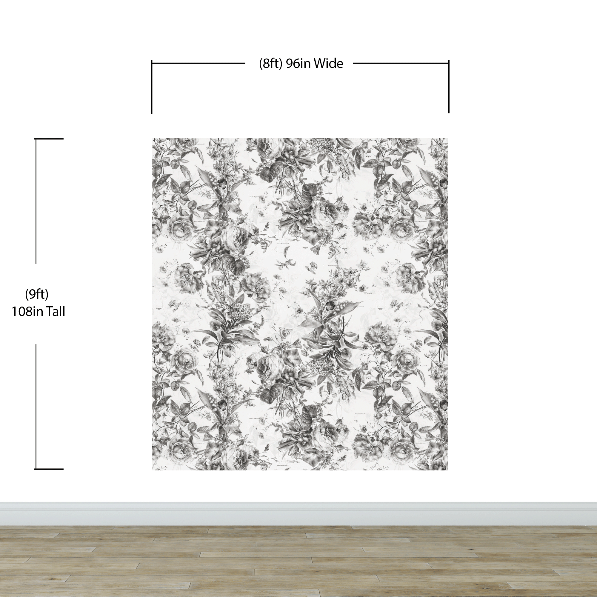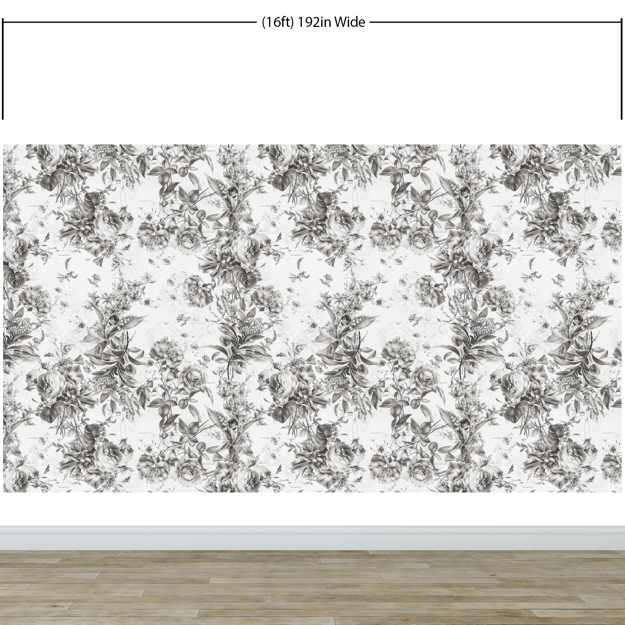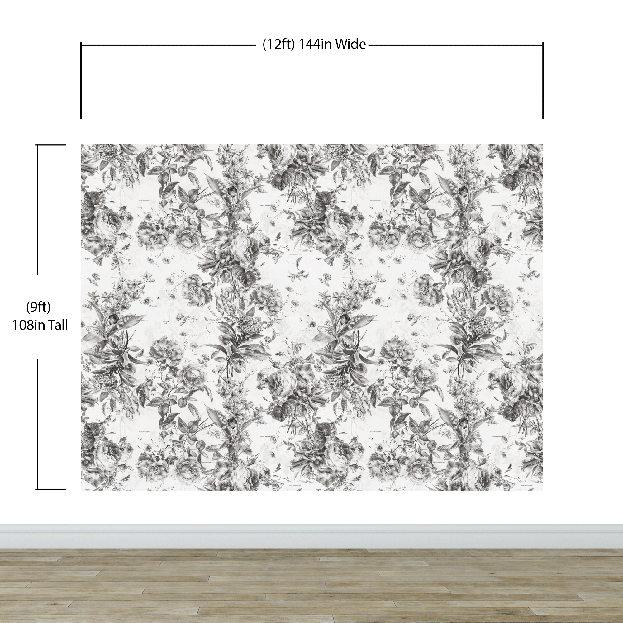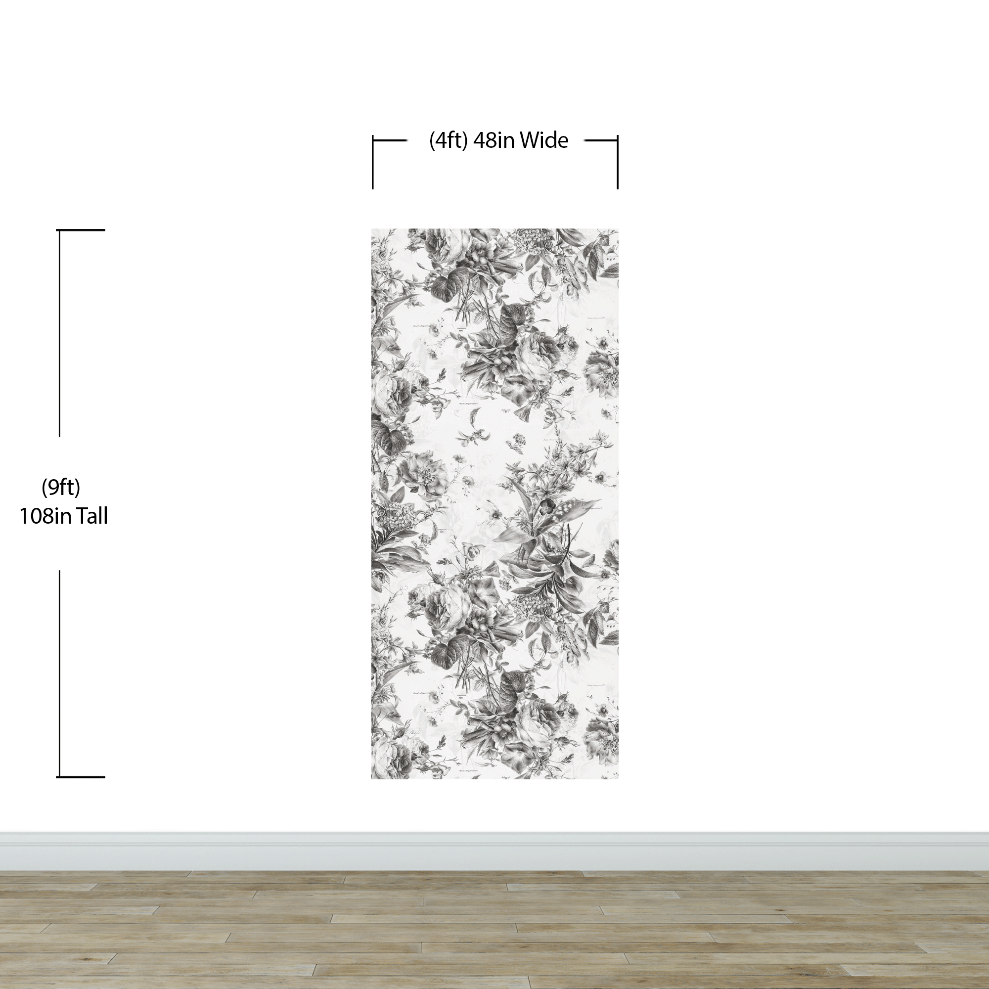 Vintage Flower Pattern Illustration Wall Mural. Black and White Peel and Stick Wallpaper. #6443