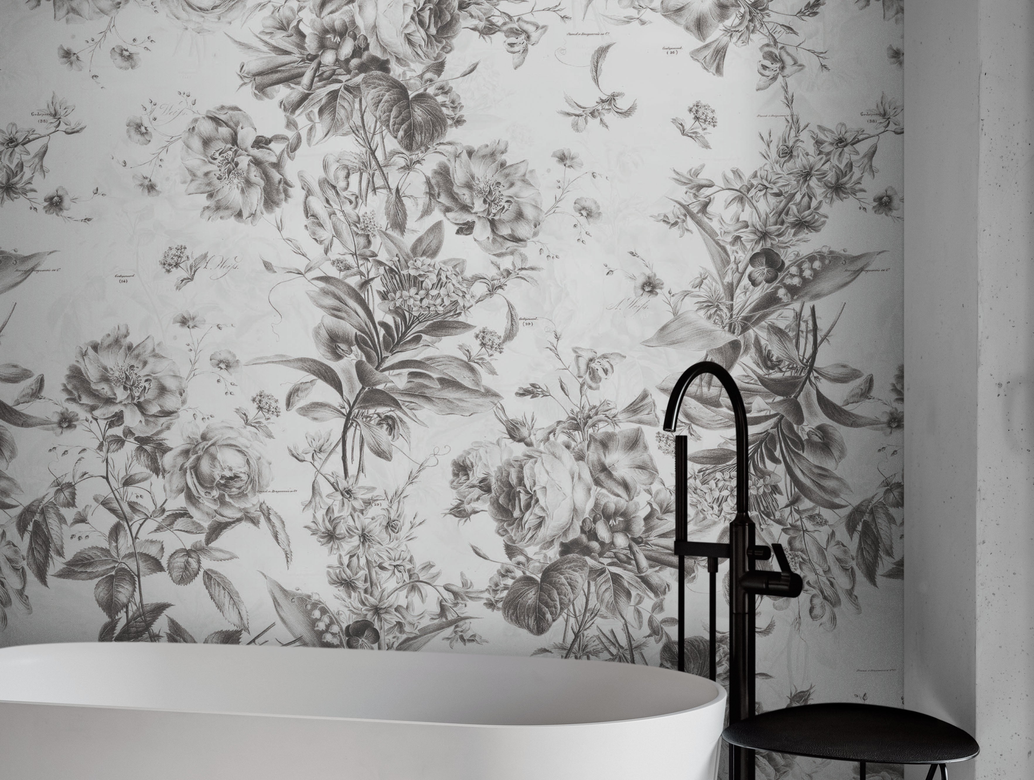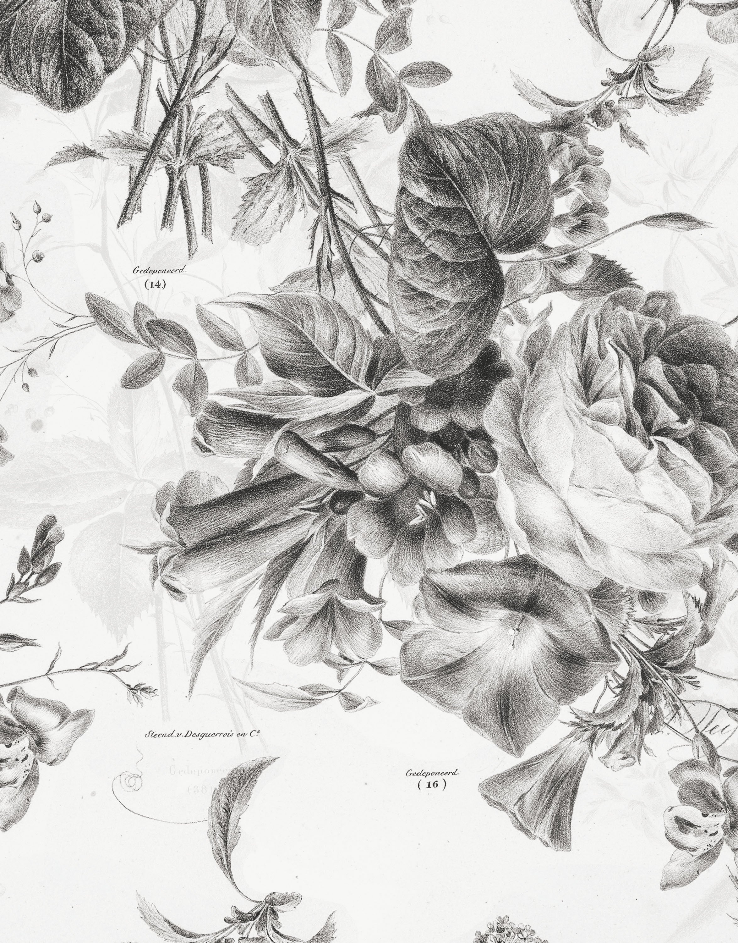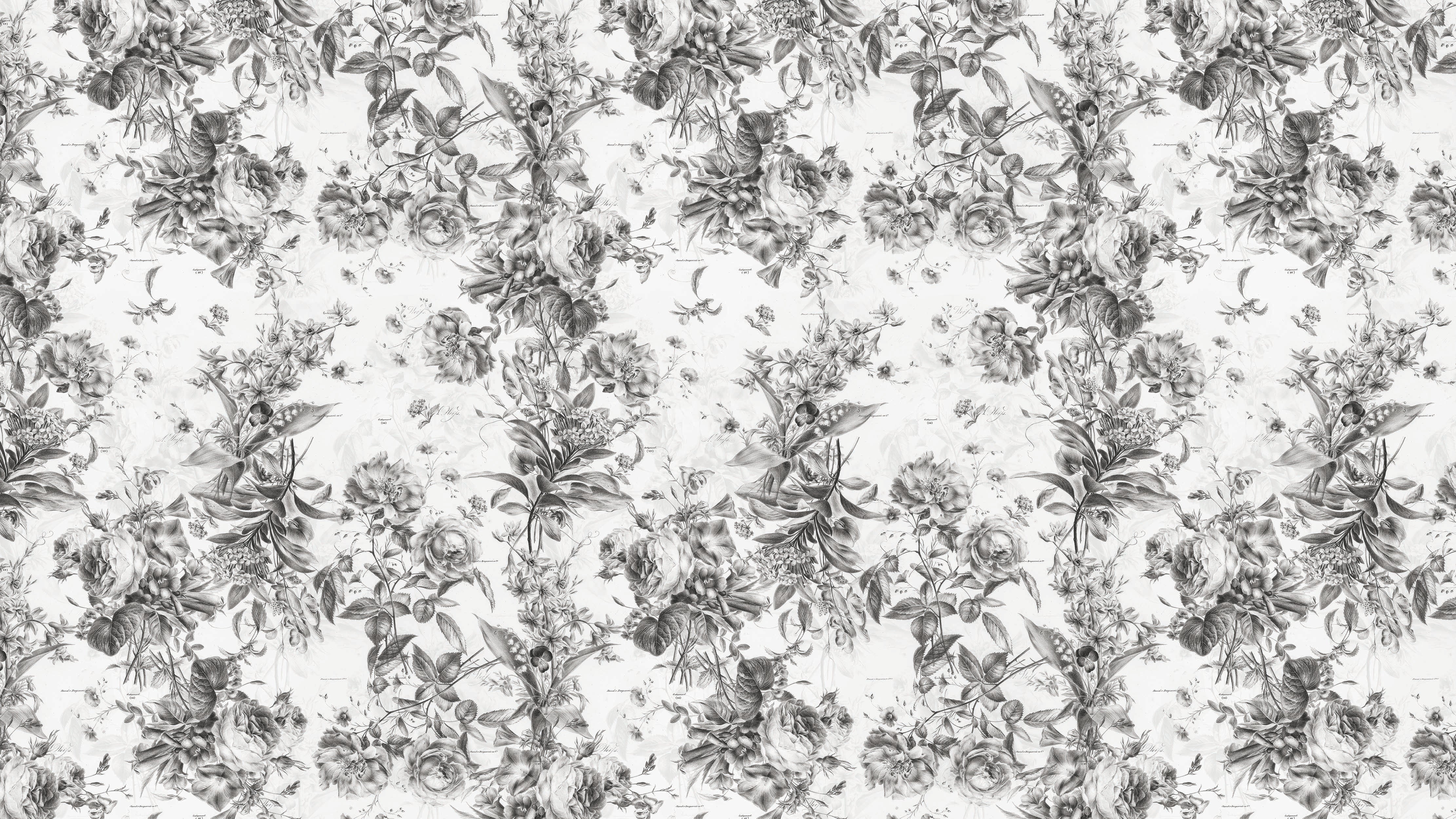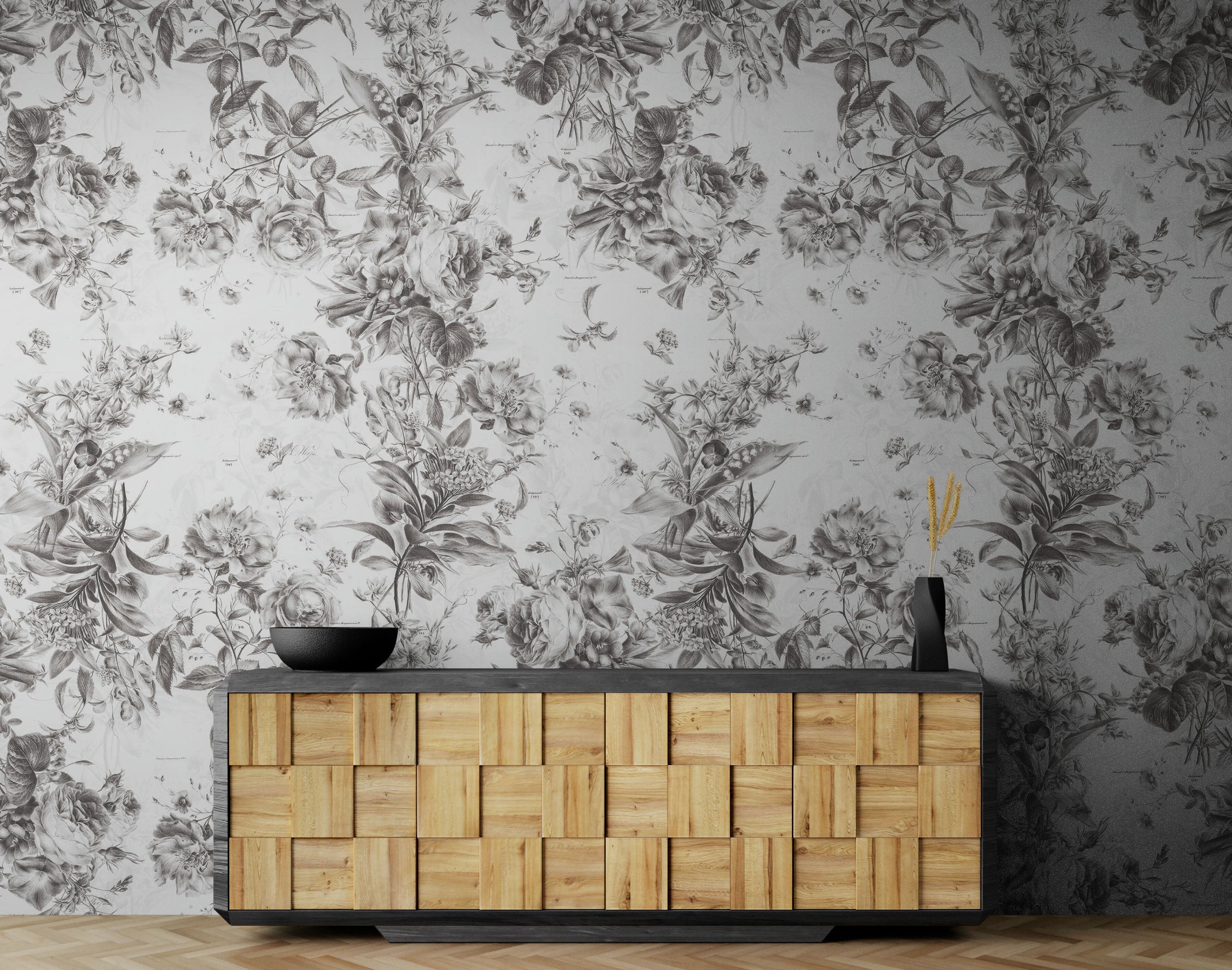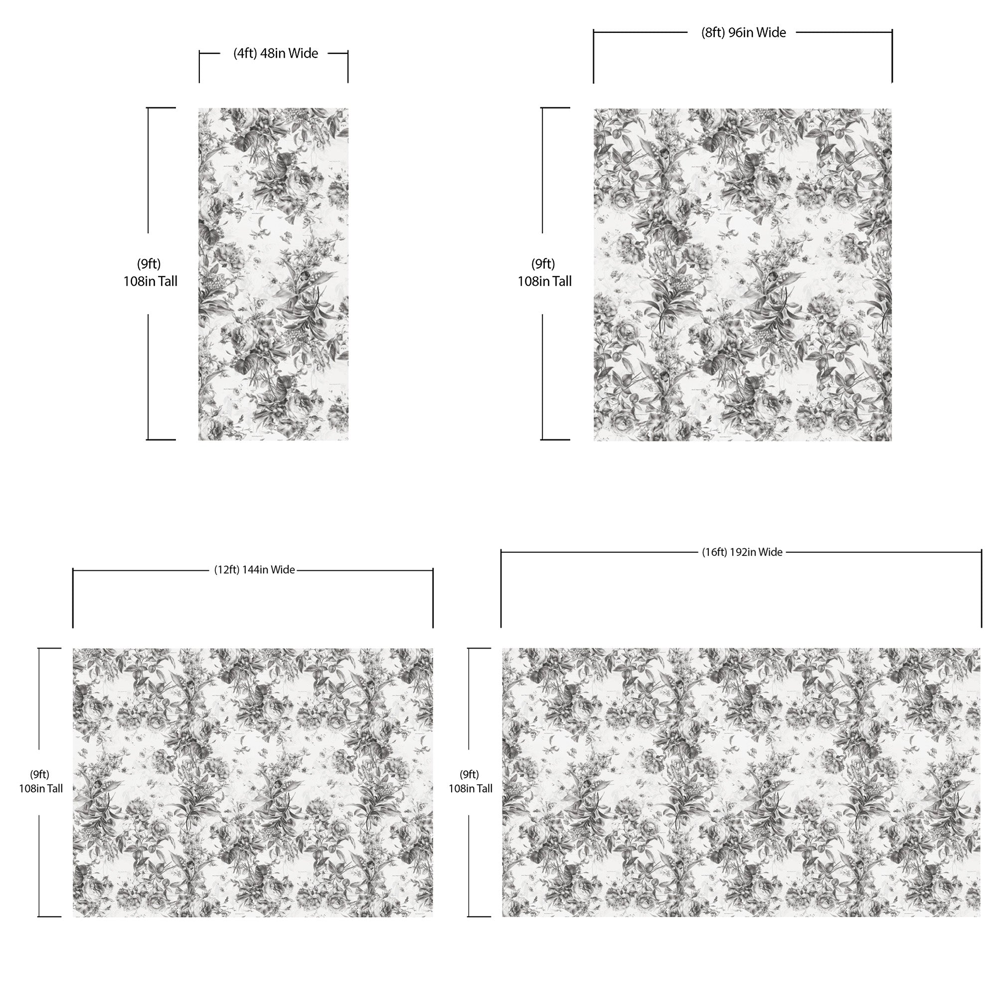 Vintage Flower Pattern Illustration Wall Mural. Black and White Peel and Stick Wallpaper. #6443