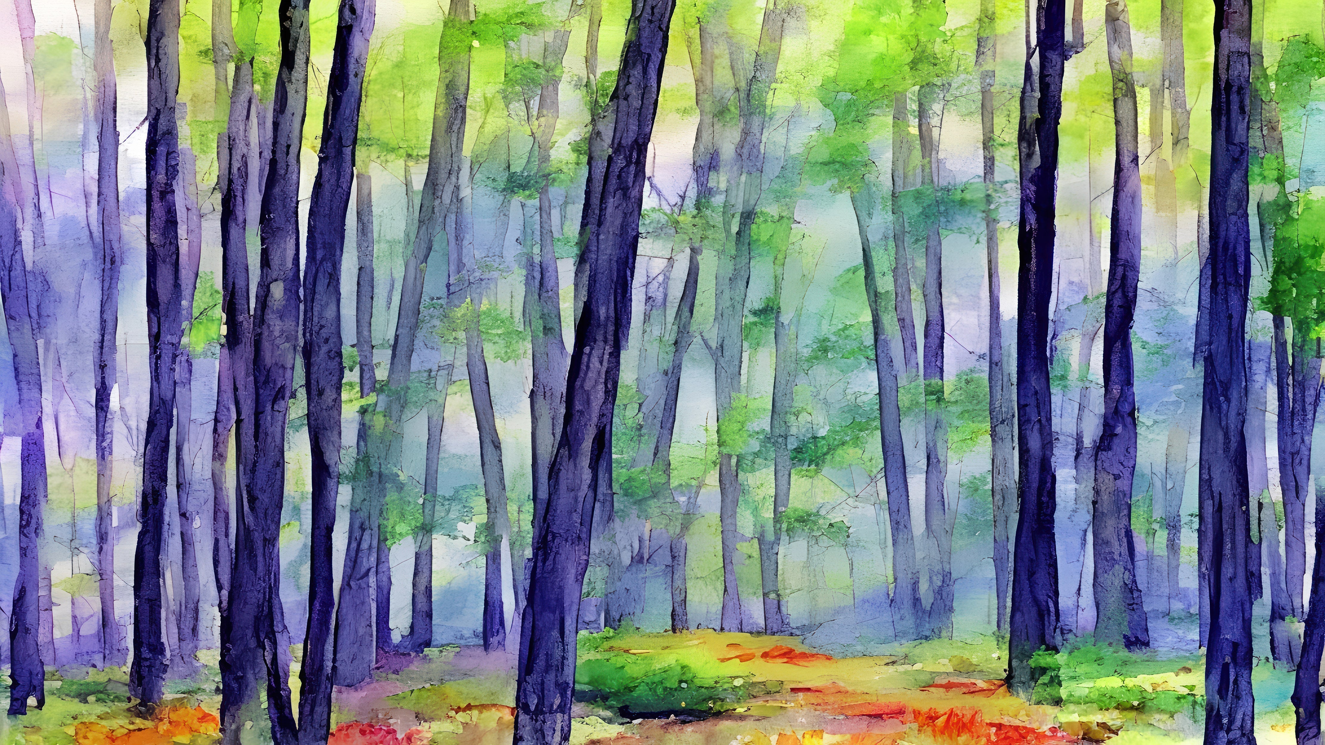 This colorful green watercolor painting of a forest depict a lush, verdant forest with various shades of green. The trees and foliage painted in different shades of green, purple, blue and red to create depth and dimension. The watercolor style gives the image a soft, ethereal quality.