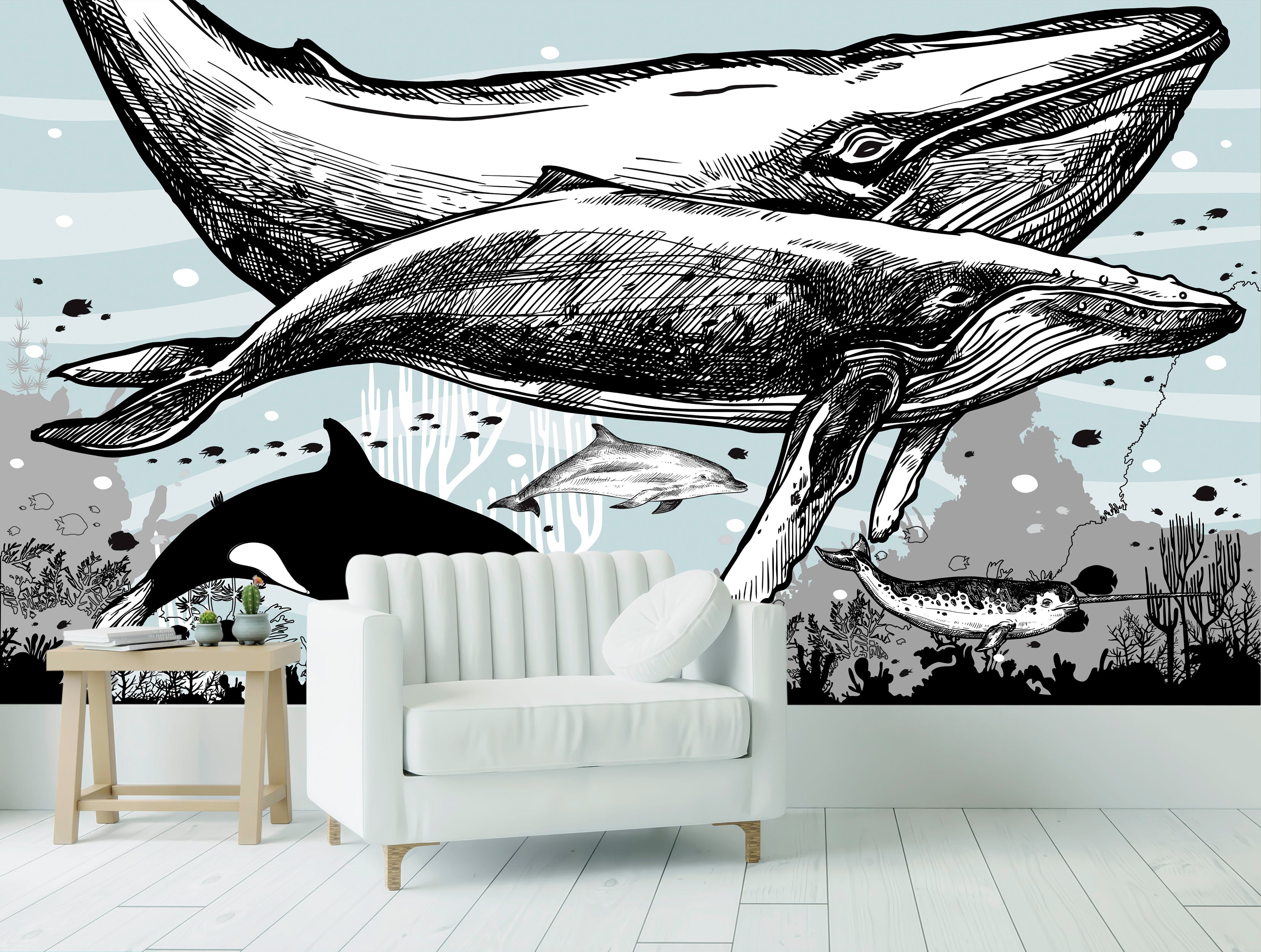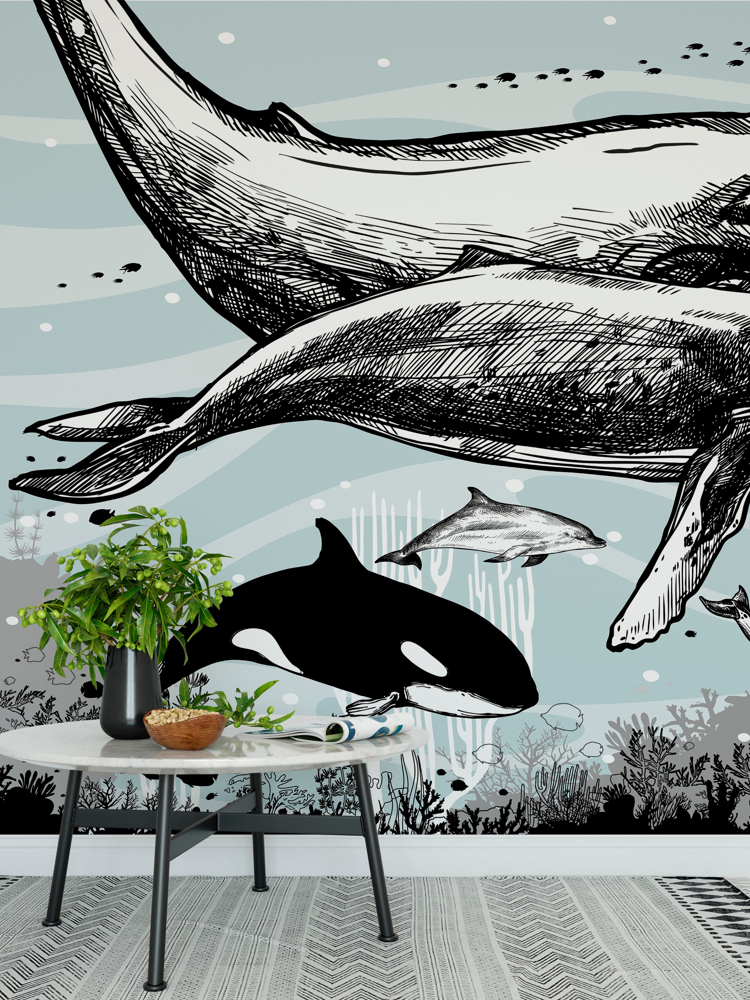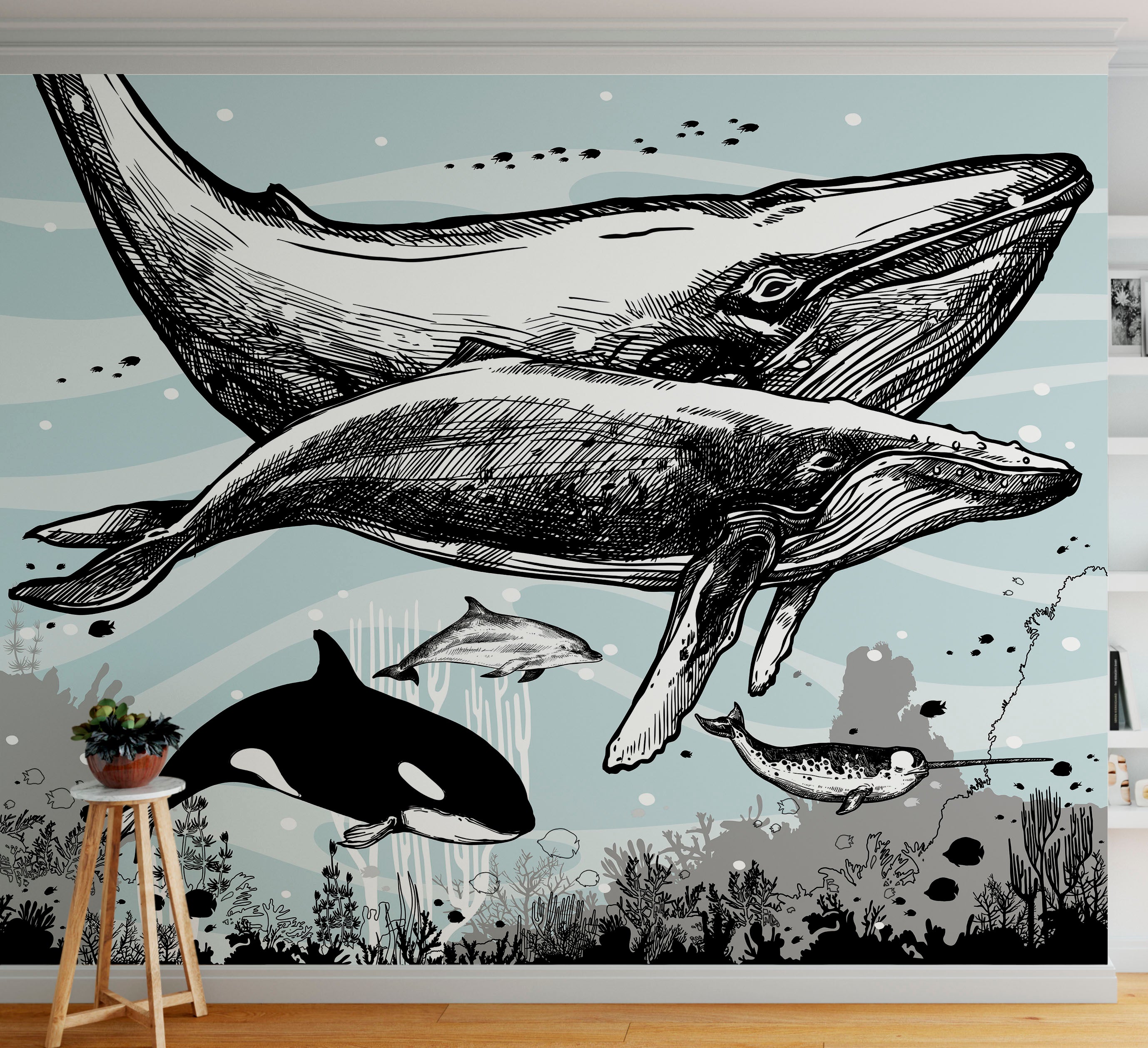 Whale, Dolphin, Killer Whale Wall Mural. Underwater Sea Life Drawing Design. Peel and Stick Wall Mural. #6354