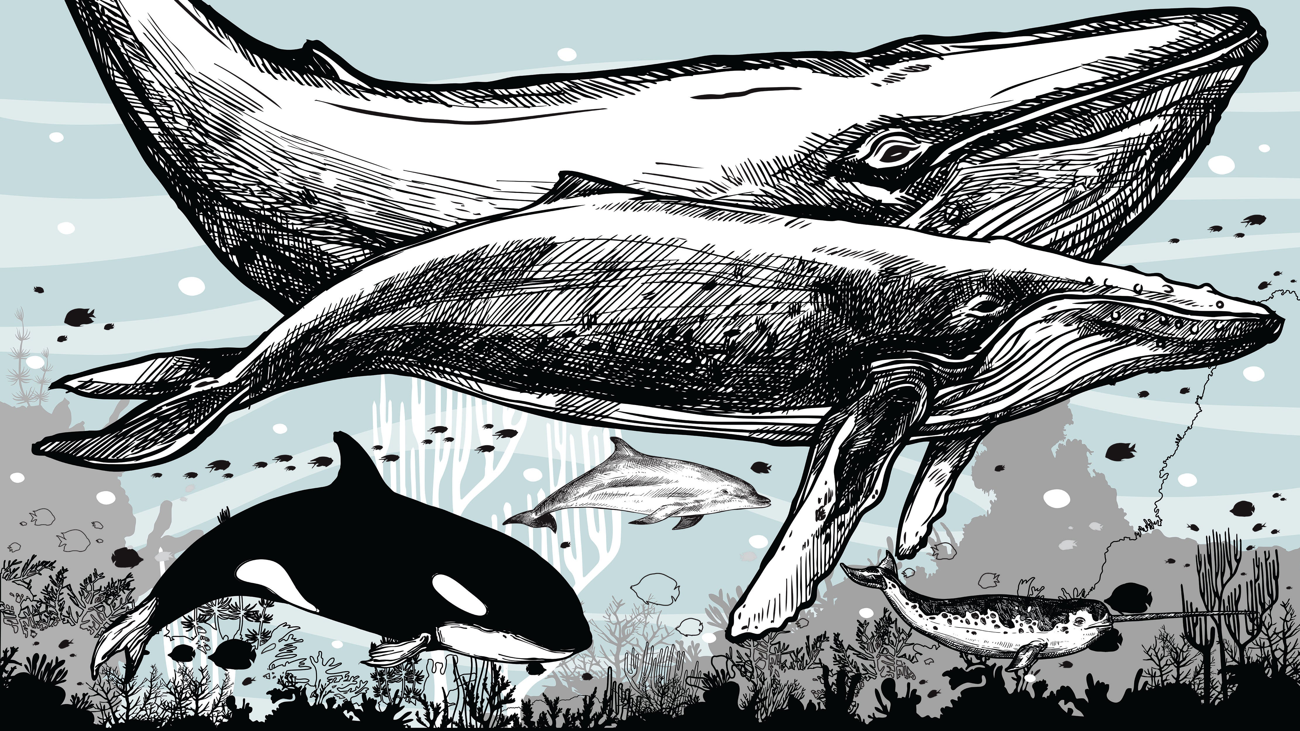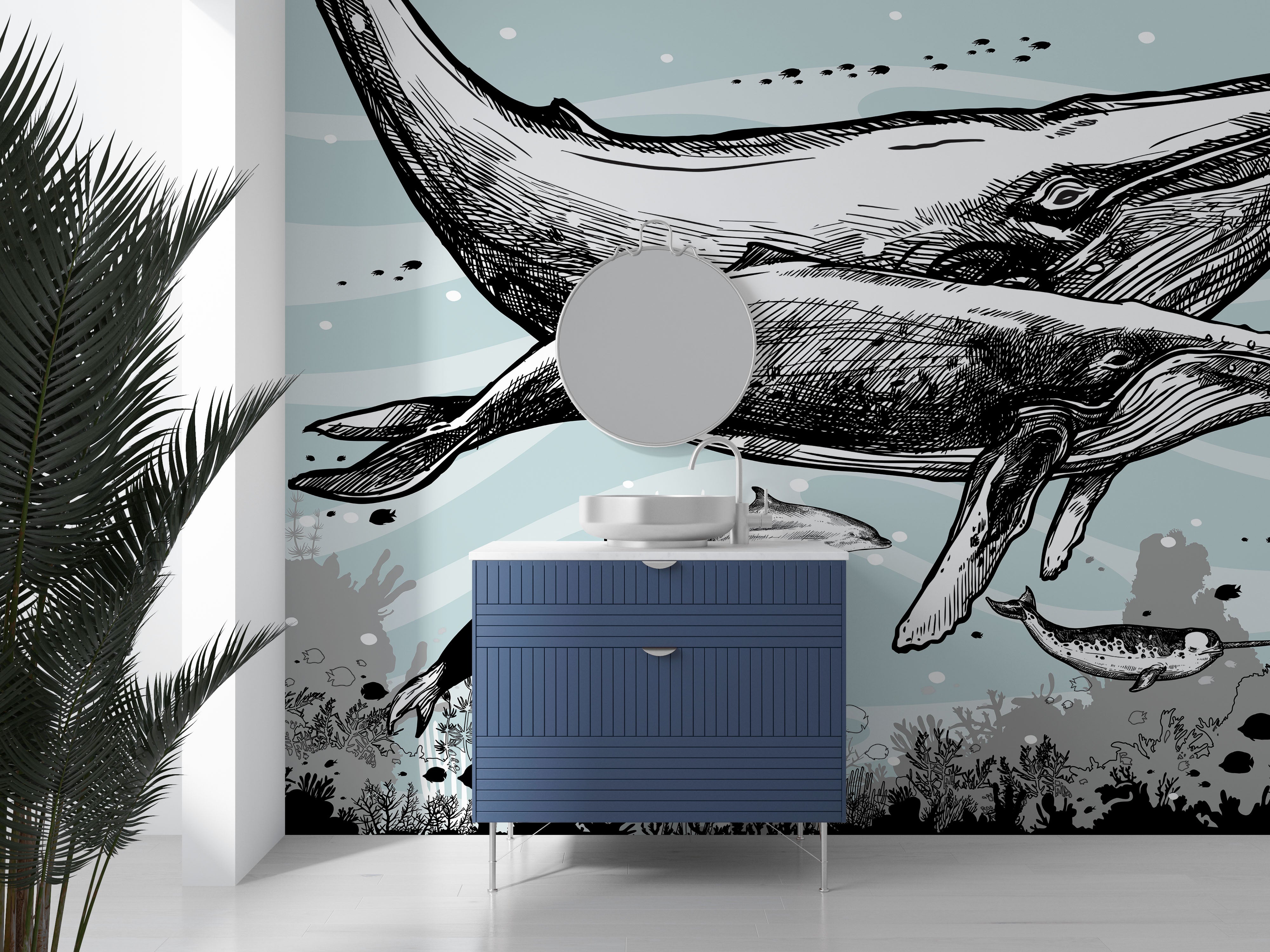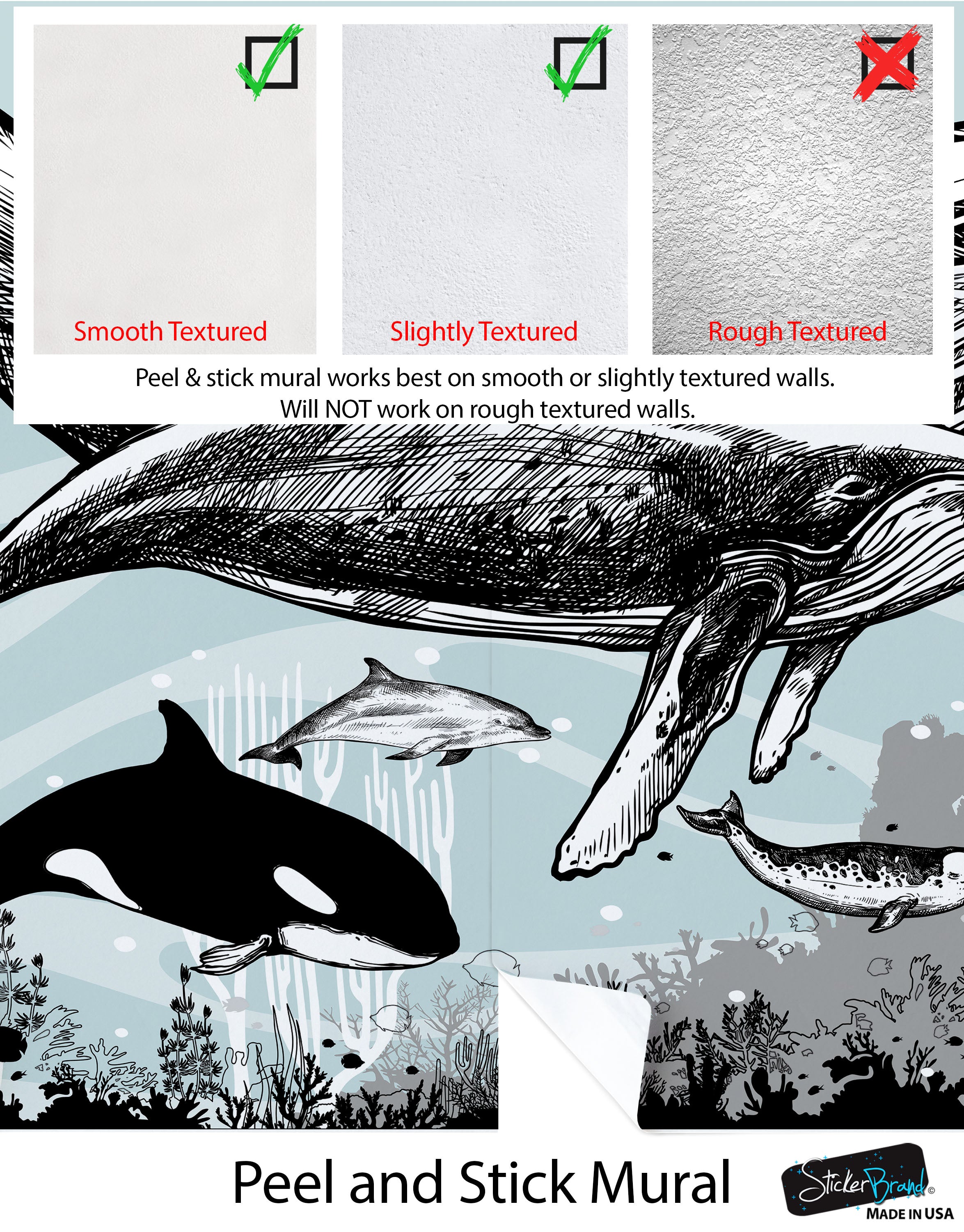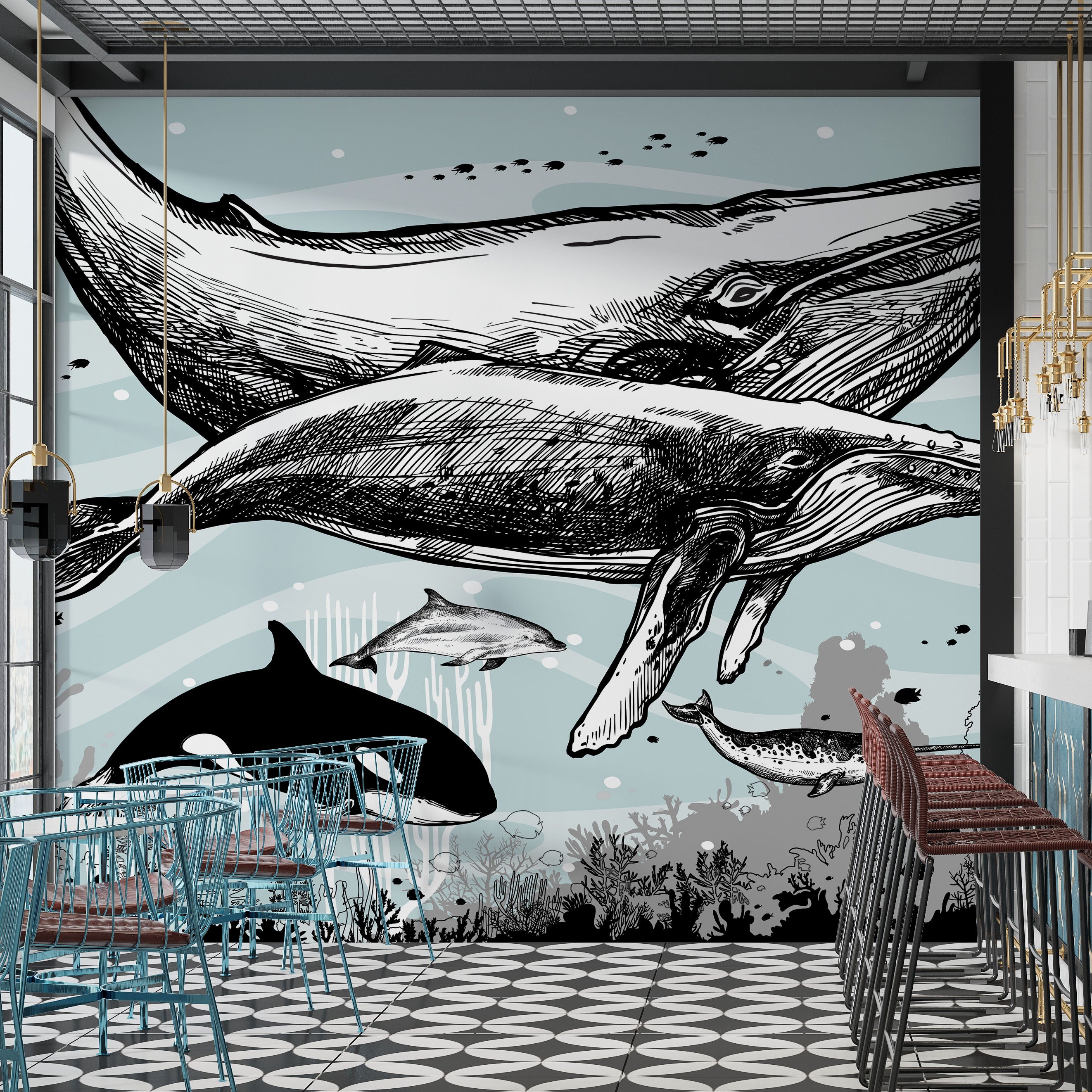 Whale, Dolphin, Killer Whale Wall Mural. Underwater Sea Life Drawing Design. Peel and Stick Wall Mural. #6354