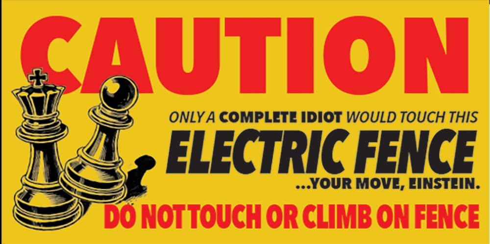 Because some people need more than a polite “keep out.” This sign doesn’t just warn you—it roasts you first. With bold red letters and a reminder that only a complete idiot would touch an electric fence, it’s basically the farm version of a friend smacking your hand away from a hot stove. The chess pieces add flair, because shocking yourself on a live fence is the worst opening move since pawning your queen. Put it up, sit back, and let the sign do the trash talk: your move, Einstein.