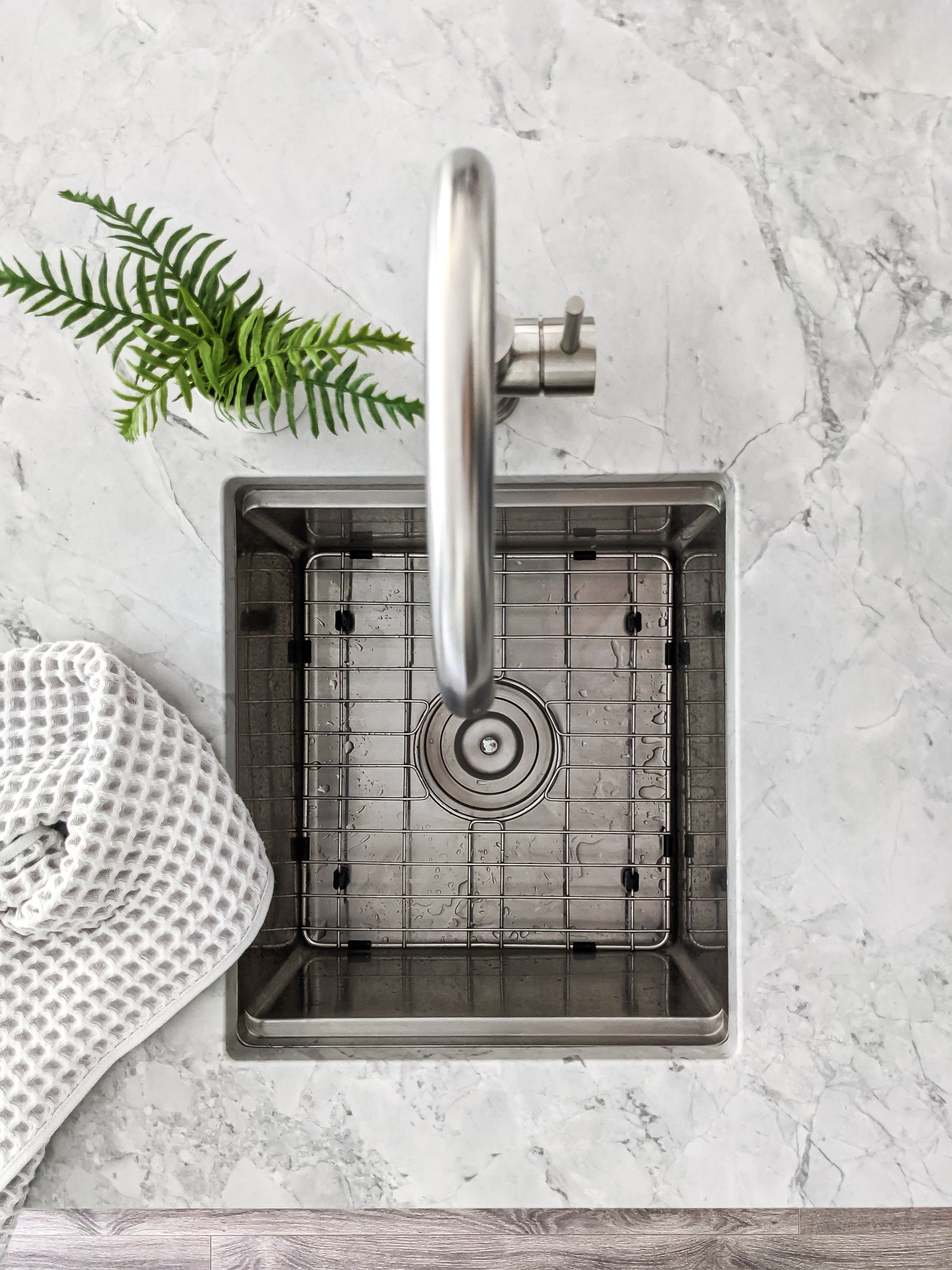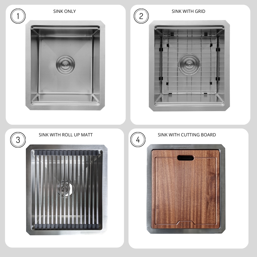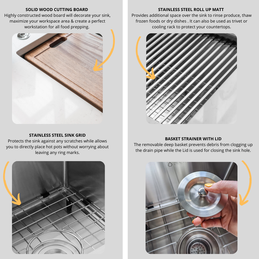 With its Compact Size and Multi-Purpose Design the ZH-1517 Sink is a Perfect Selection for Small Space Kitchens, RV Kitchens and Bar Areas! Constructed from High Grade 304 16G Stainless Steel Material this Sink is Resistant to Corrosion and Rust. The Outside of the Sink Contains Additional Sound Dampening Pads to Ensure Noise Protection Against Everyday Use. With its 10mm Curved Corners, Small Radius Sink Allows for Easy Cleaning Access While the X Groove is Designed for Easy Drainage Which Prevent Water Accumulation. Sink Includes a Beautiful Wood Cutting Board that can be used as a Workstation for all Food Prepping or used as a Lid to Cover the Sink to Create More Counter Space. This Sink is very Popular for Bar Areas as it Creates a Perfect Spot for Ice Placement to Keep your Drinks Cold. The Sink also Includes a Stainless Steel Grid that will Protect the Sink from any Scratches and allow you to Directly Place Hot Pots. Covered by our Limited Lifetime Warranty, your Satisfaction is Guaranteed.