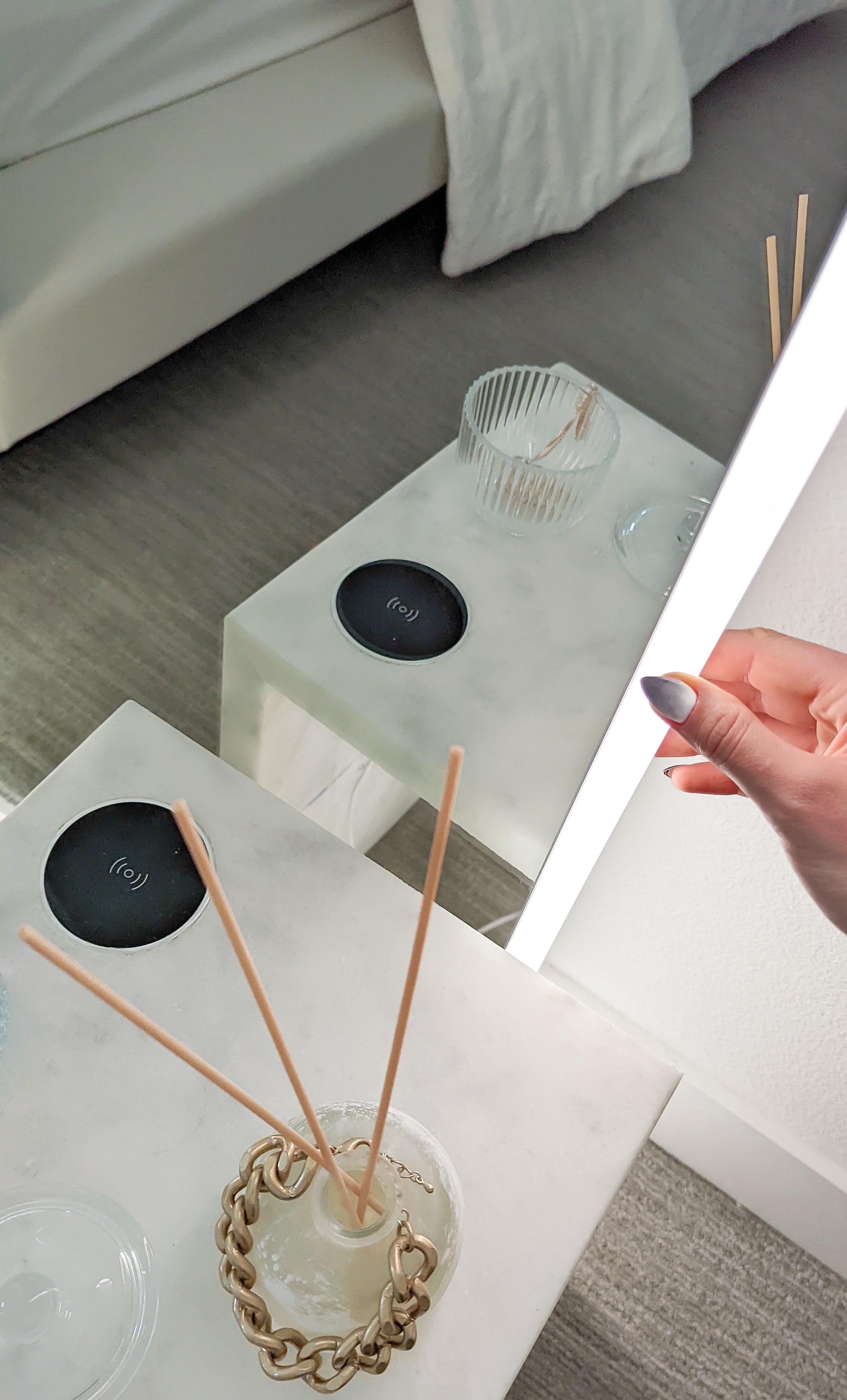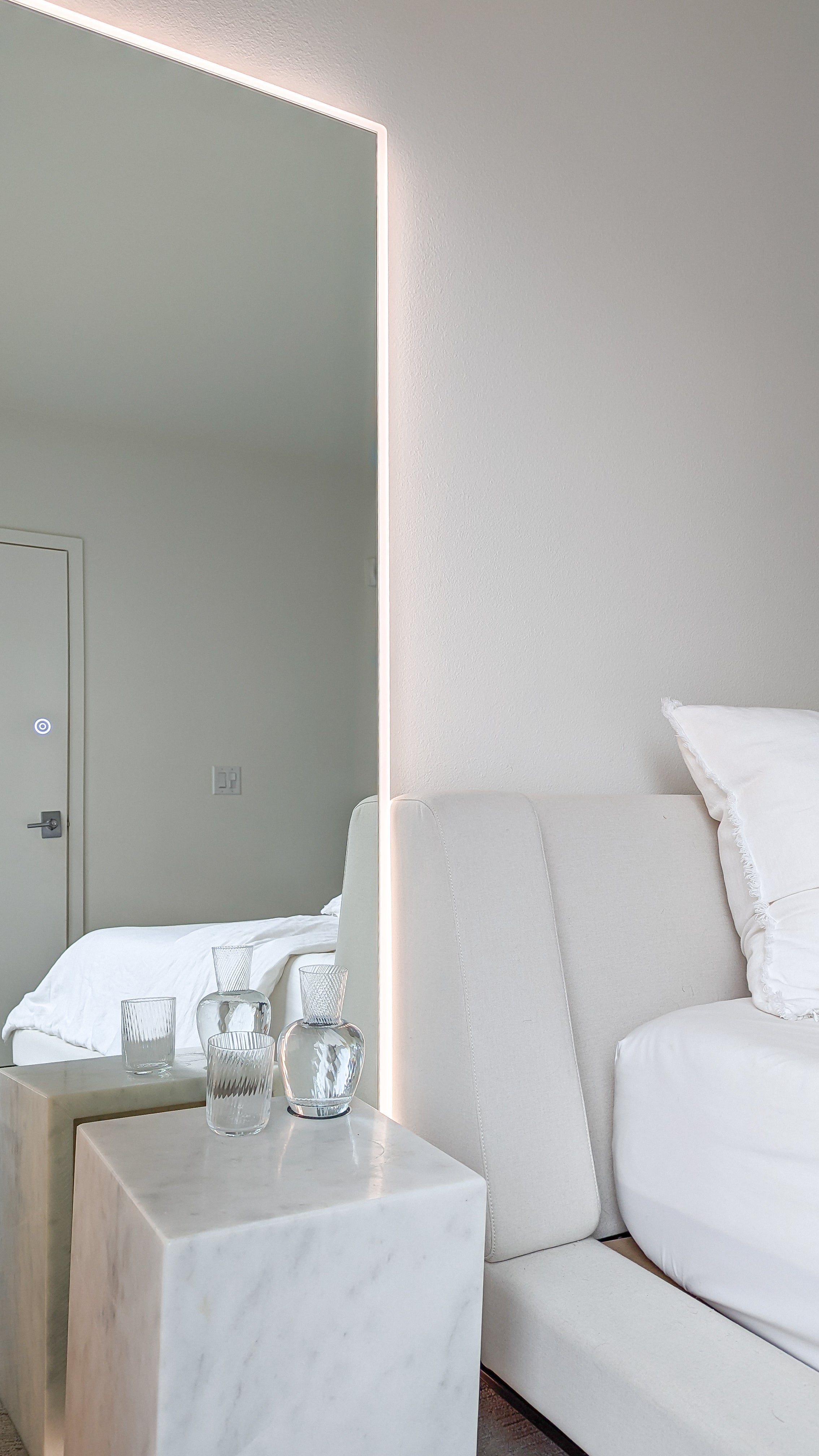 A LED mirror inside a bedroom can be a stylish and practical addition to the space. They can provide additional lighting in the room and can be especially useful for tasks such as applying makeup or grooming.