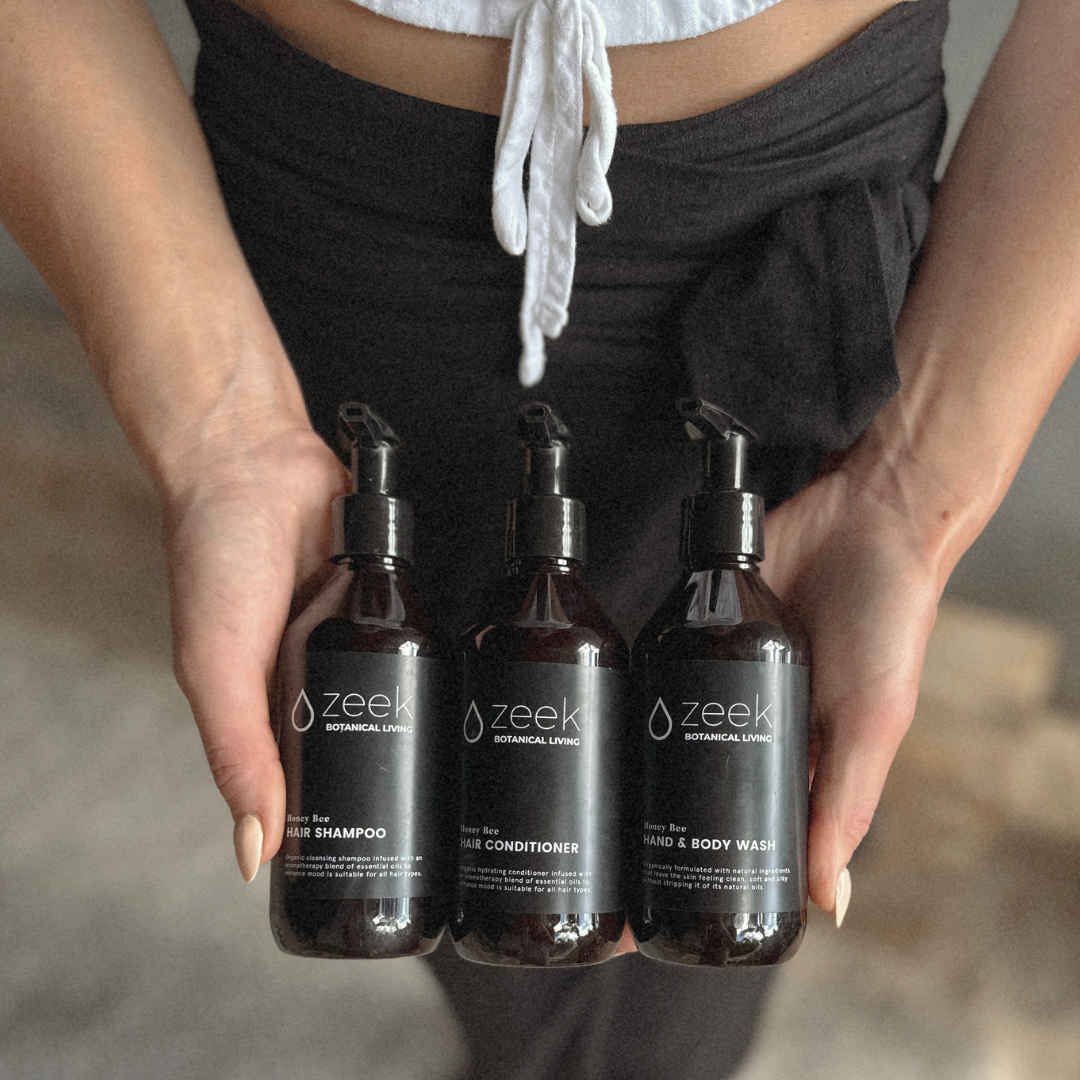 DIRECTIONS: After shampooing with Zeek Honey Shampoo, apply a small amount of conditioner to your hair, focusing on the lengths and ends, leave it on for a few minutes, then rinse thoroughly